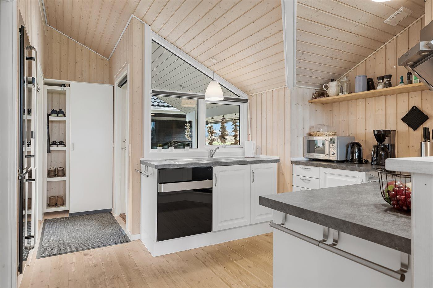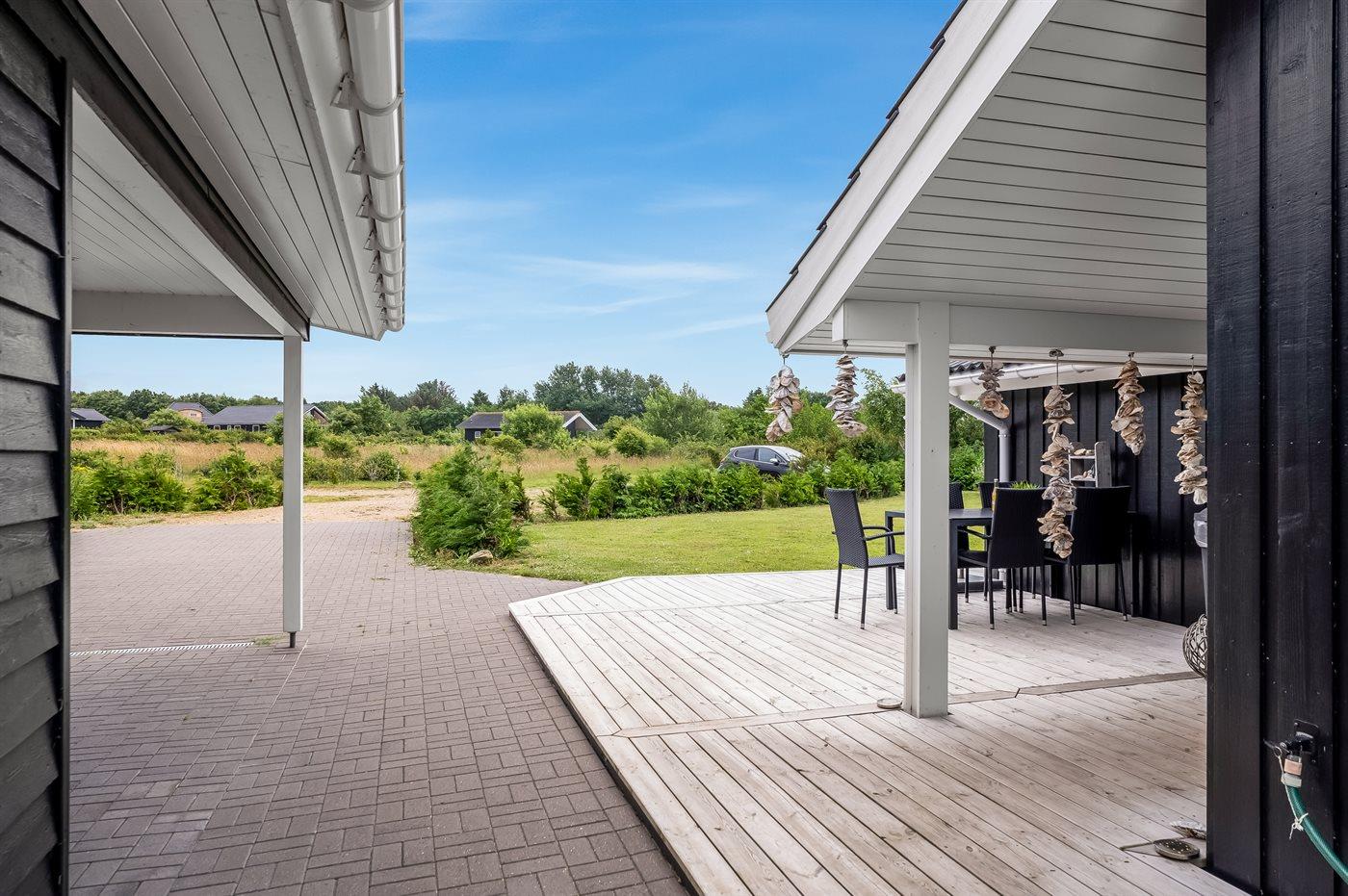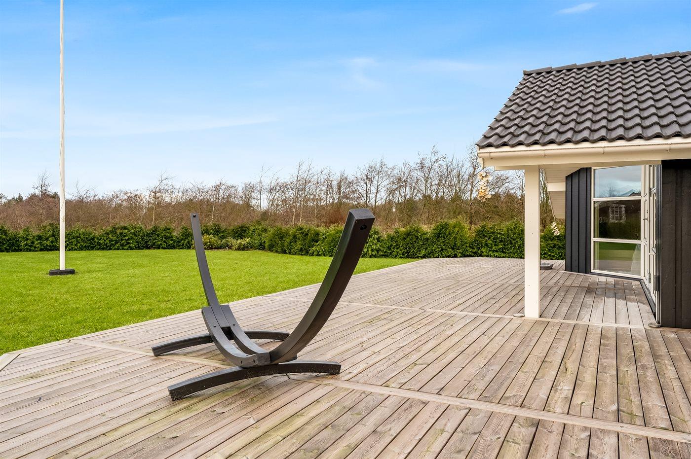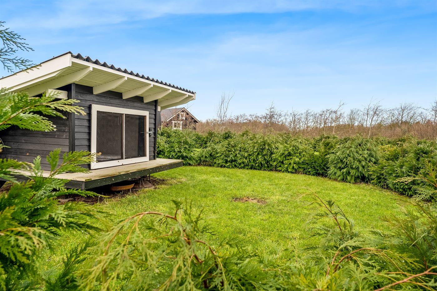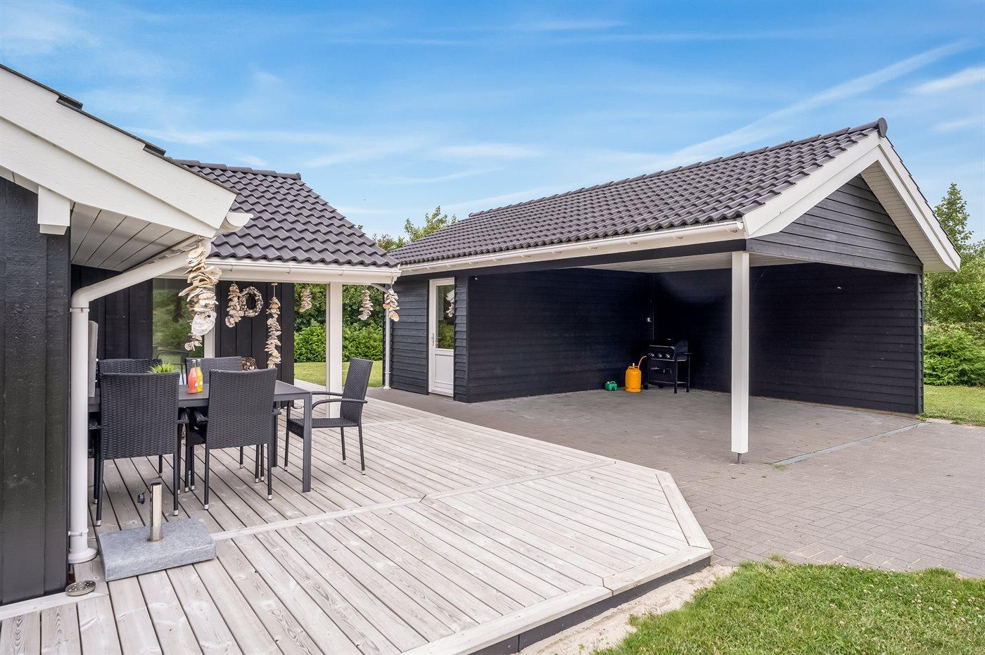 De vakantiewoning is gelegen op een 2606 m² groot aangelegde tuin. Afstand tot de fjord 500 m. Dichtstbijzijnde winkel 3800 m. Bij de vakantiewoning hoort terras. Daarnaast is er een overdekt terras. Gereedschapsruimte. Trampoline.Vuurplaats. Barbecue.Garage ter beschikking. Parkeerplaats bij het huis.