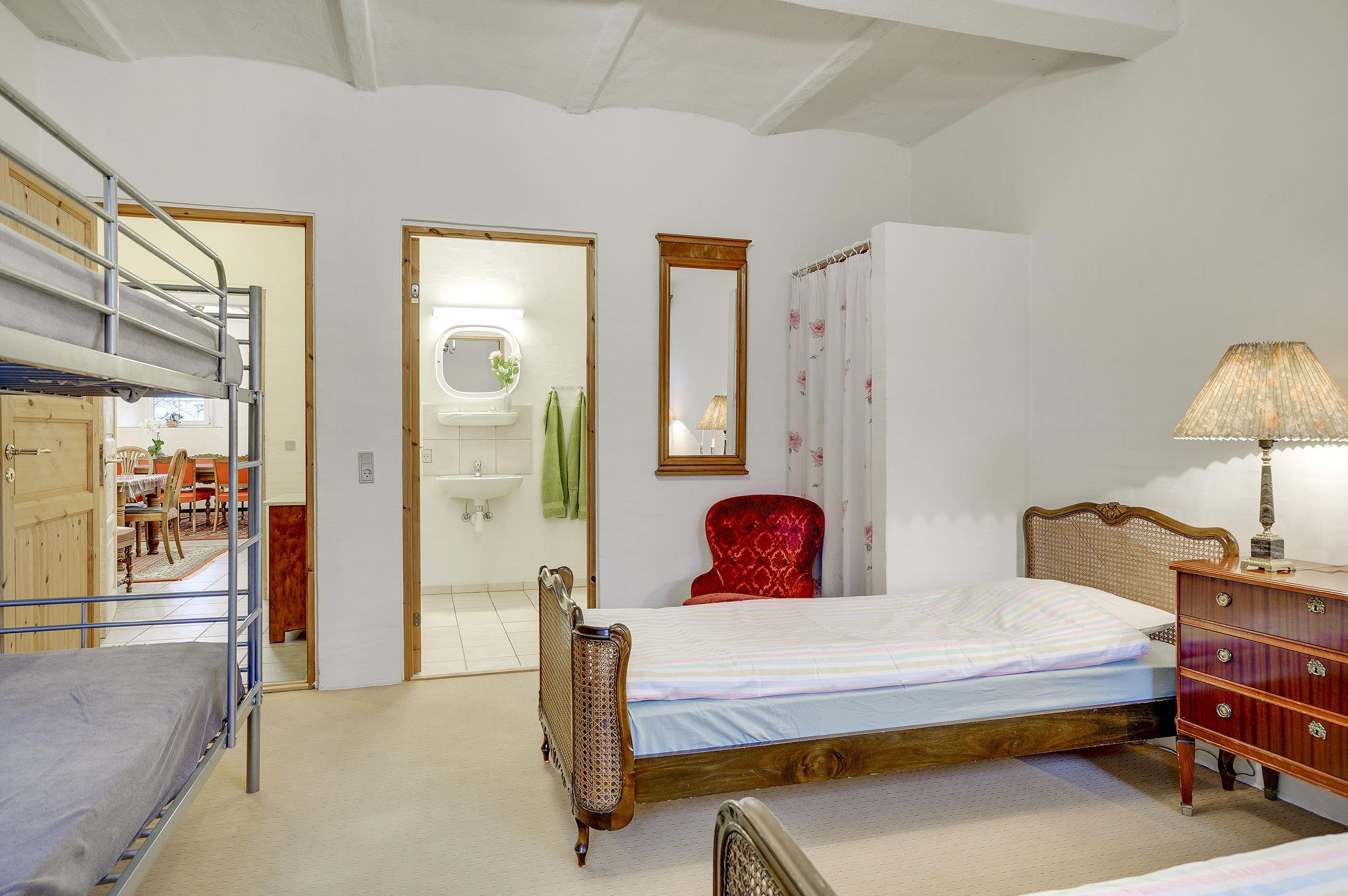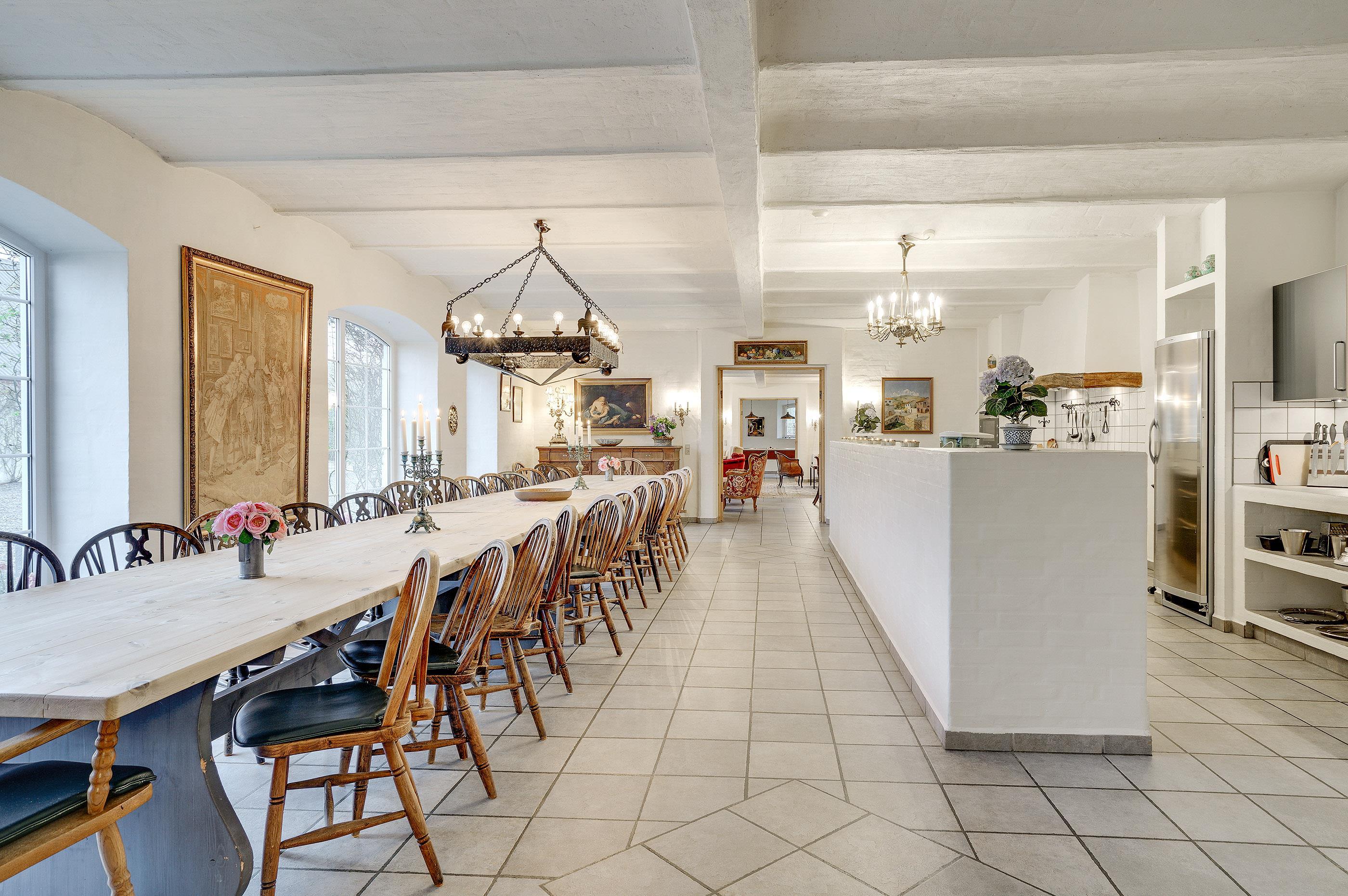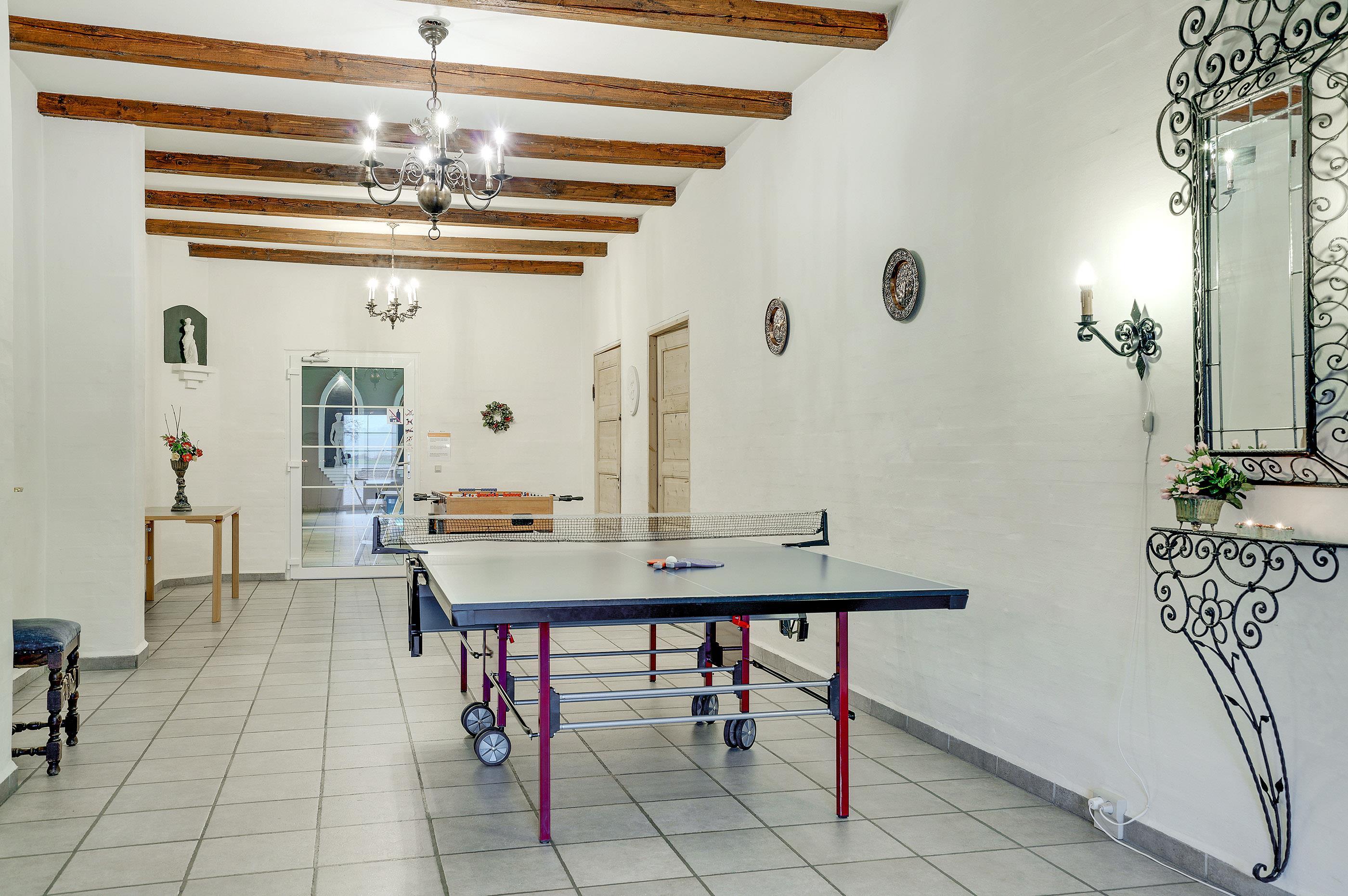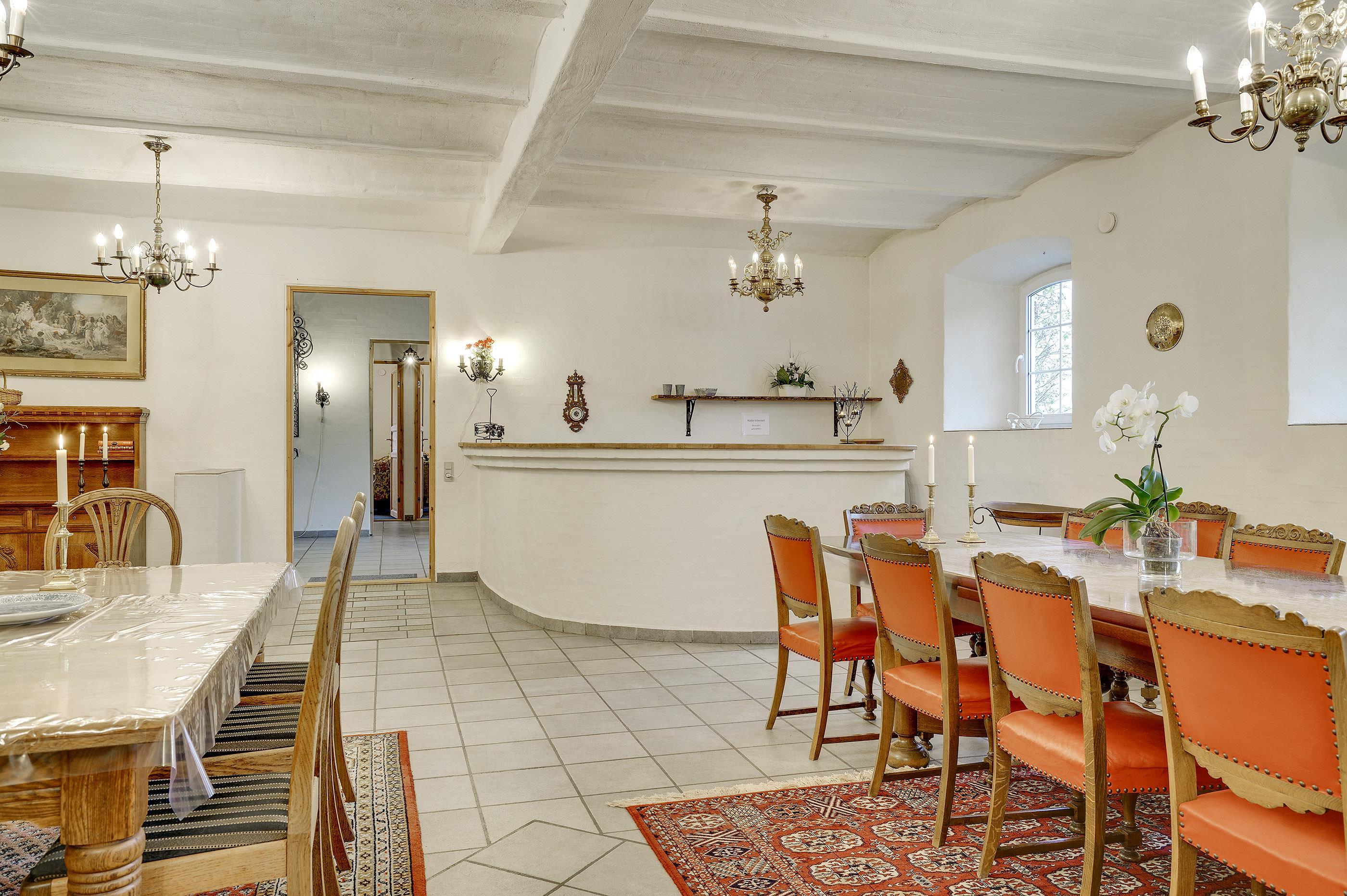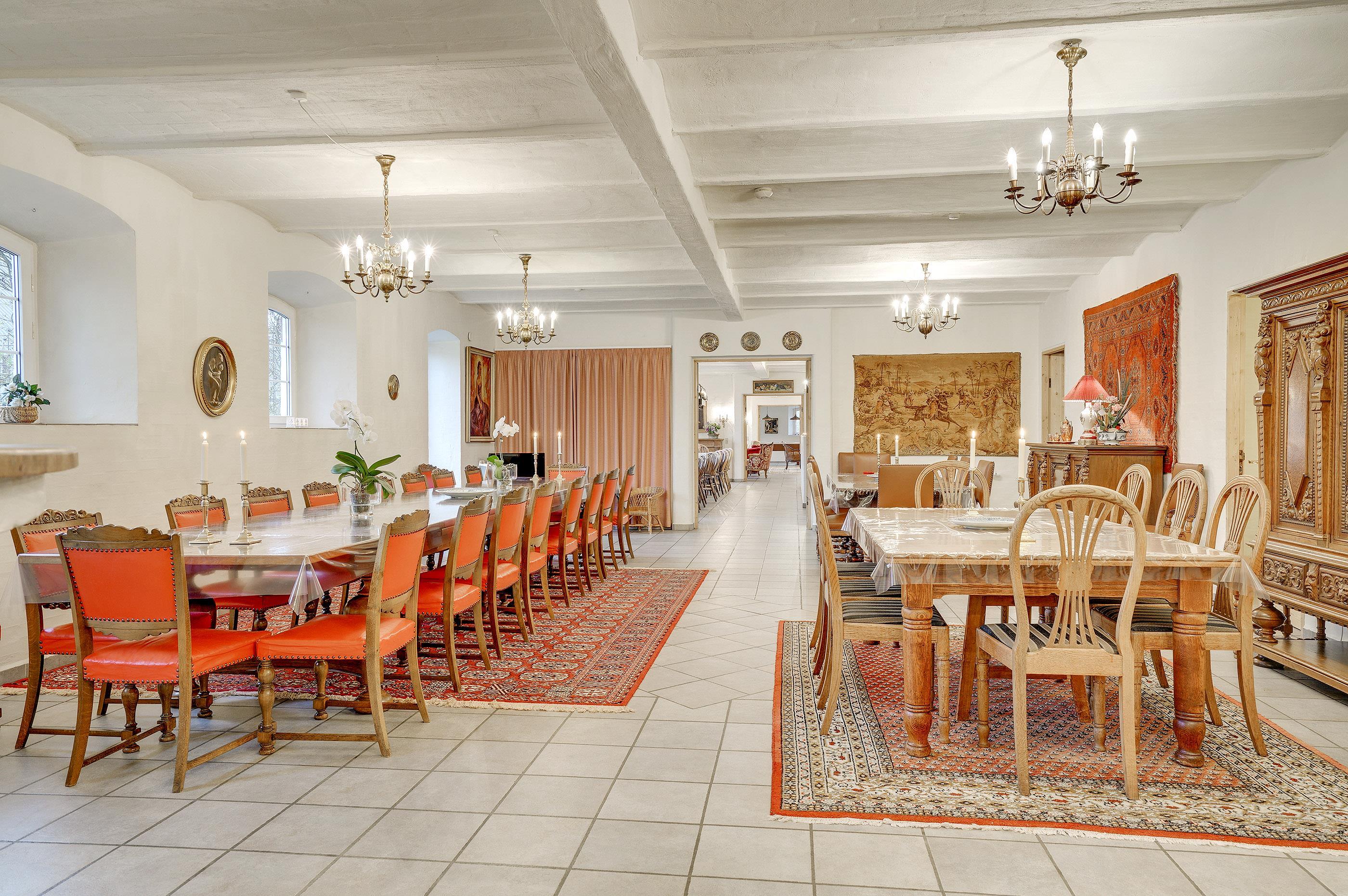 Hesthave has 10 bathrooms with a shower and underfloor heating and 2 separate toilets. There is a total of 12 bedrooms – 12 double beds and 6 bunkbeds. Additionally, there is an annex with 5 bedrooms with a total of 10 extra beds, which can be rented for a few nights, a party room and a sports hall. Please note that guests under 16 are not allowed in the main building, and only bookings with the purpose of holidays are accepted. The party room can have 80-100 persons and has to be rented separately. Please contact us for further information +45 6441 2622.