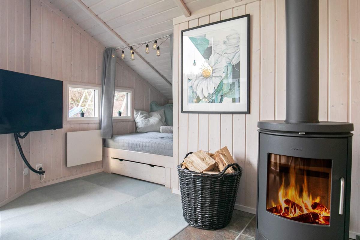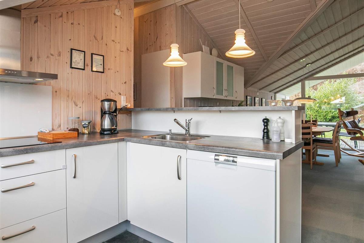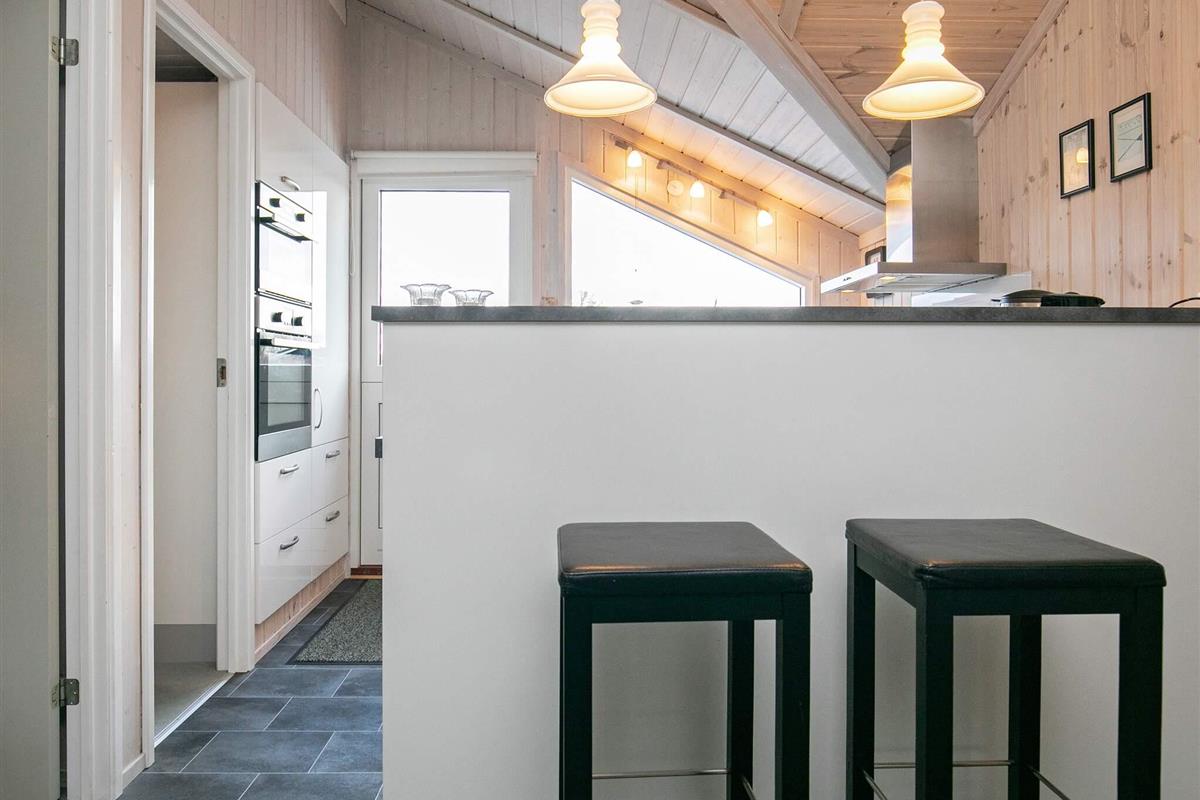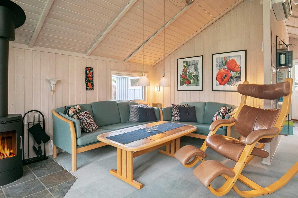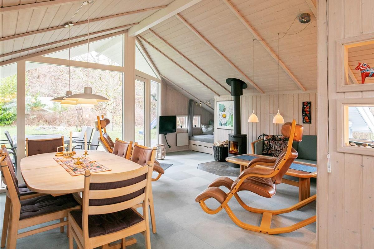 Innen erwartet Sie ein offener Küchen-/Wohnbereich, inklusive Essecke und Holzofen, ausgestattet mit gutem Mobiliar von bester dänischer Qualität. Umfassendes Kücheninventar mit u.a. Induktionsherd und eingebautem Badkofen sowie Geschirrspüler.