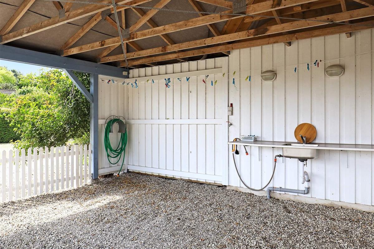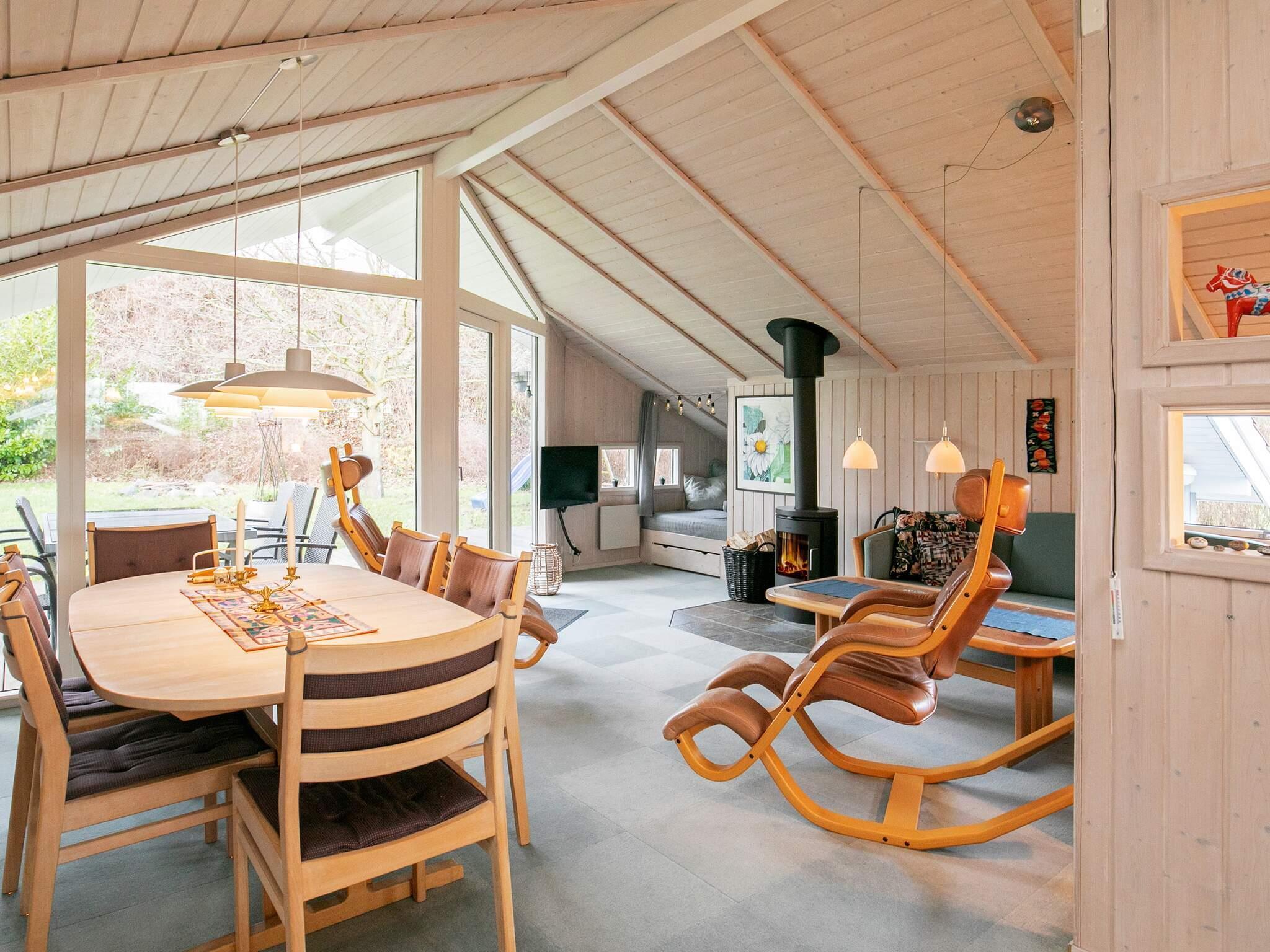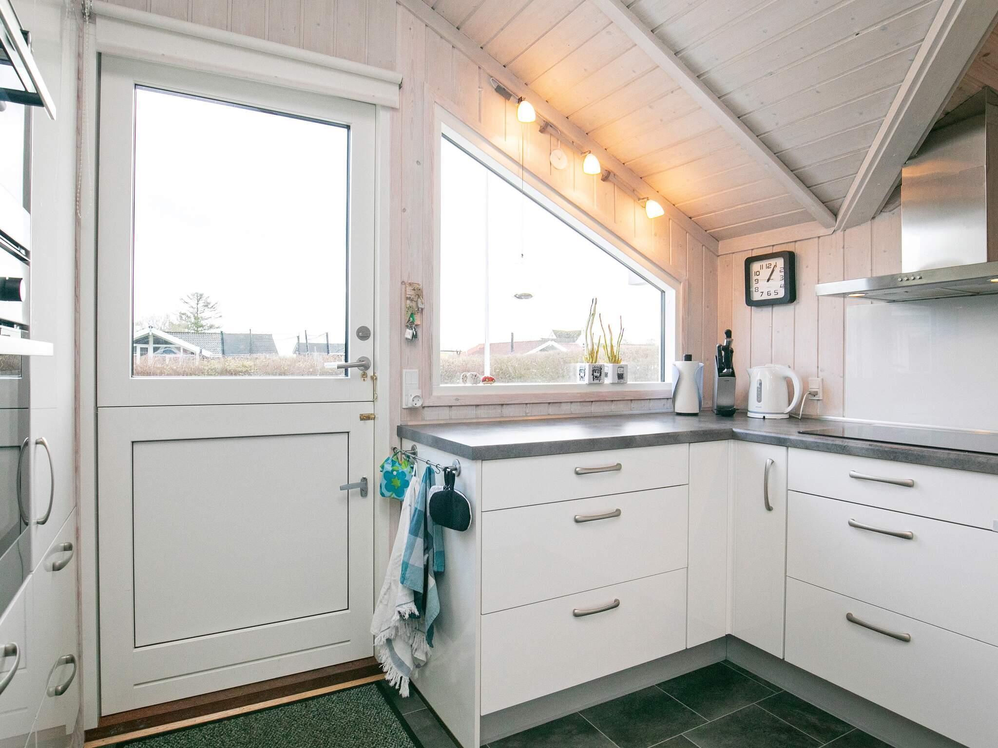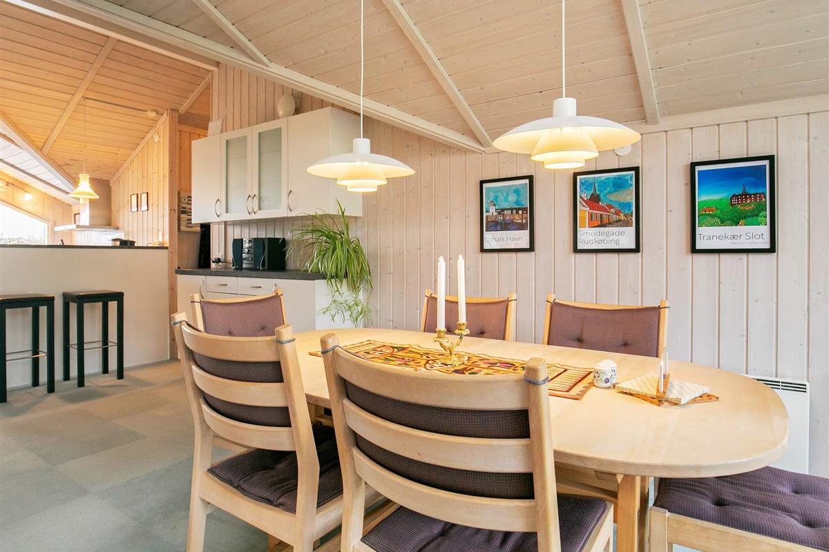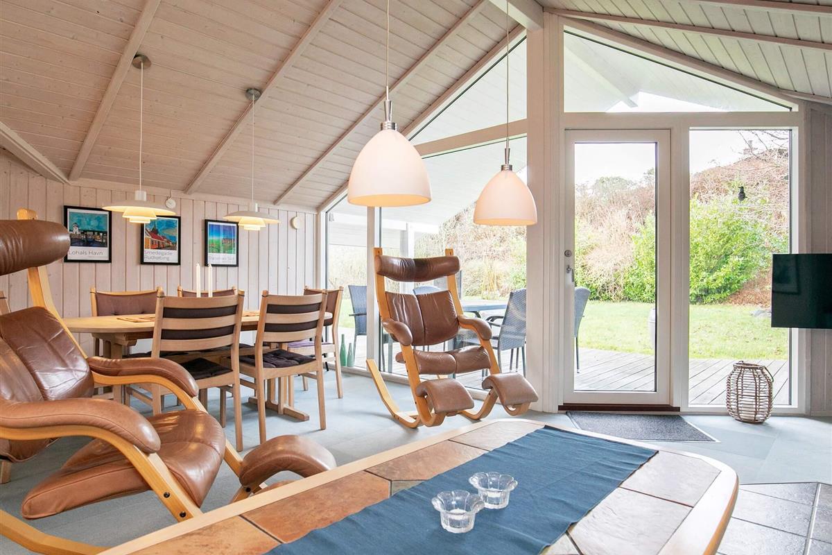 Innen erwartet Sie ein offener Küchen-/Wohnbereich, inklusive Essecke und Holzofen, ausgestattet mit gutem Mobiliar von bester dänischer Qualität. Umfassendes Kücheninventar mit u.a. Induktionsherd und eingebautem Badkofen sowie Geschirrspüler.