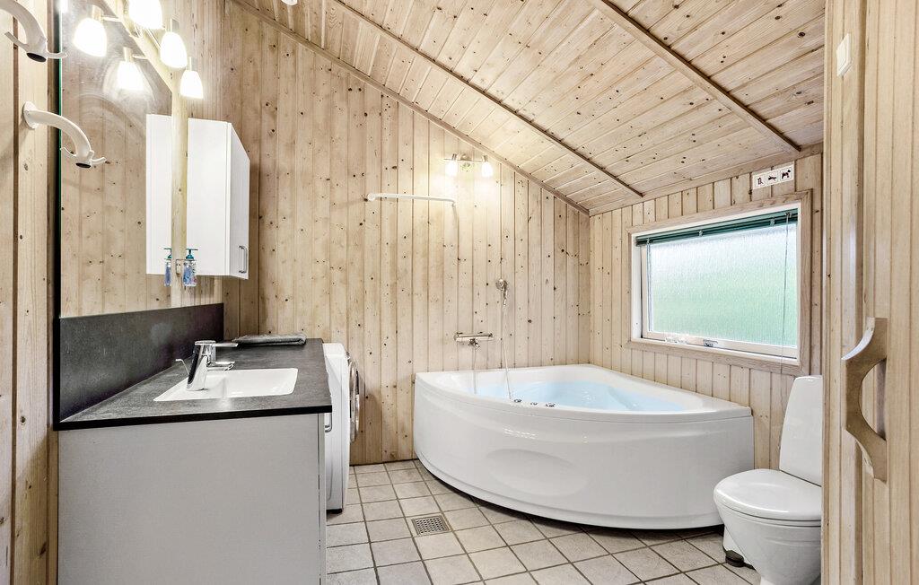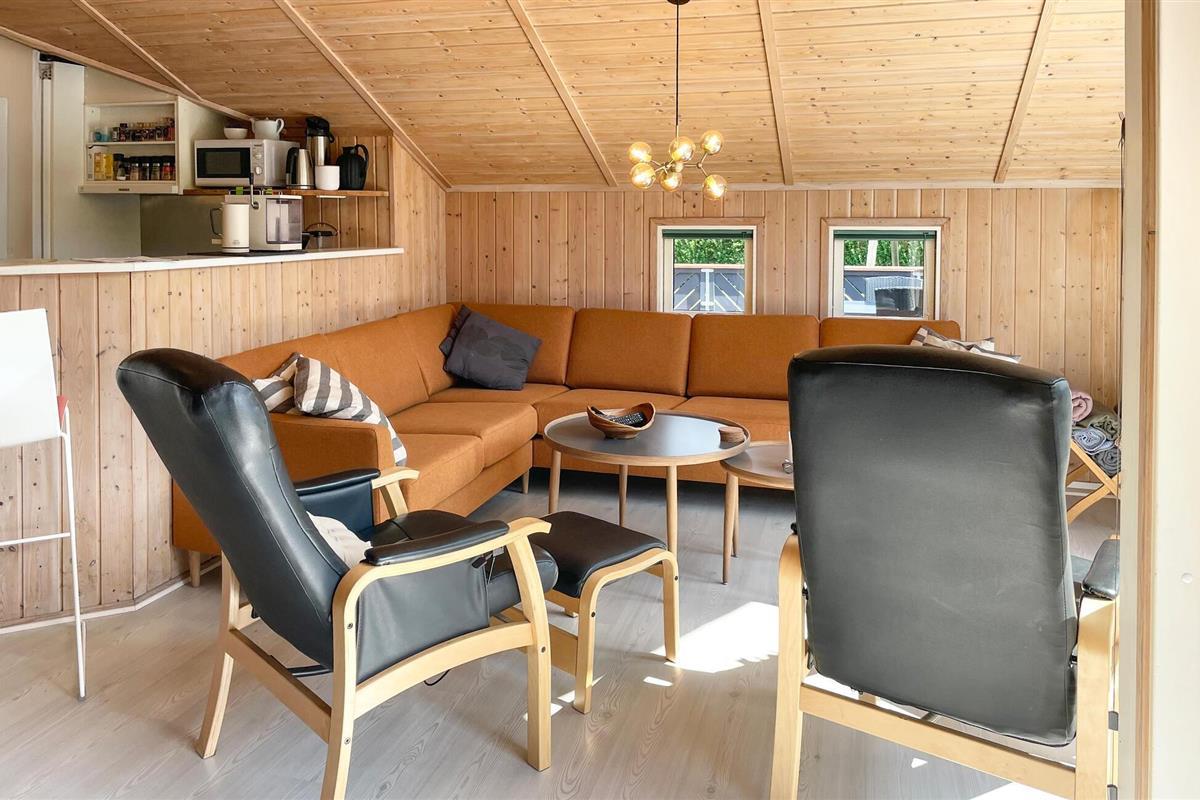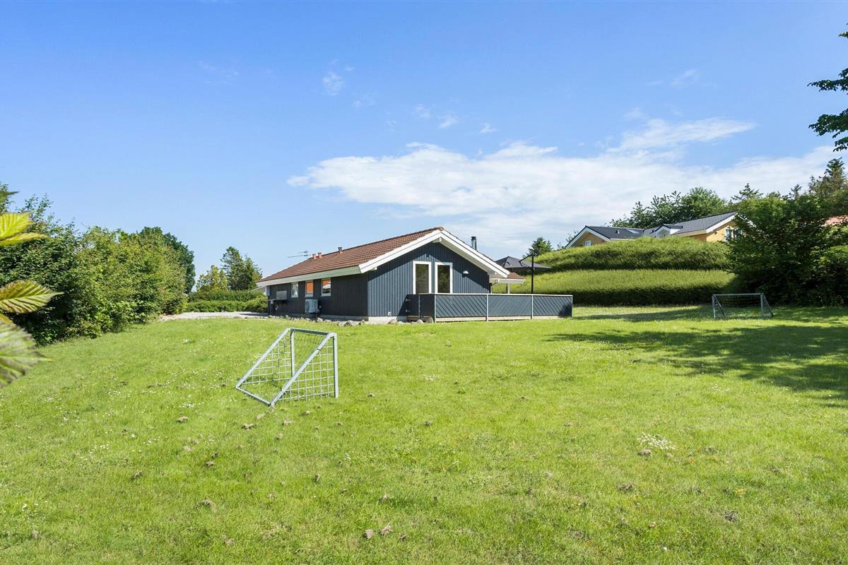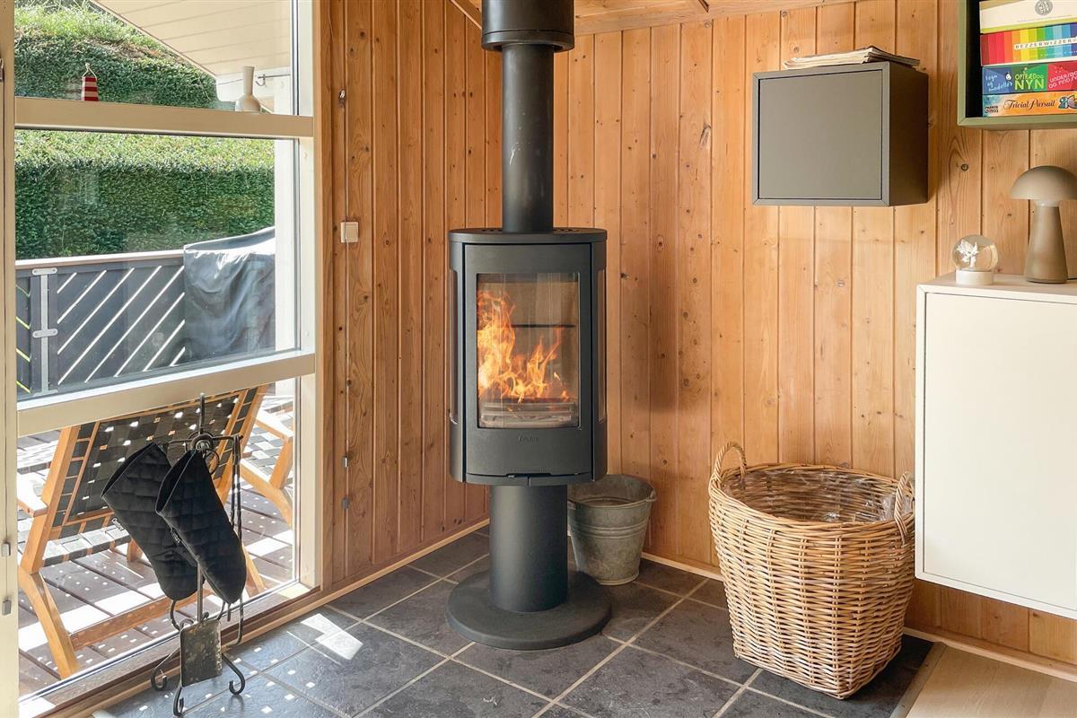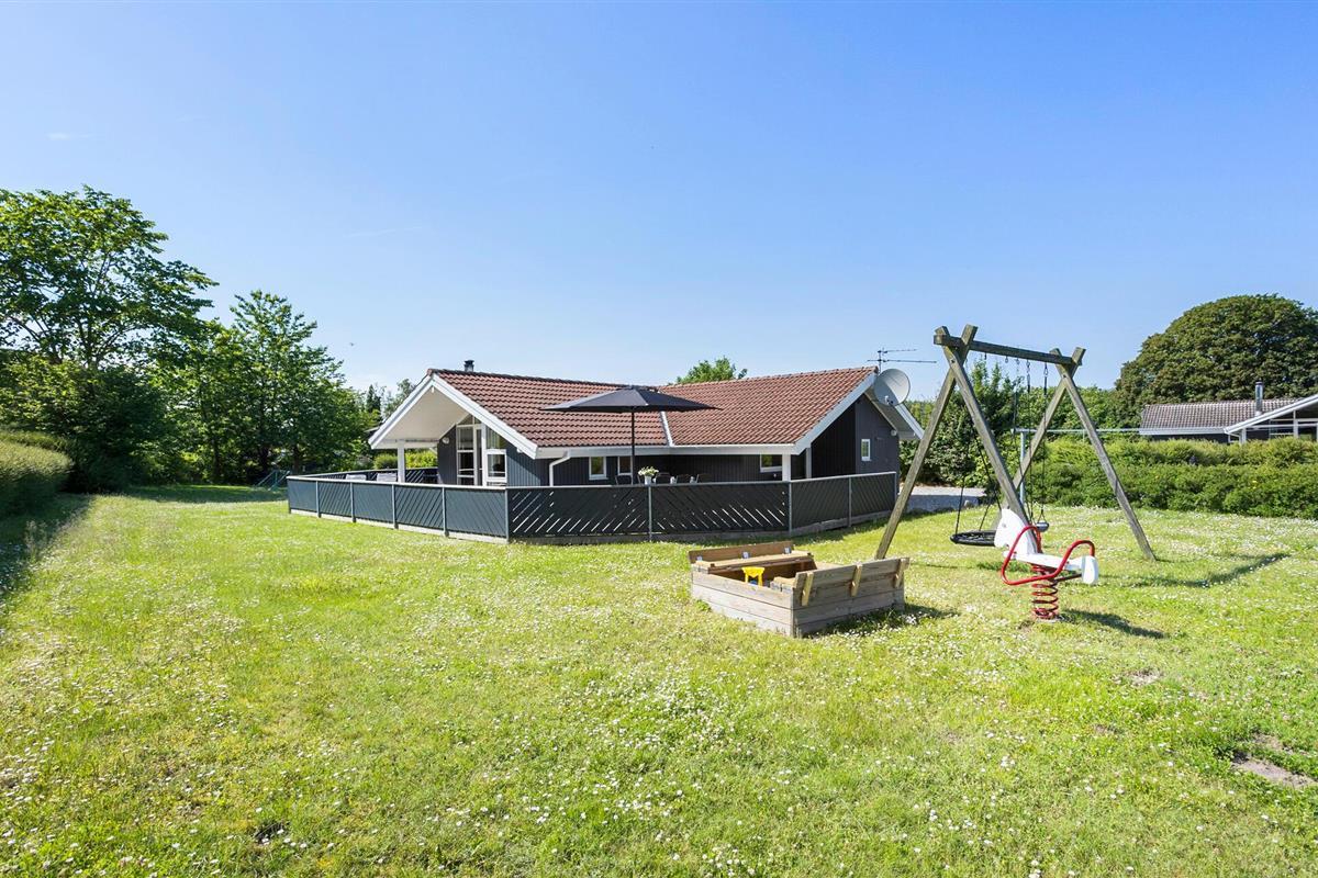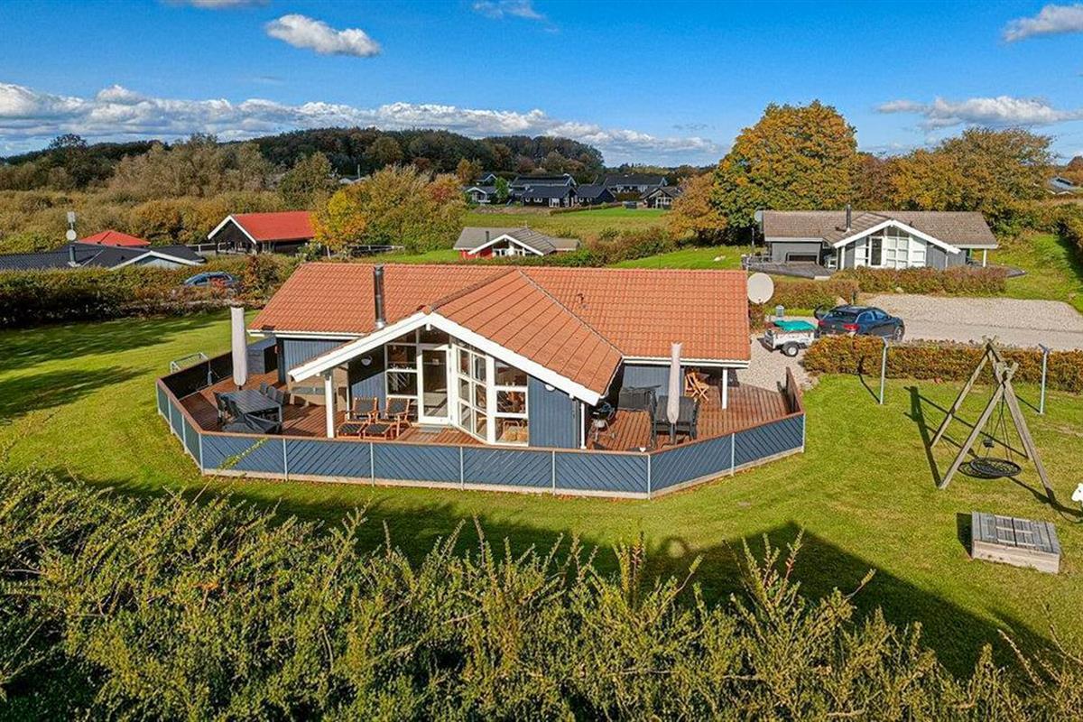 Comfortabel houten vakantiehuis met whirlpool, houtkachel en speelplaats nabij zee en natuur in Spodsbjerg.