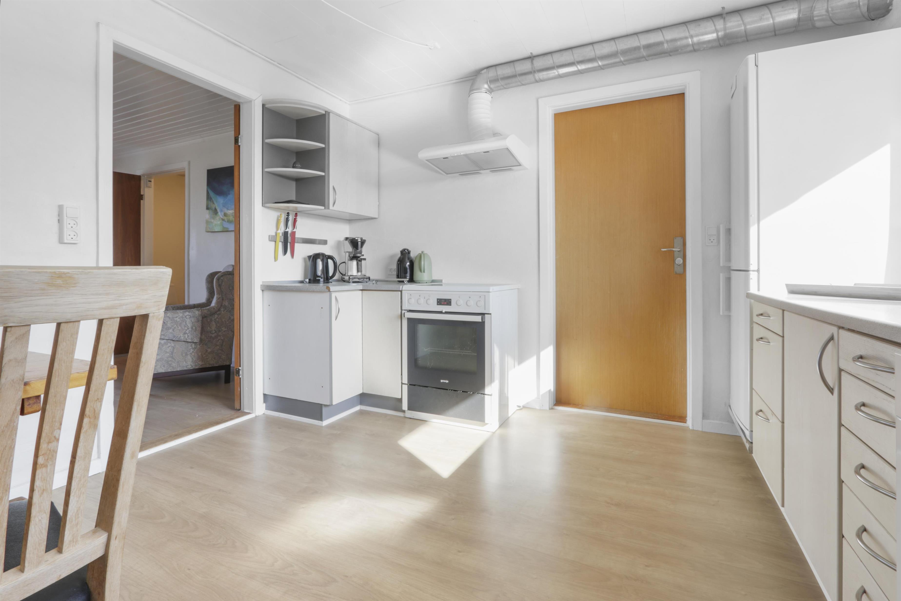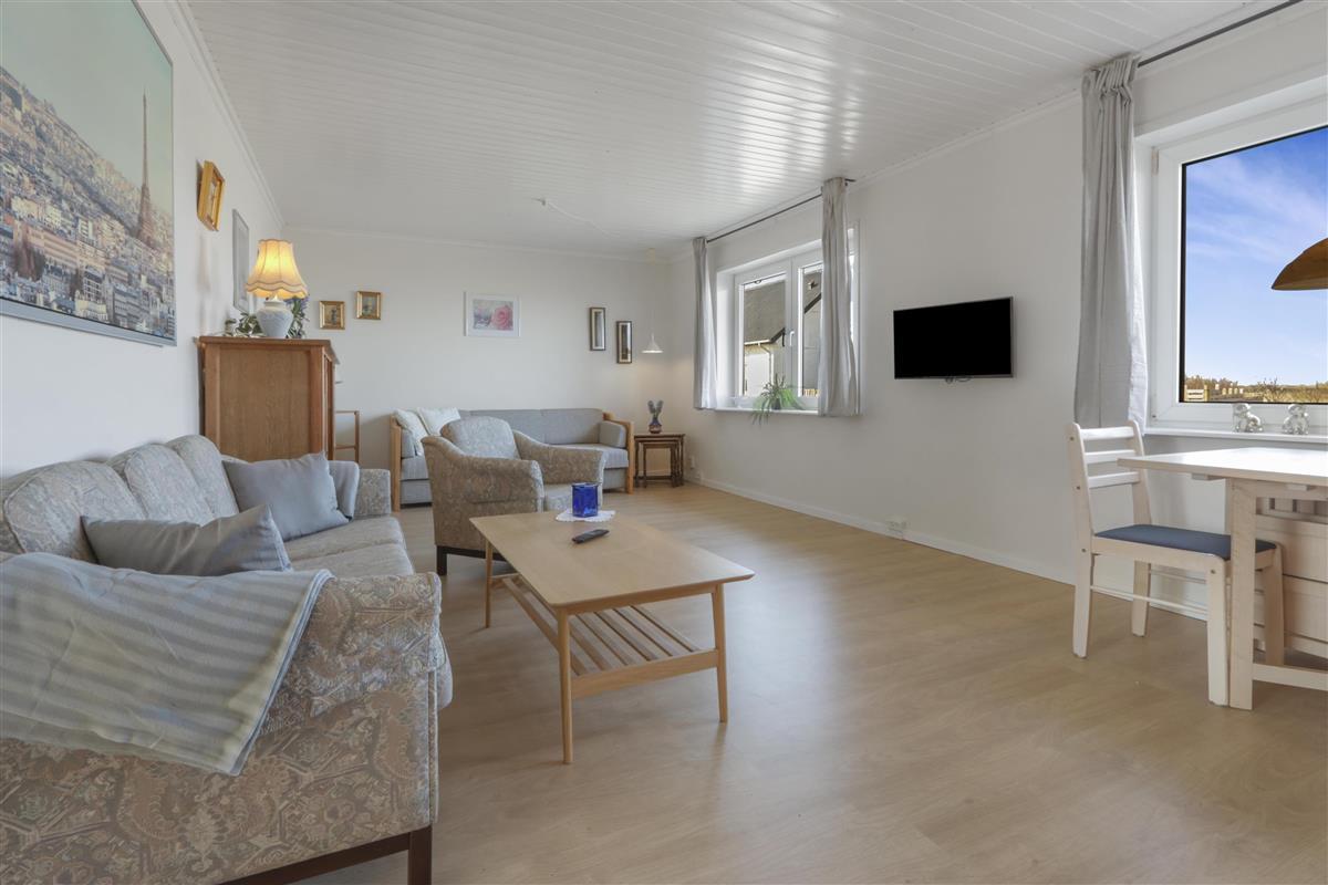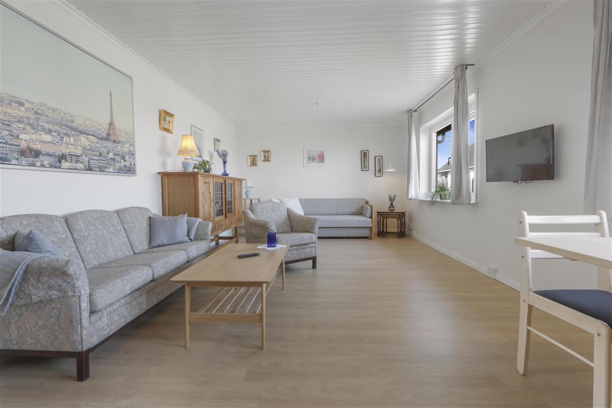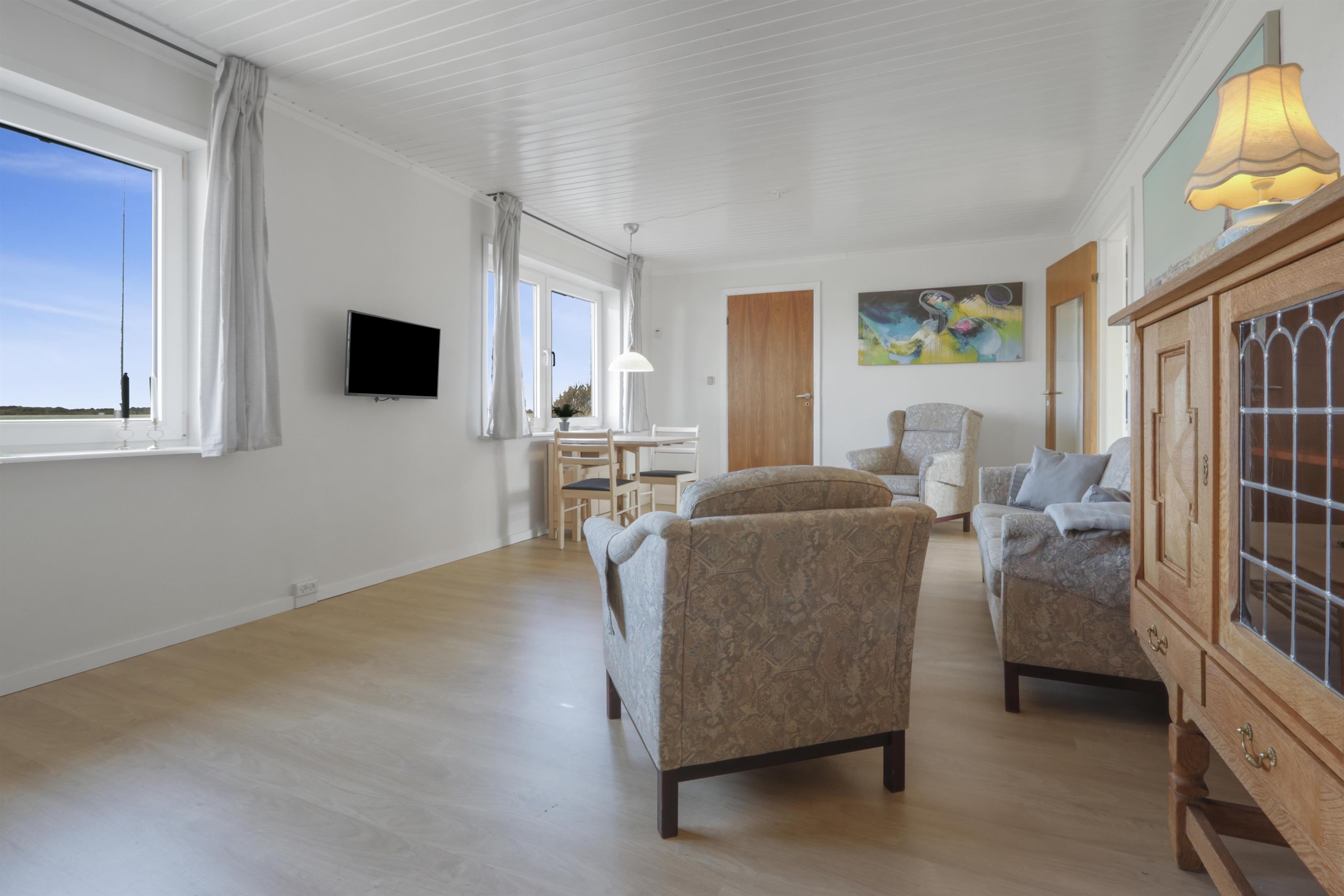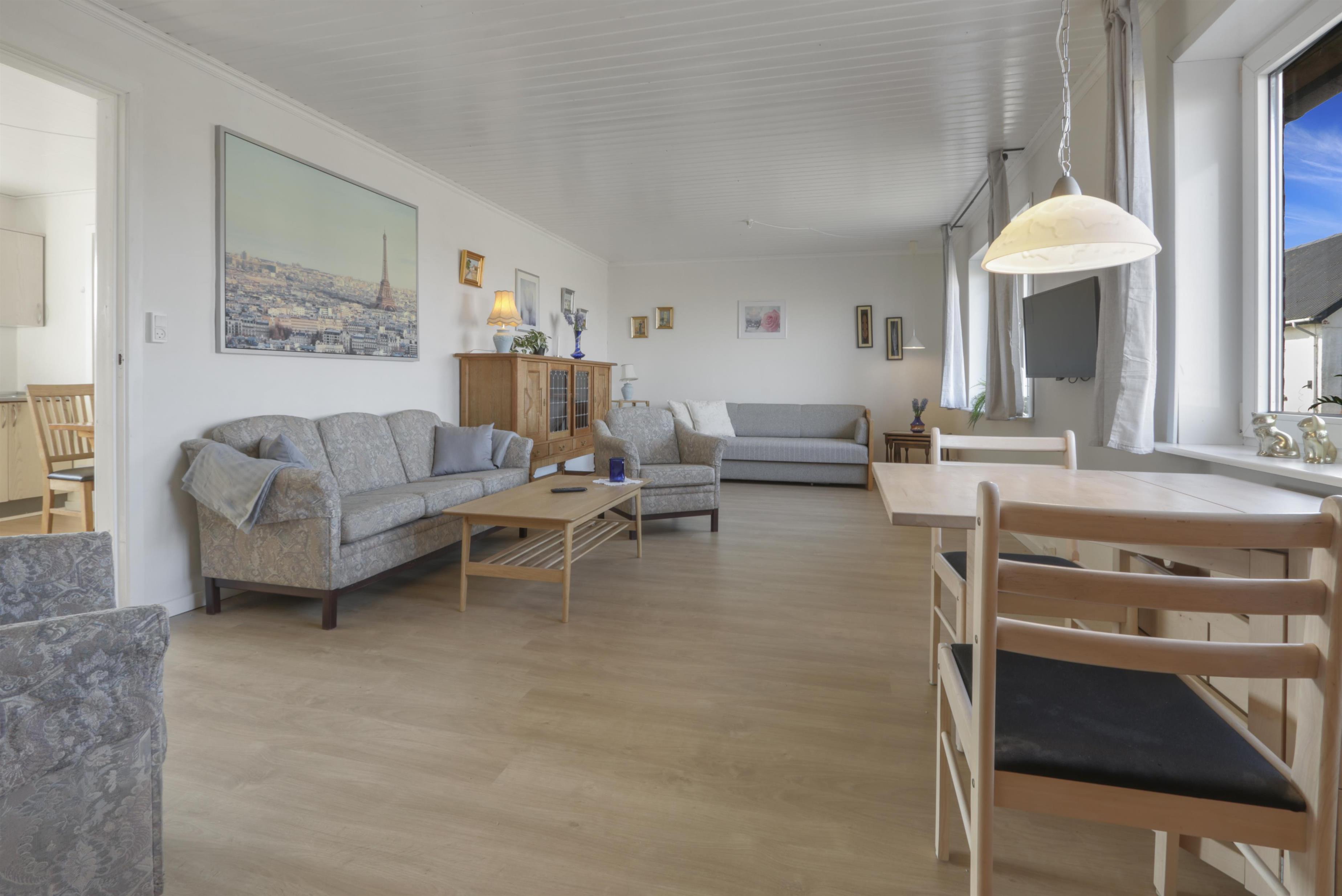 Die Wohnung ist schlicht und praktisch eingerichtet. Küche mit Essbereich, Glaskeramik-Kochfeld, Dunstabzugshaube, Geschirrspüler und Kühlschrank mit Gefrierfach. Von der Küche aus gibt es Zugang zu einem großen Schlafzimmer (1 Doppelbett). Wohnzimmer mit TV (deutsche und dänische Sender) und Schlafsofa (für 2 Personen). Renoviertes Badezimmer mit WC, Waschbecken, Dusche, Waschmaschine und Fliessenboden. Die gesamte Wohnung wird durch eine neue und nachhaltige Luft-Wasser-Wärmepumpe beheizt.