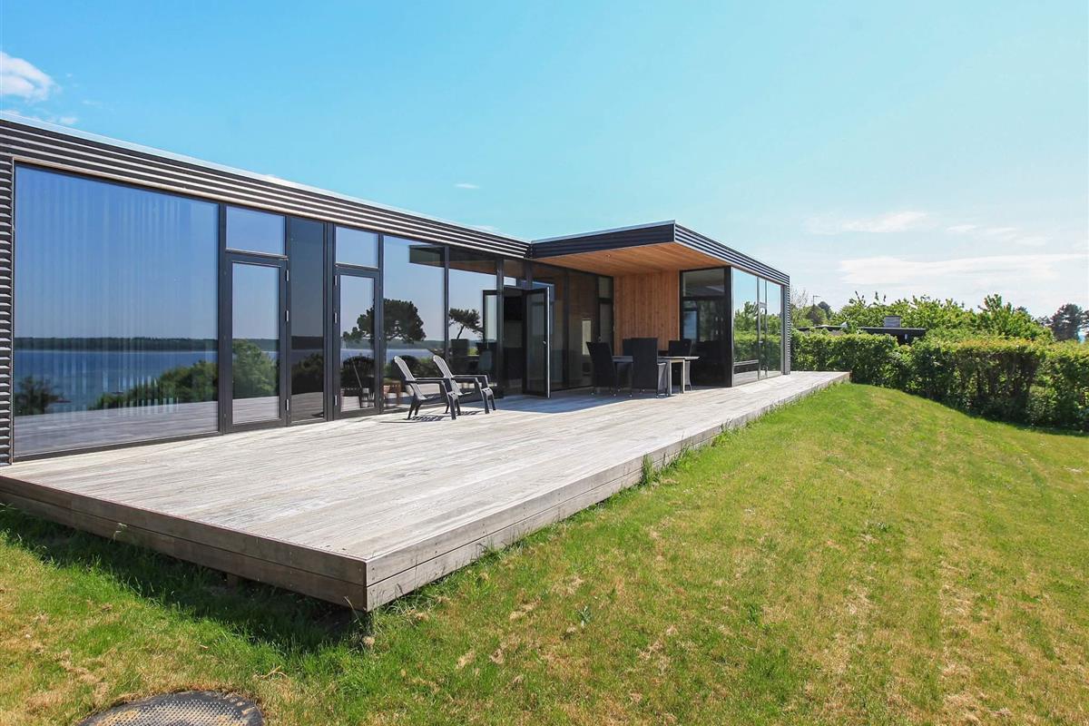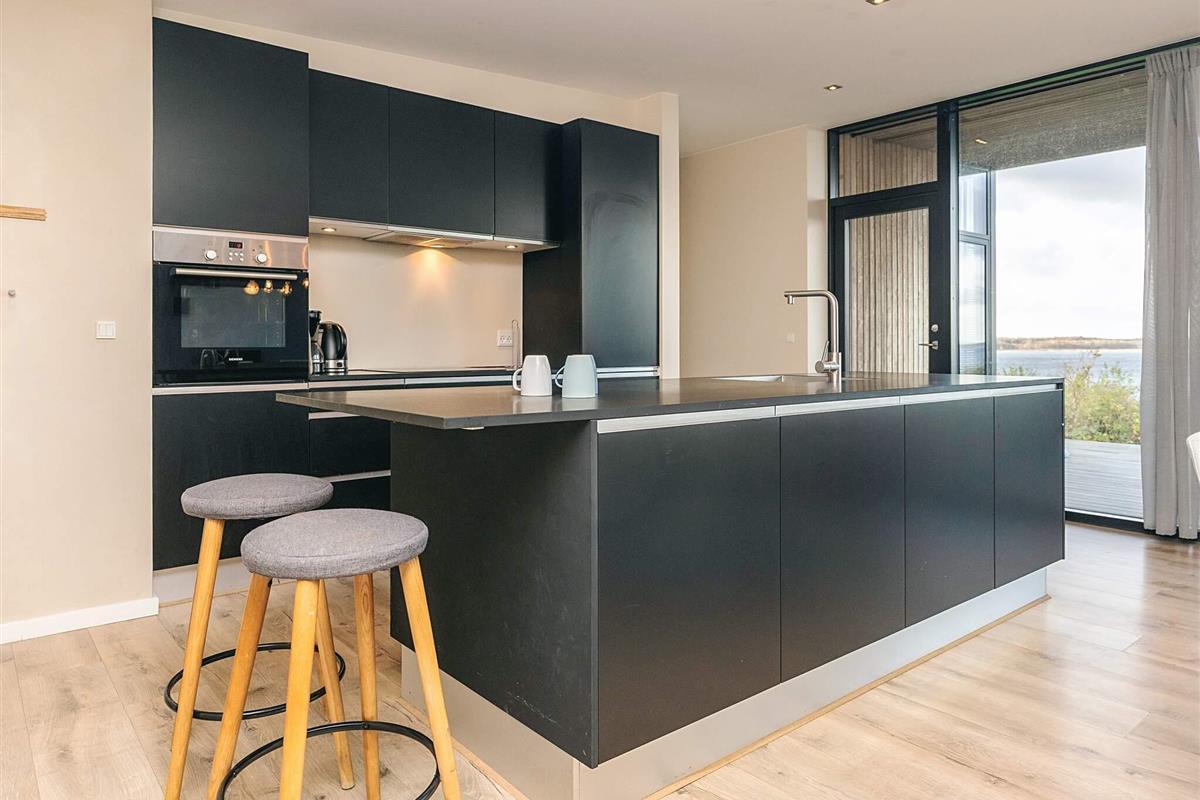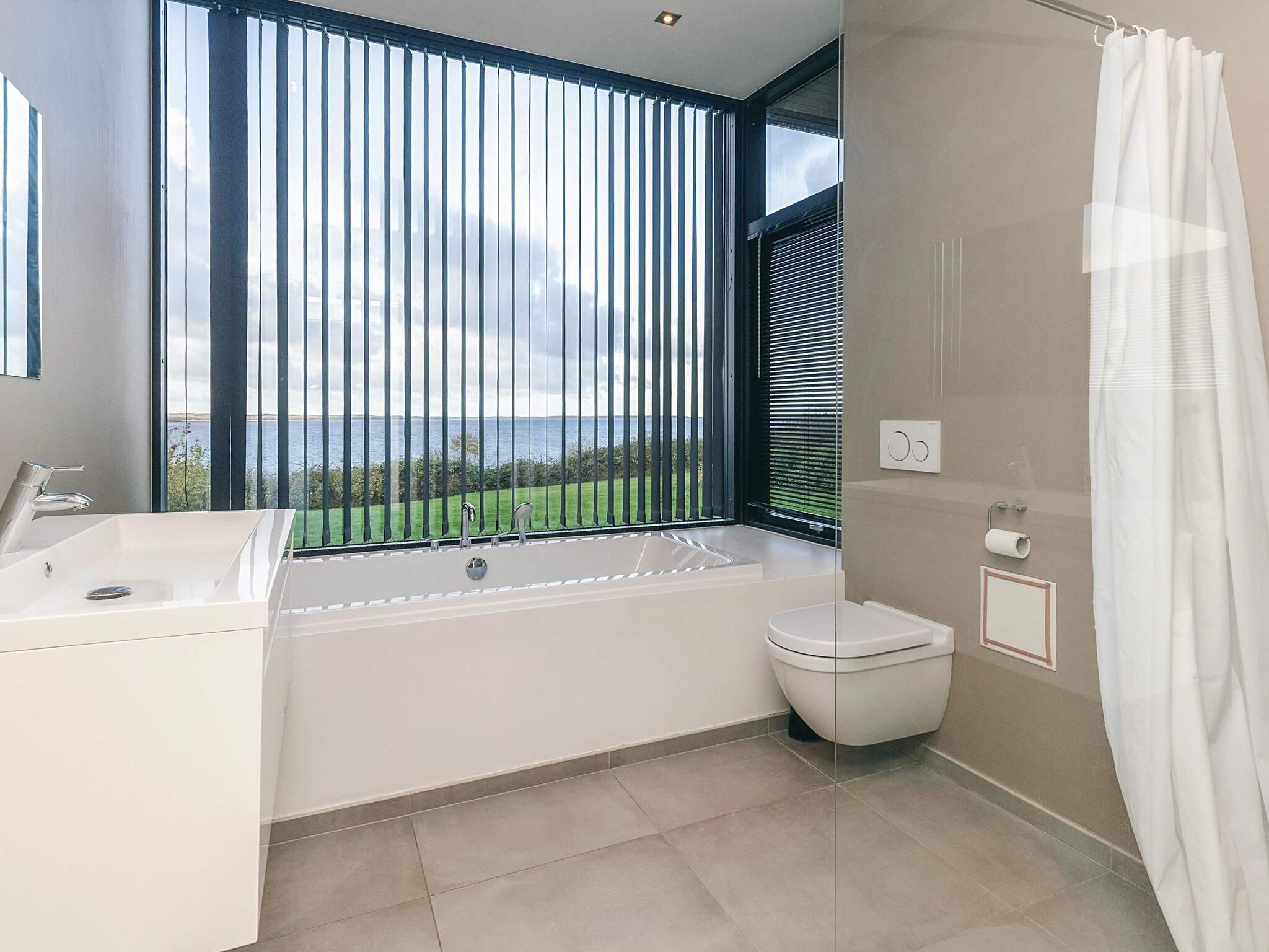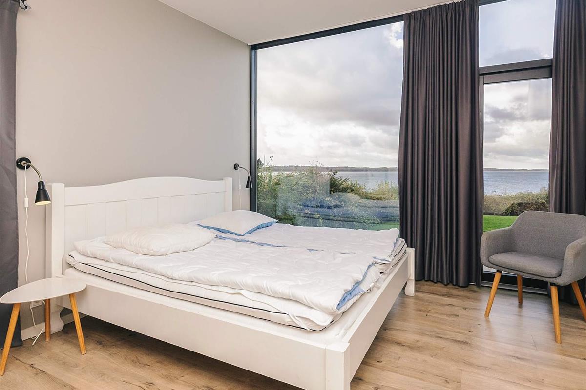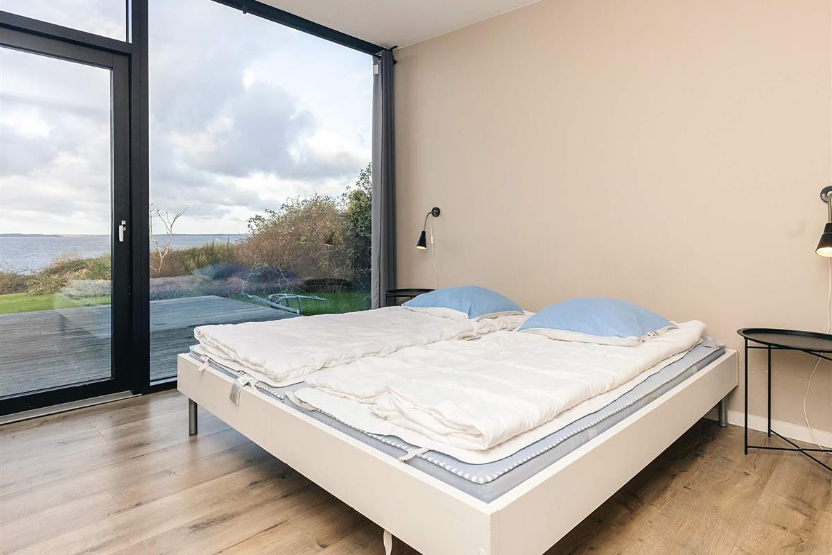 Die Raumverteilung eignet sich mit den zwei Schlafbereichen mit jeweils zugehörigem Bad auch gut für zwei befreundete Familien oder Generationen. Die Liege in einem der Zimmer ist 170 cm lang. In der Mitte befindet sich der geräumige Küchen-/Wohnbereich für die gemeinsamen Stunden. Die großen Fenster lassen viel Tageslicht ins Haus und bieten zusammen mit der erhöhten Lage eine schöne Panoramaaussicht über das Wasser im Fjord und zur Halbinsel Hornsherred.