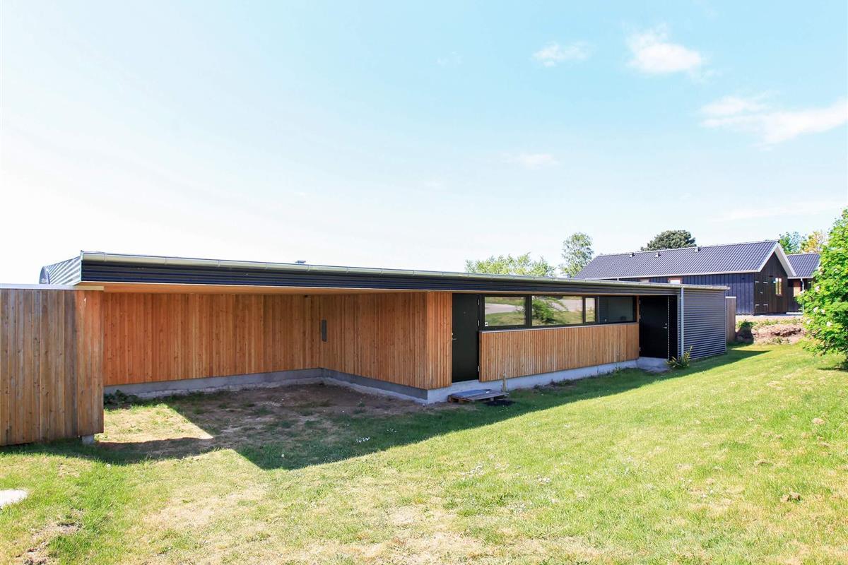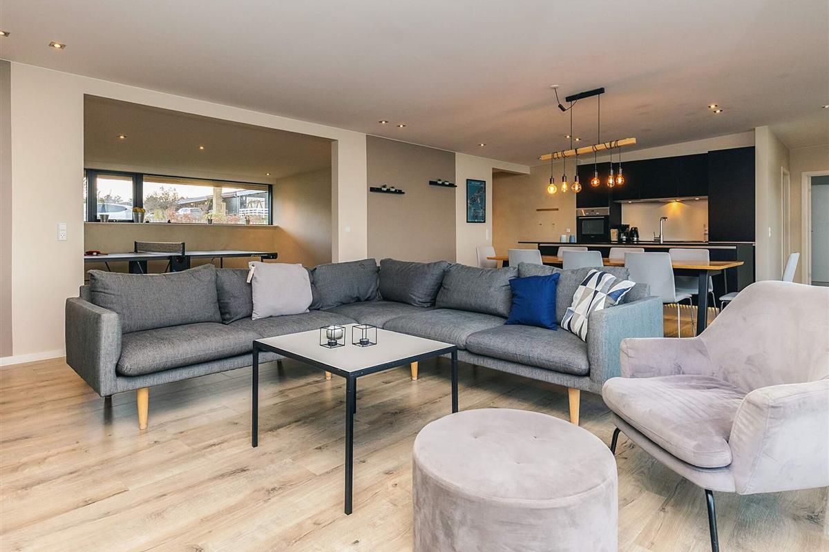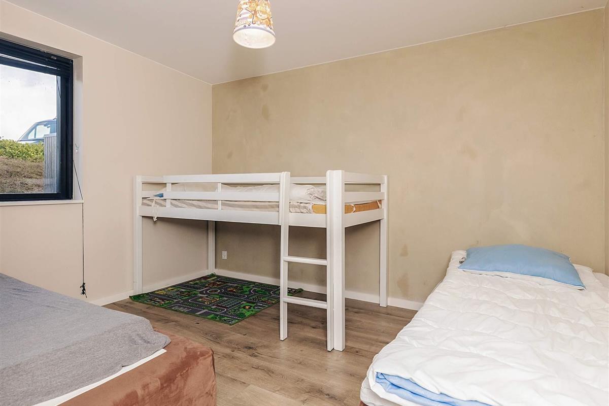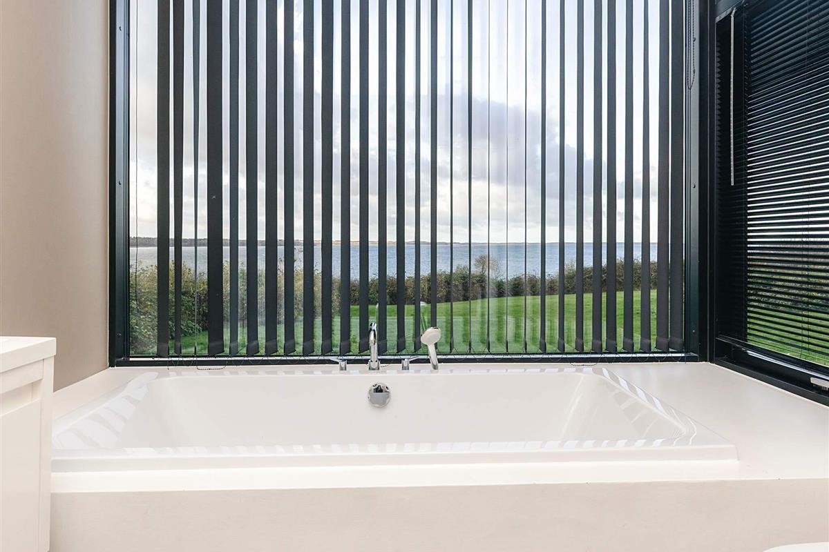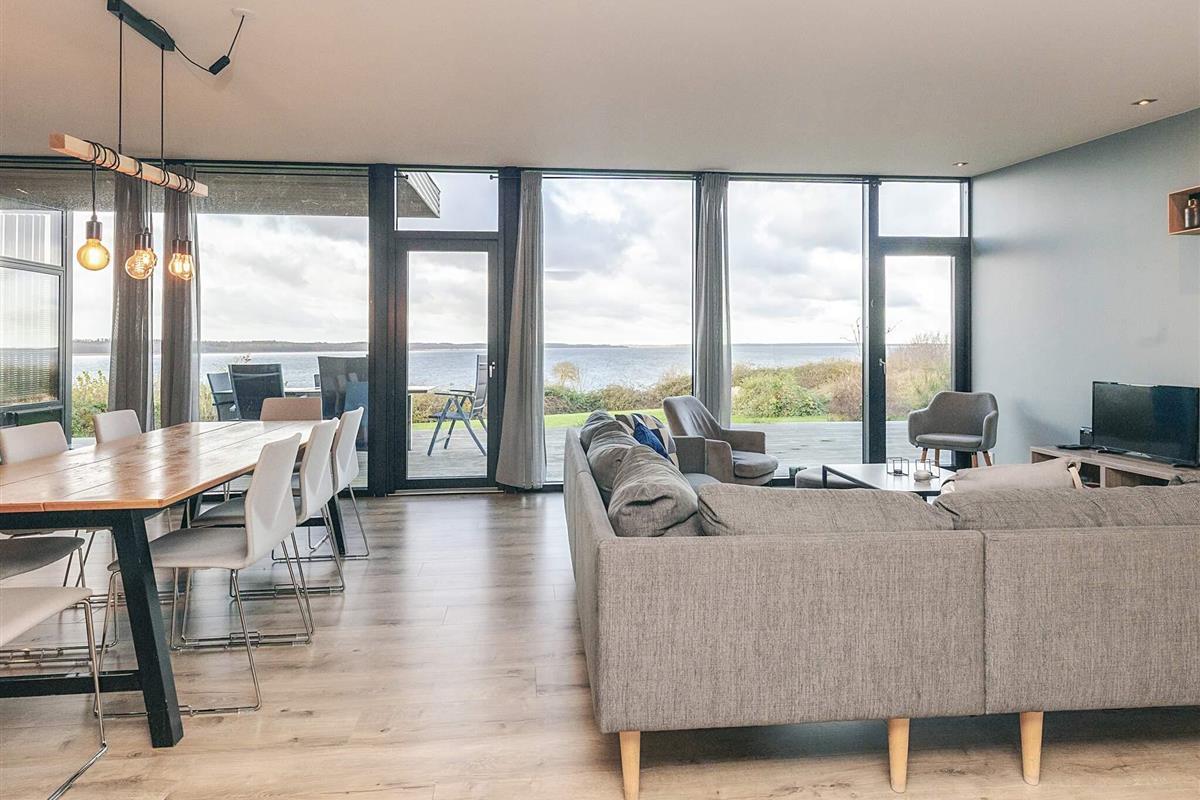 Die Raumverteilung eignet sich mit den zwei Schlafbereichen mit jeweils zugehörigem Bad auch gut für zwei befreundete Familien oder Generationen. Die Liege in einem der Zimmer ist 170 cm lang. In der Mitte befindet sich der geräumige Küchen-/Wohnbereich für die gemeinsamen Stunden. Die großen Fenster lassen viel Tageslicht ins Haus und bieten zusammen mit der erhöhten Lage eine schöne Panoramaaussicht über das Wasser im Fjord und zur Halbinsel Hornsherred.