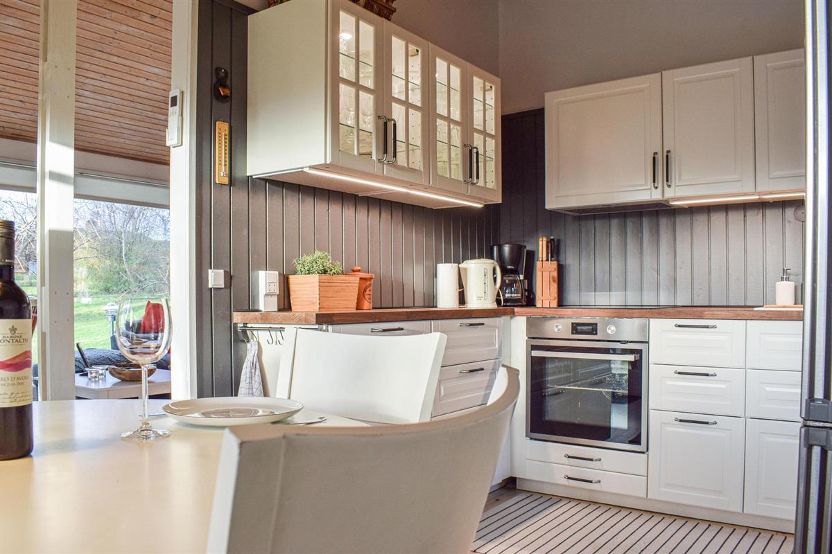 De buitenruimte biedt een mooi overdekt terras voor het hele gezin. Op een ander terras op het westen kunt u genieten van de zon en het uitzicht op de fjord. Op slechts 50 m afstand is het strand met een open haard en verschillende houten tafels en banken.