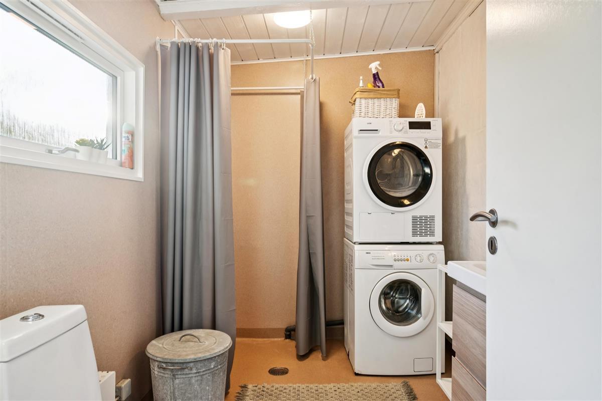 The spacious bathroom includes a shower as well as access to both a washing machine and a tumble dryer.