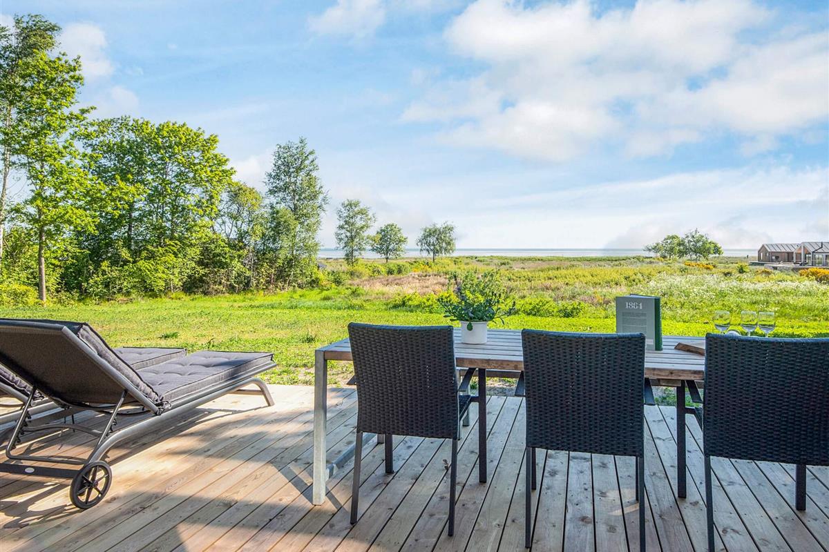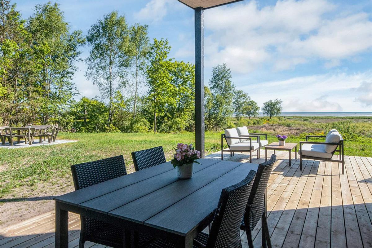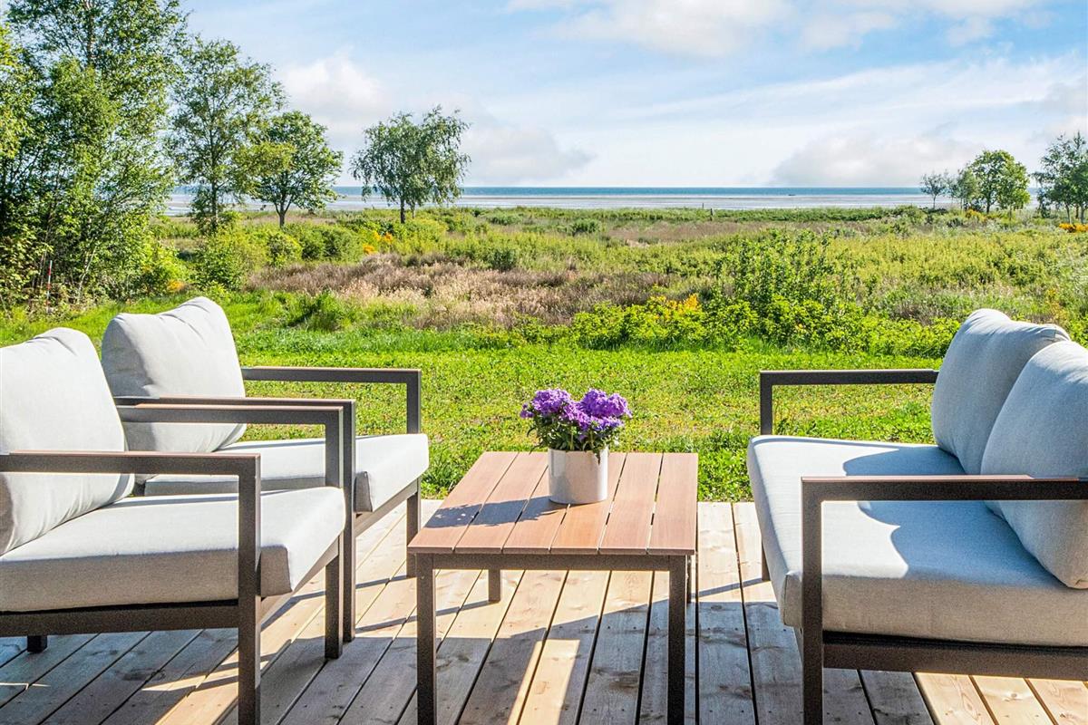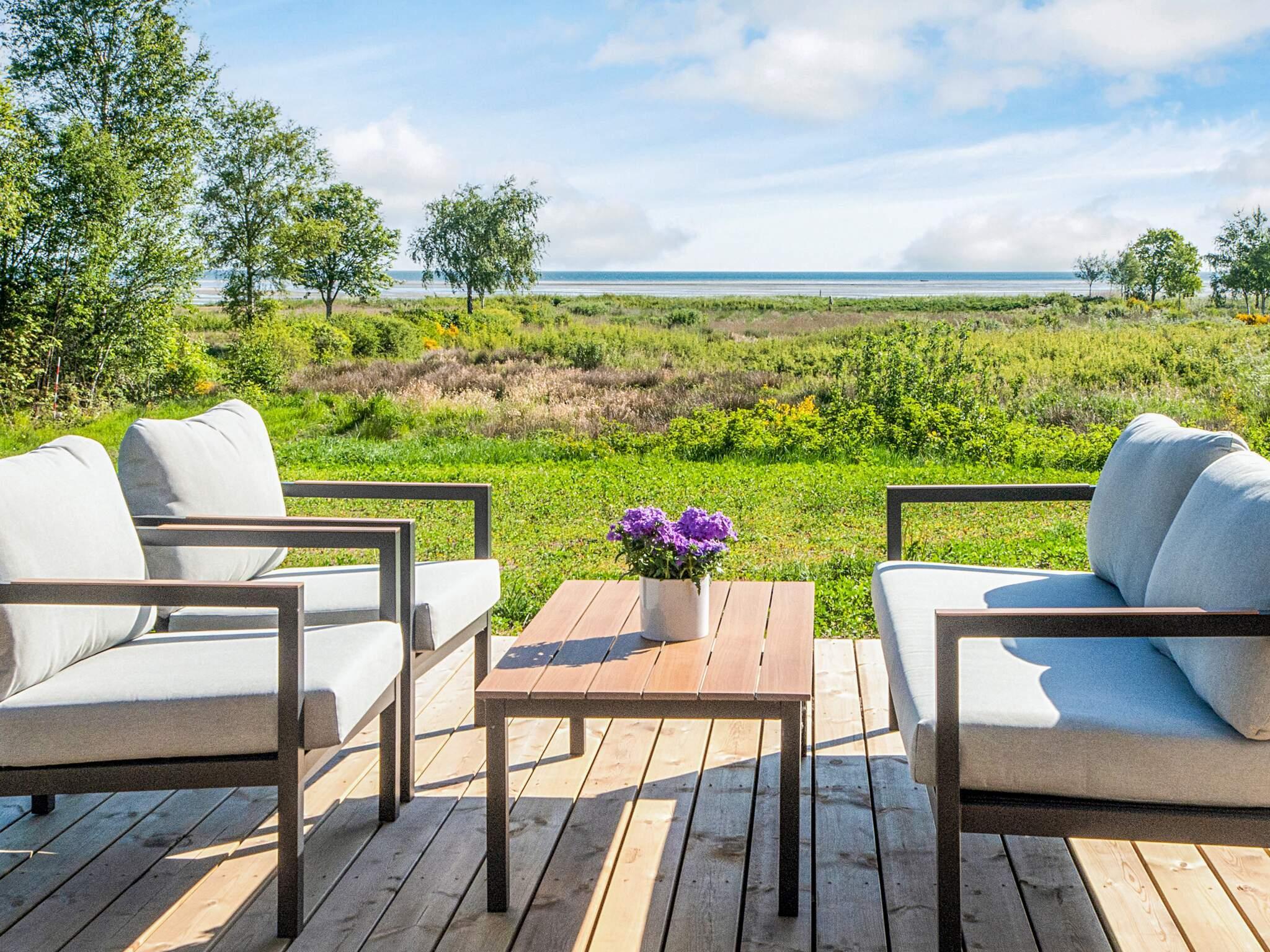 Große Terrasse mit Gartenmöbeln, von der aus Sie den fantastischen Blick aufs Wasser genießen können.