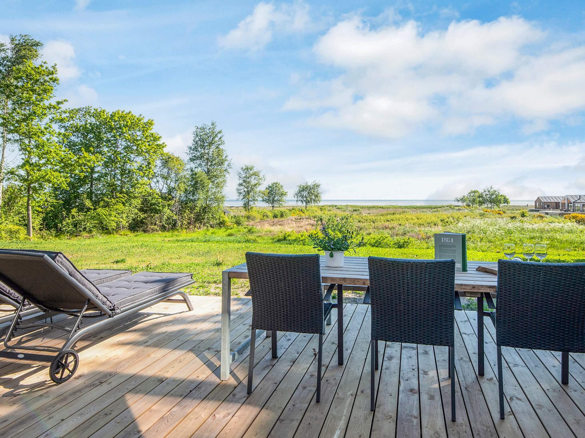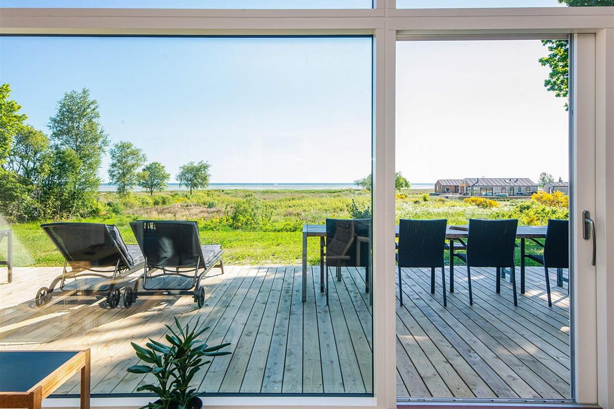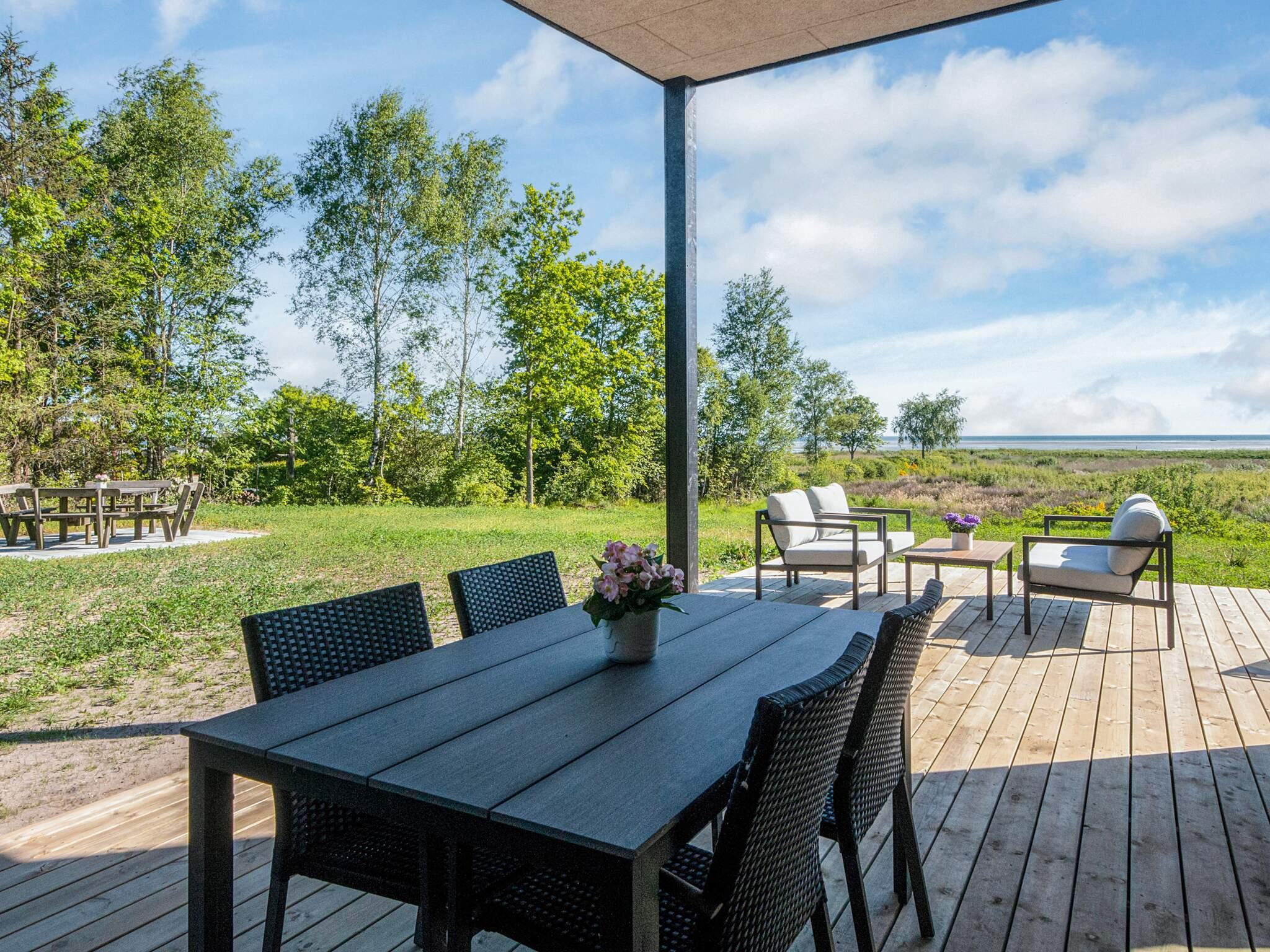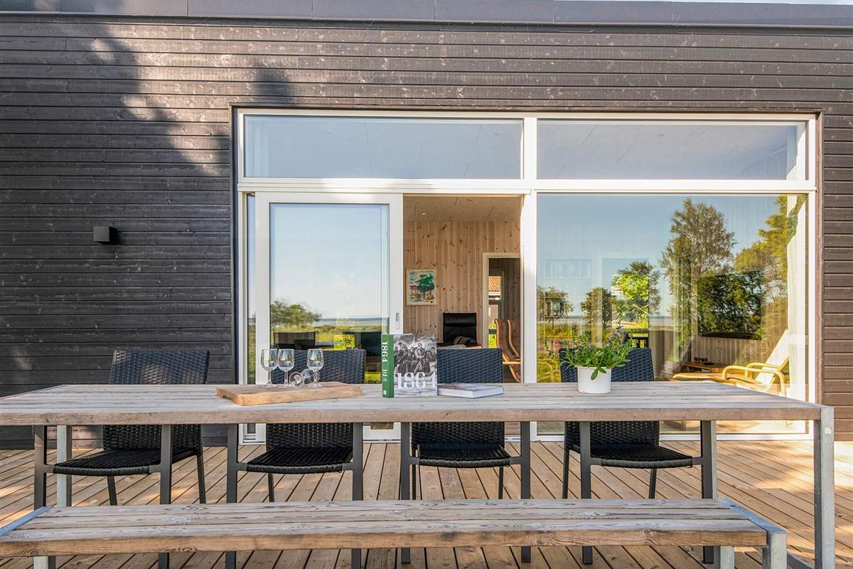 Große Terrasse mit Gartenmöbeln, von der aus Sie den fantastischen Blick aufs Wasser genießen können.