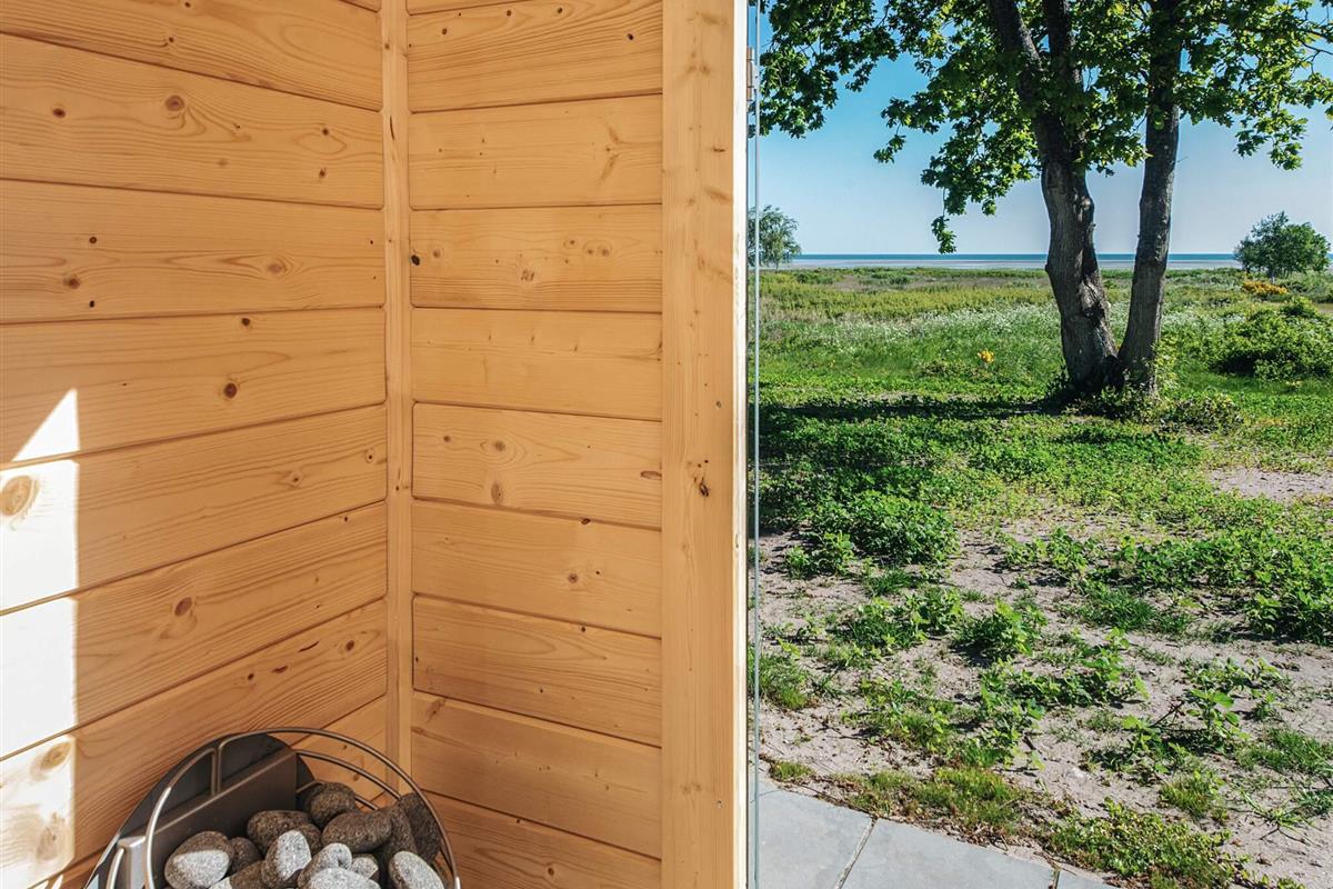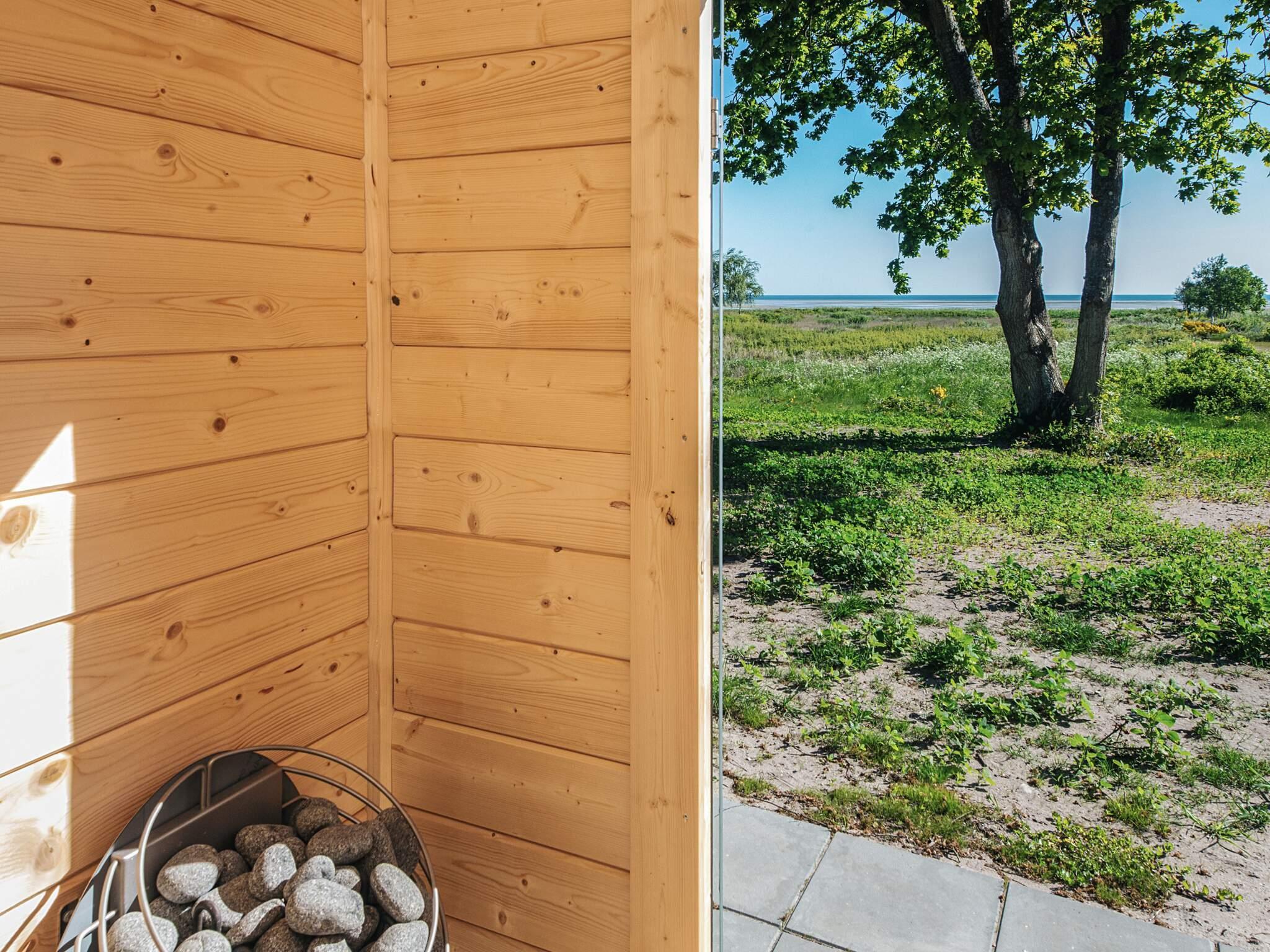 Außensauna mit Platz für 4 Personen zum Entspannen mit Blick in die Natur.