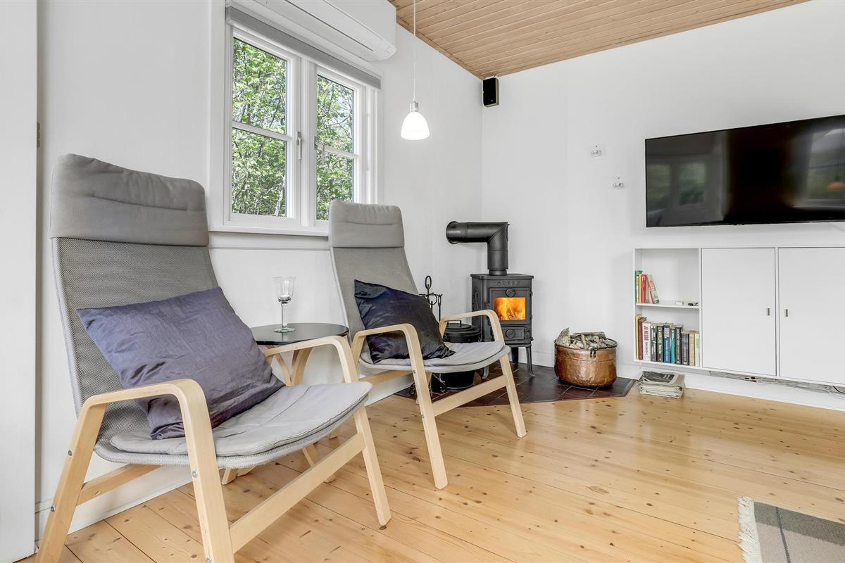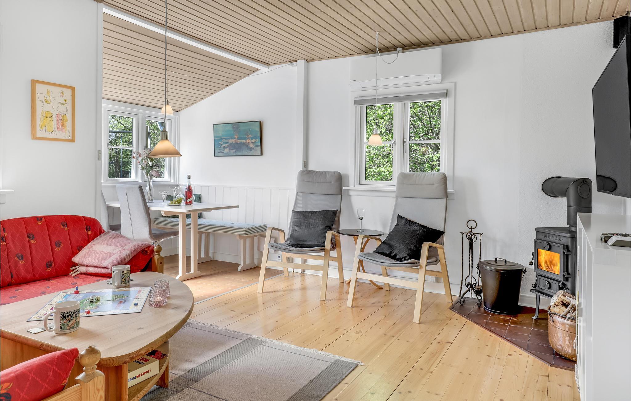 Charmant, goed uitgerust vakantiehuis op een mooi perceel in de populaire wijk Stampen en op slechts 500 m van het rustige en kindvriendelijke zandstrand. De woonkamer van het huis is ingericht met een eettafel met uitzicht op de tuin en een gezellige zithoek met uitzicht op de houtkachel met glazen deur.