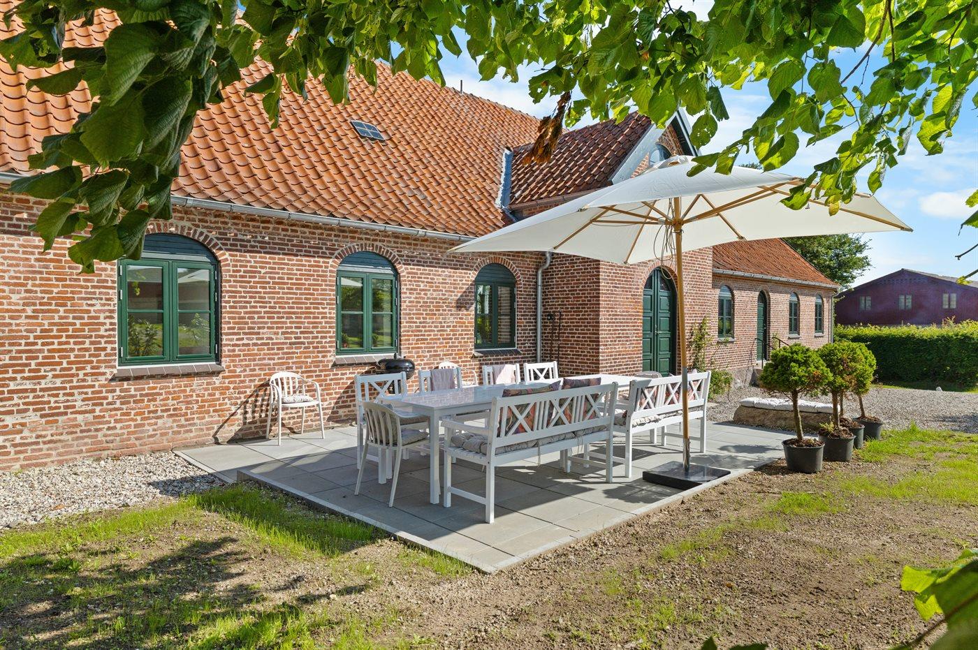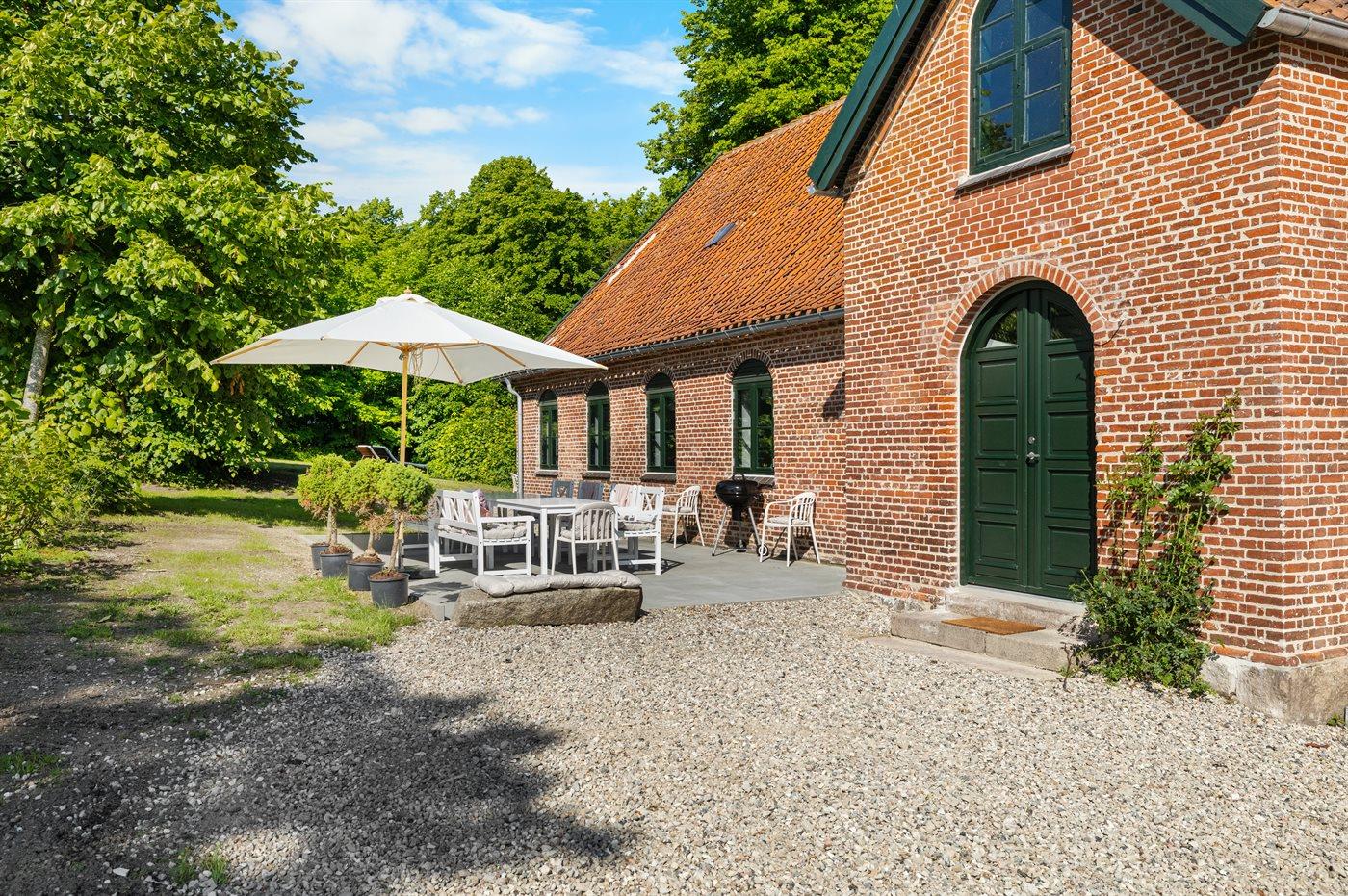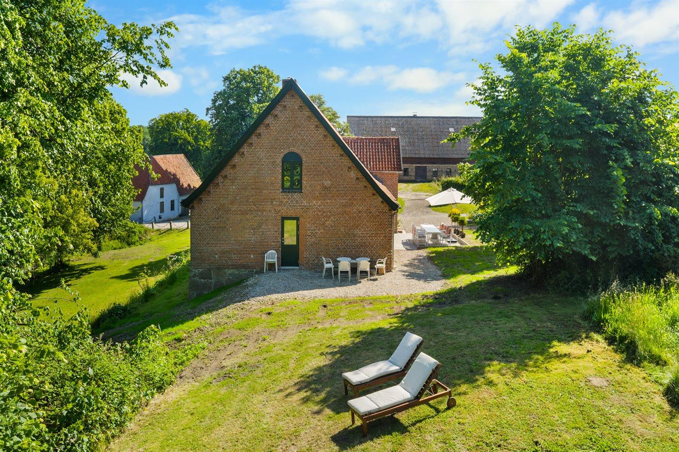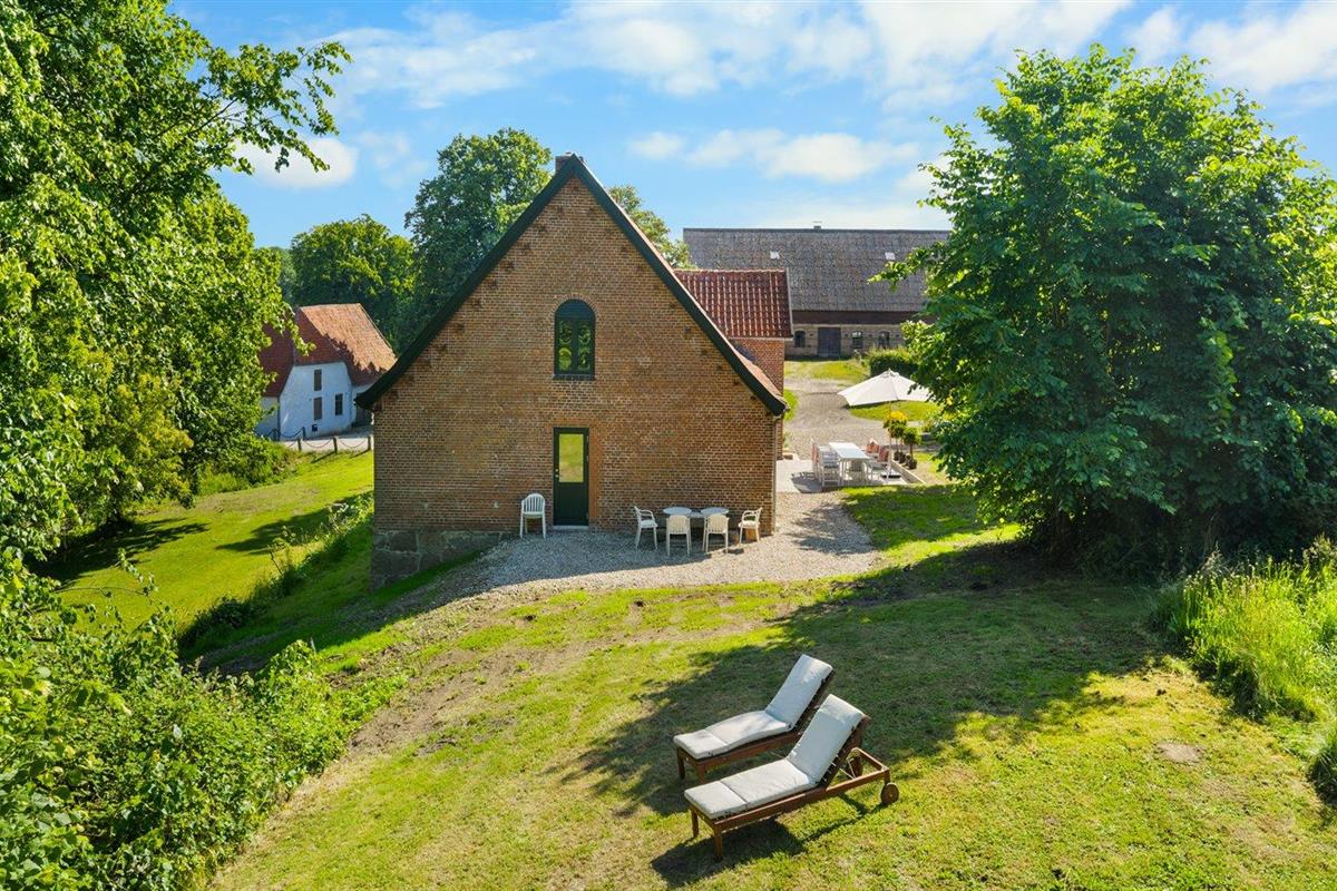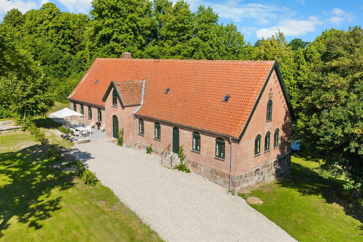 Voormalige boerderij in Tranekær, recent gerenoveerd voor grote groepen, met moderne voorzieningen en rustiek uitzicht.