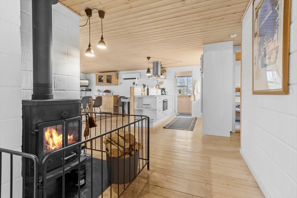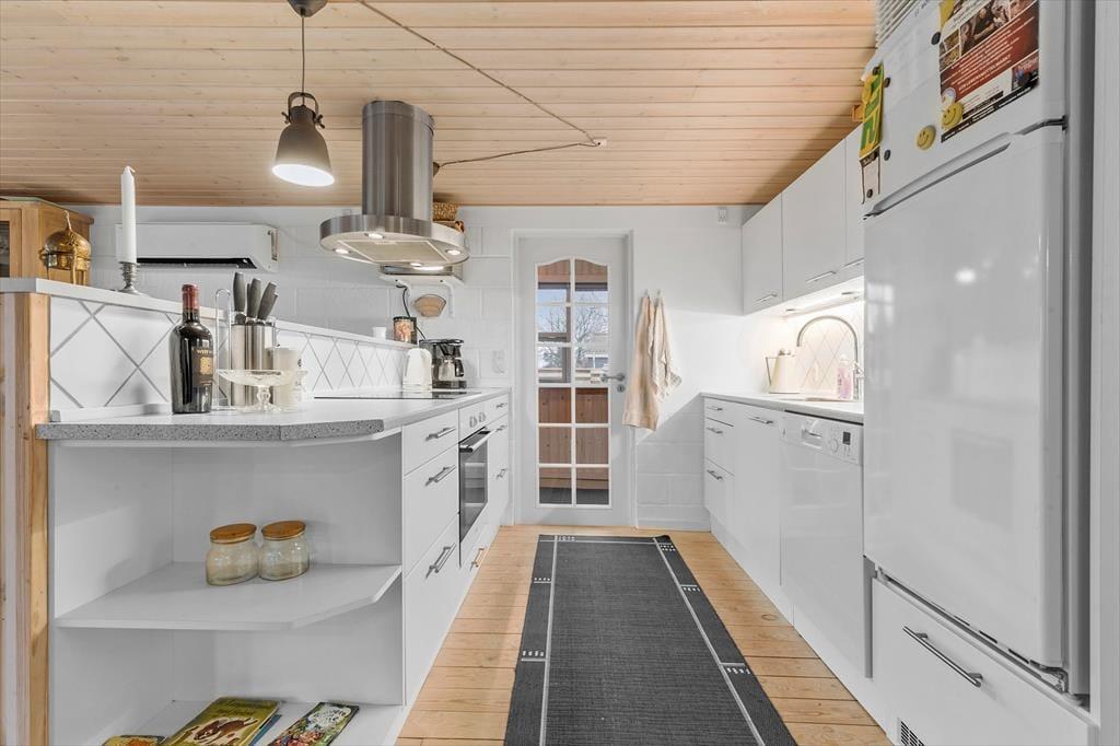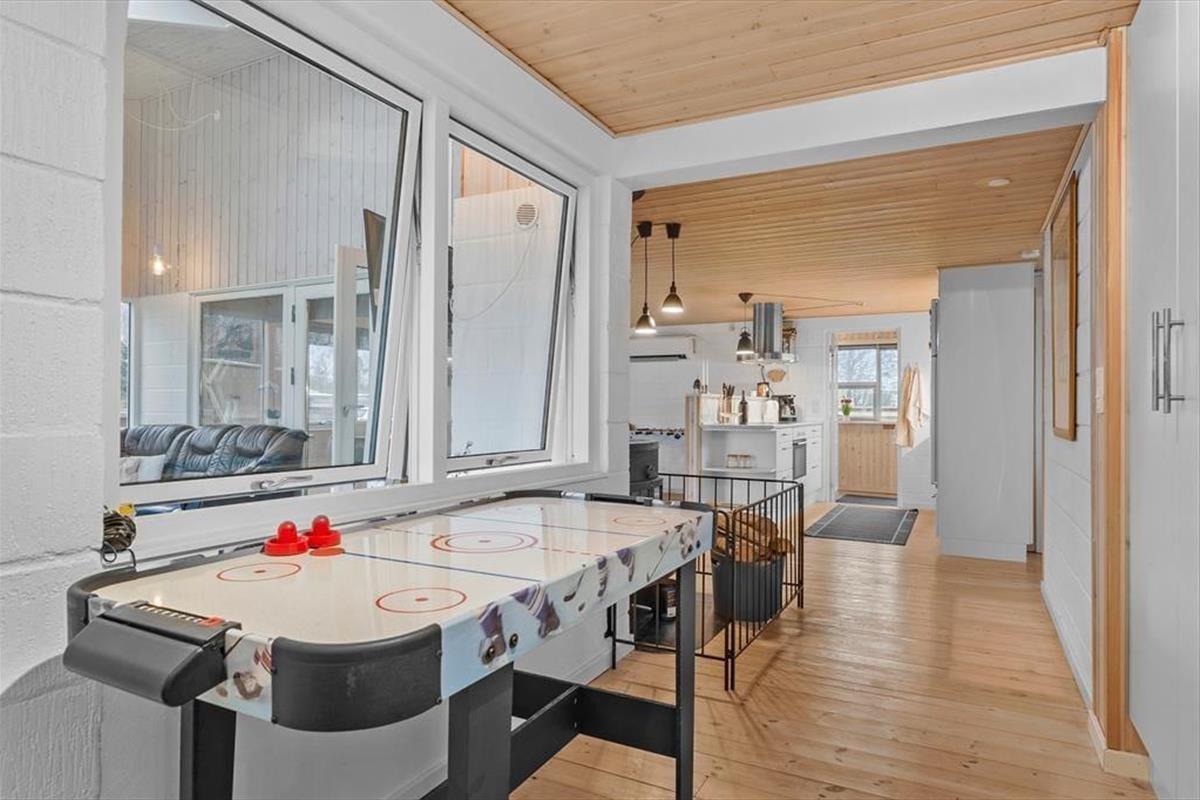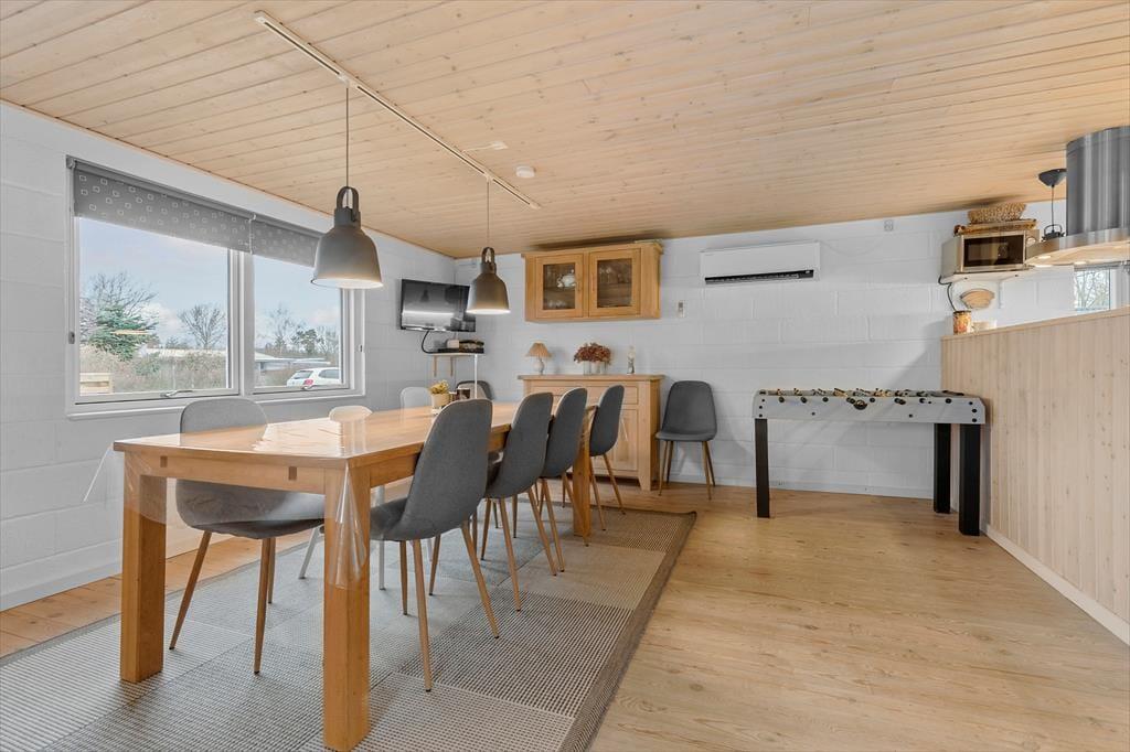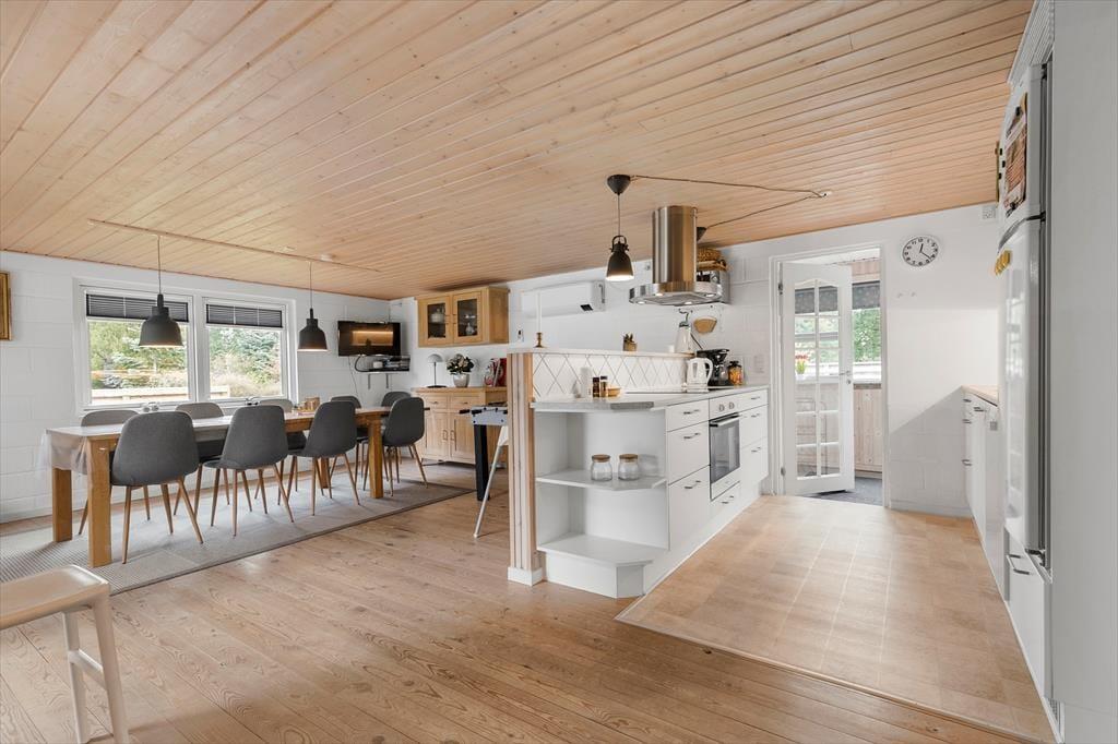 Am nördlichen Ende Djurslands begrüßt dich dieses attraktive Ferienhaus, das im Jahr 2021 einer umfassenden Renovierung unterzogen wurde. Hinter dem Eingangsbereich erwartet dich der gemütliche Küchen- und Essbereich, in dem ein behaglich knisternder Kaminofen und eine Wärmepumpe zu jeder Zeit angenehme Temperaturen versprechen. Die vollausgestattete Küche bietet alles, was du für die Zubereitung der täglichen Urlaubsmahlzeiten benötigst. Vom Essbereich aus gelangst du durch eine Tür in den einladenden Wohnraum, in dem du dich im Kreise deiner Lieben nach einem langen Urlaubstag bestens erholen und entspannen kannst. Ihr könnt auf dem Sofa in gemütlicher Runde beisammensitzen, den Fernseher nutzen oder euch in spannende Bücher vertiefen. Jede Menge Spaß und Abwechslung für Groß und Klein garantieren der Tischkicker und das Airhockey-Spiel. Die Schlafplätze verteilen sich auf vier schöne Schlafräume, von denen zwei jeweils ein Doppelbett beinhalten. Im dritten Schlafraum sind zwei Einzelbetten untergebracht. Das Etagenbett im vierten Schlafraum werden insbesondere deine Kinder lieben. Der Rest der Wohnfläche ist dem hellen Duschbadezimmer überlassen.