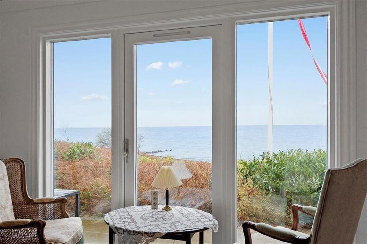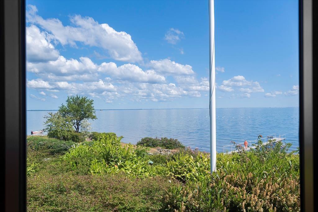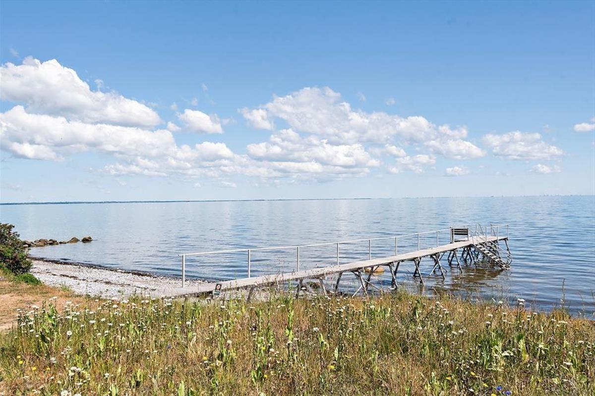 Lediglich 25 Meter trennen das Haus vom Strand mit einem Badesteg für die Anwohner und Rasenflächen für Sonnenbäder.
