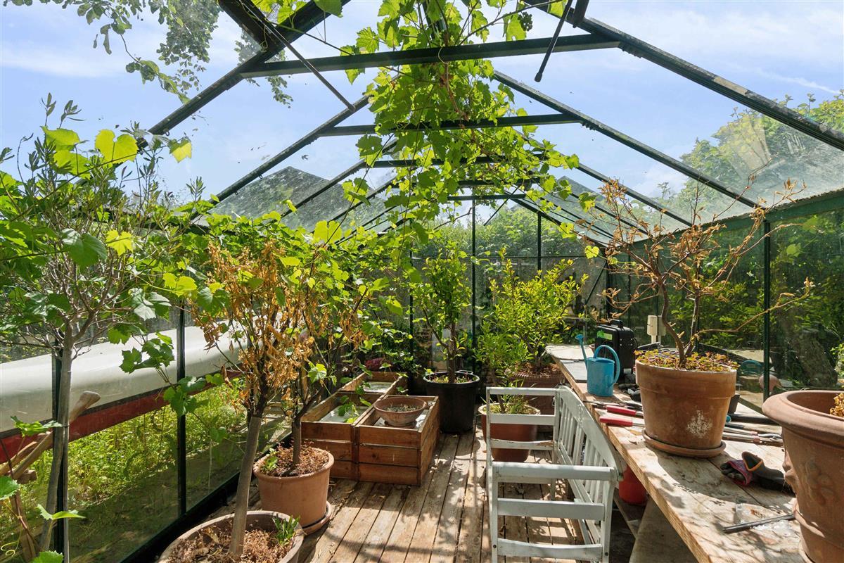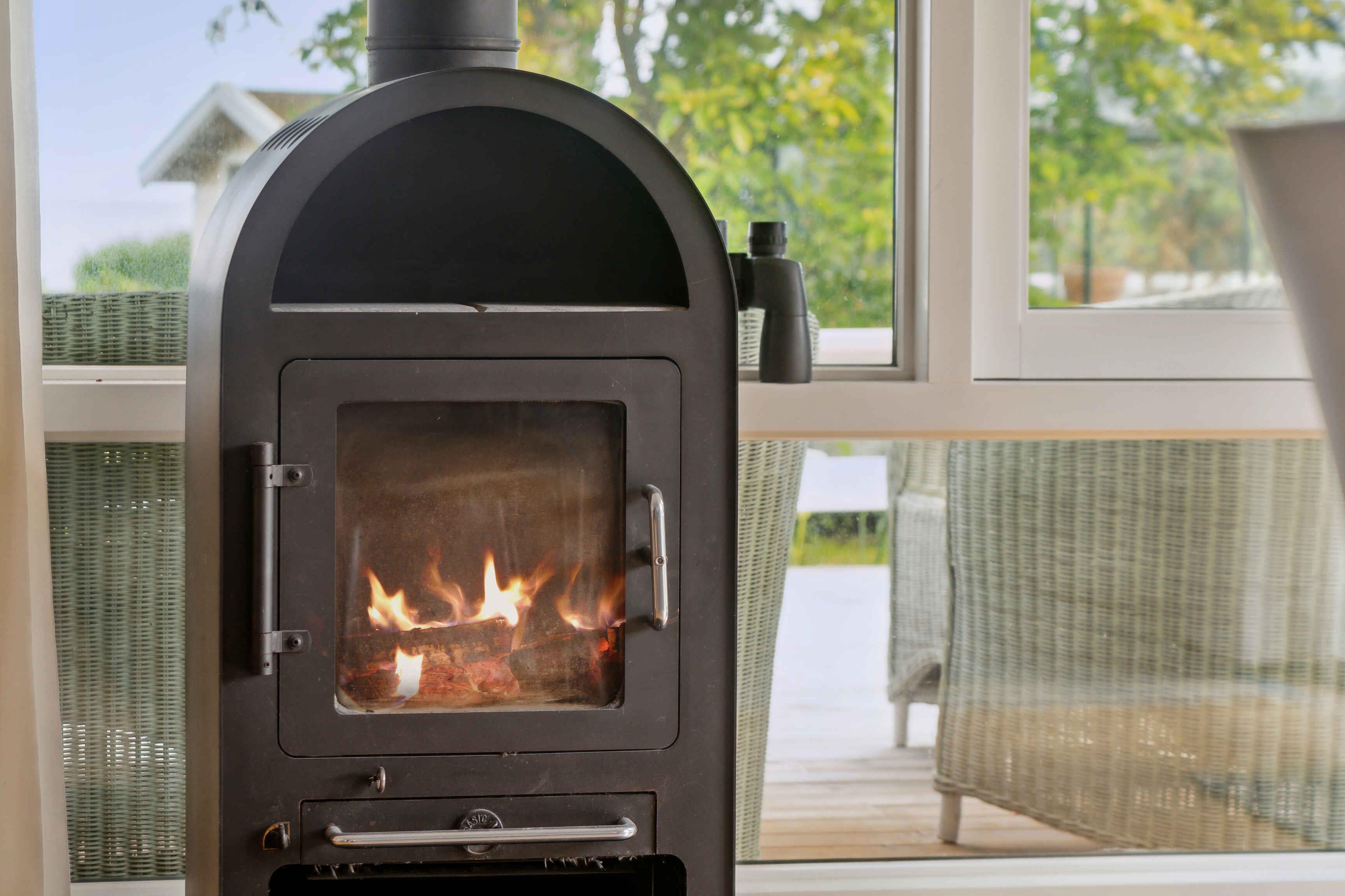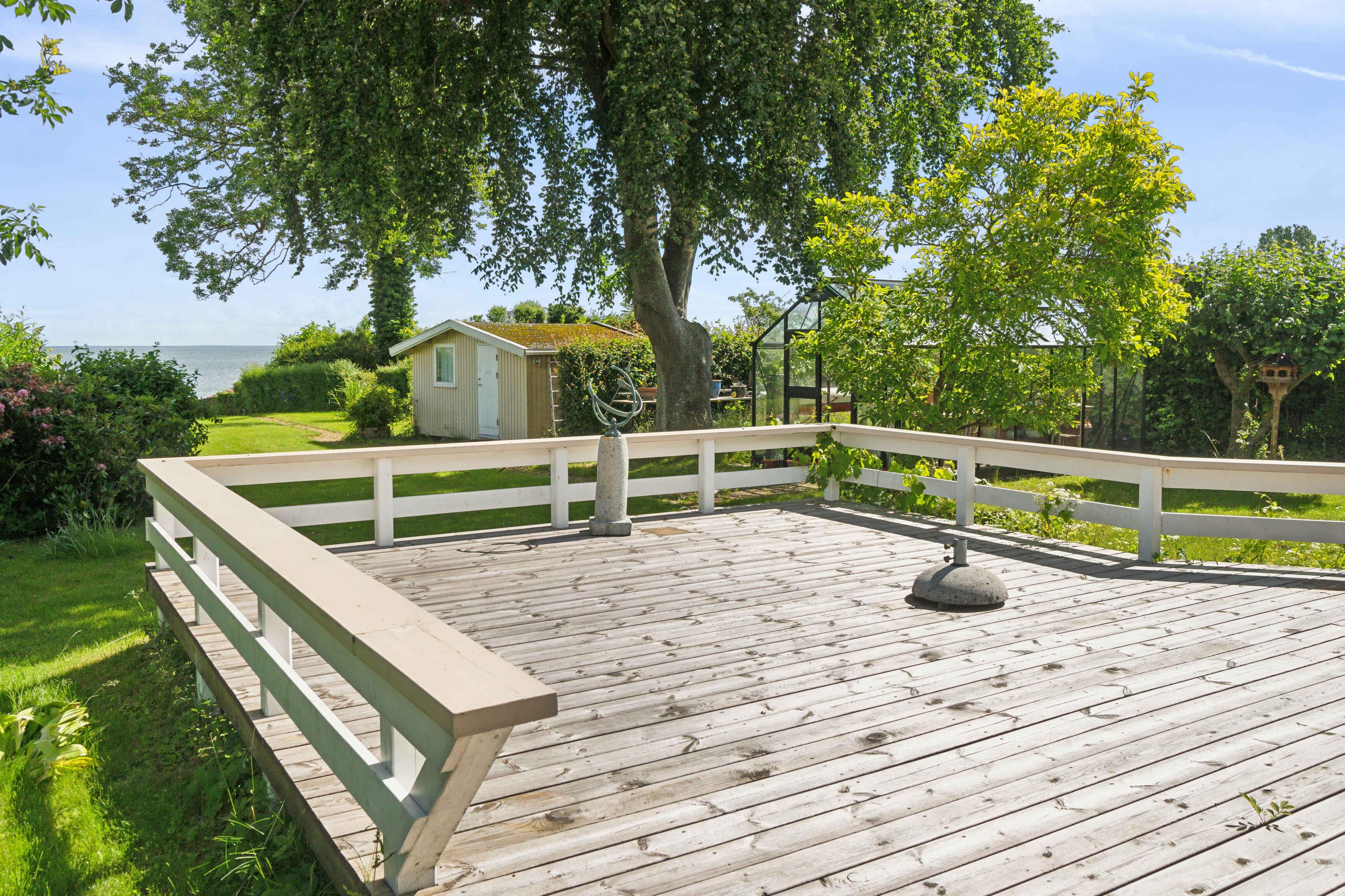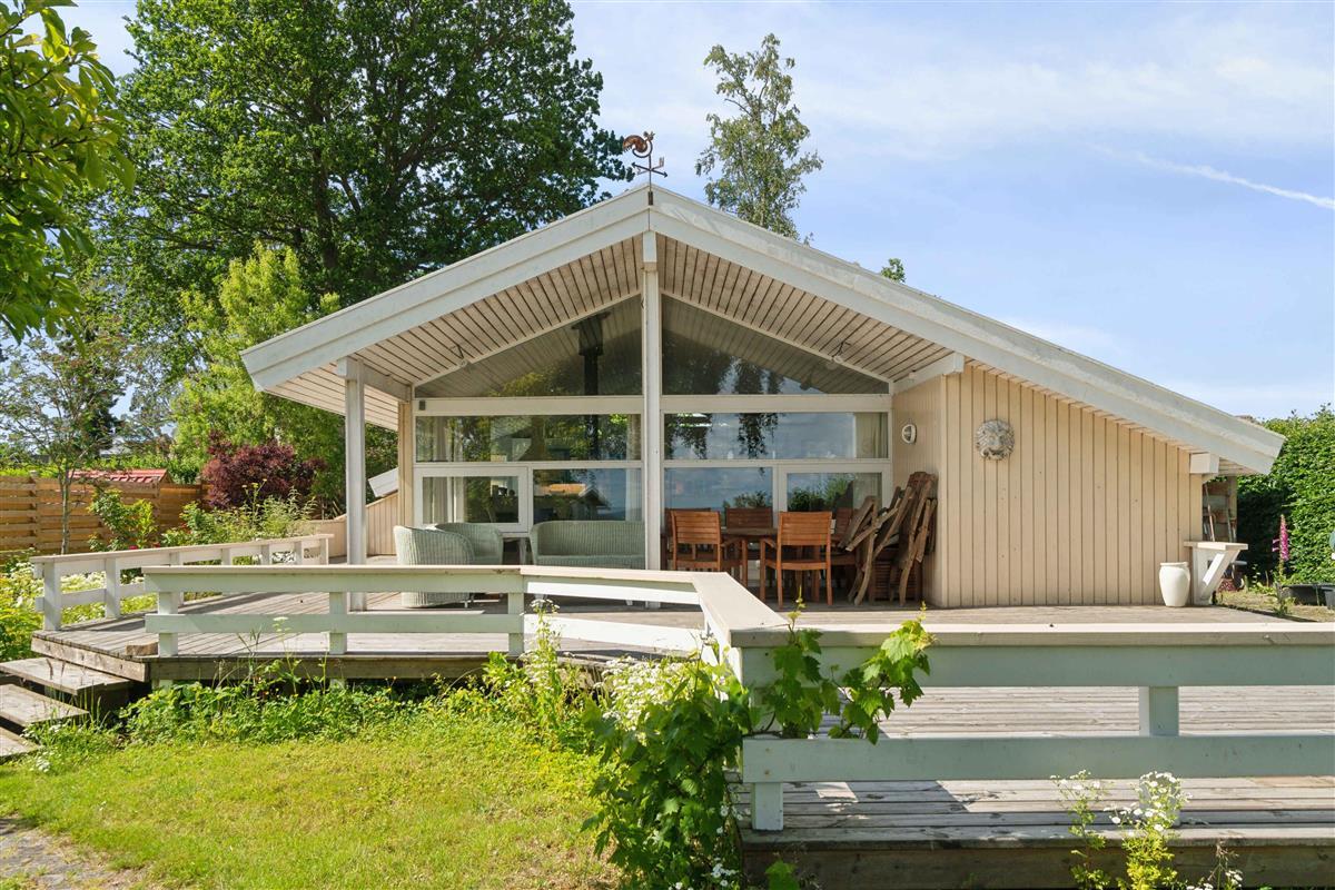 Lichte woning met zeezicht vanuit de glazen gevel in de woonkamer, groot gazon met ruimte voor spelletjes en spelen, kiezelstrand direct onder de woning en strand met zwemsteiger iets rechts, houtkachel en groot houten terras