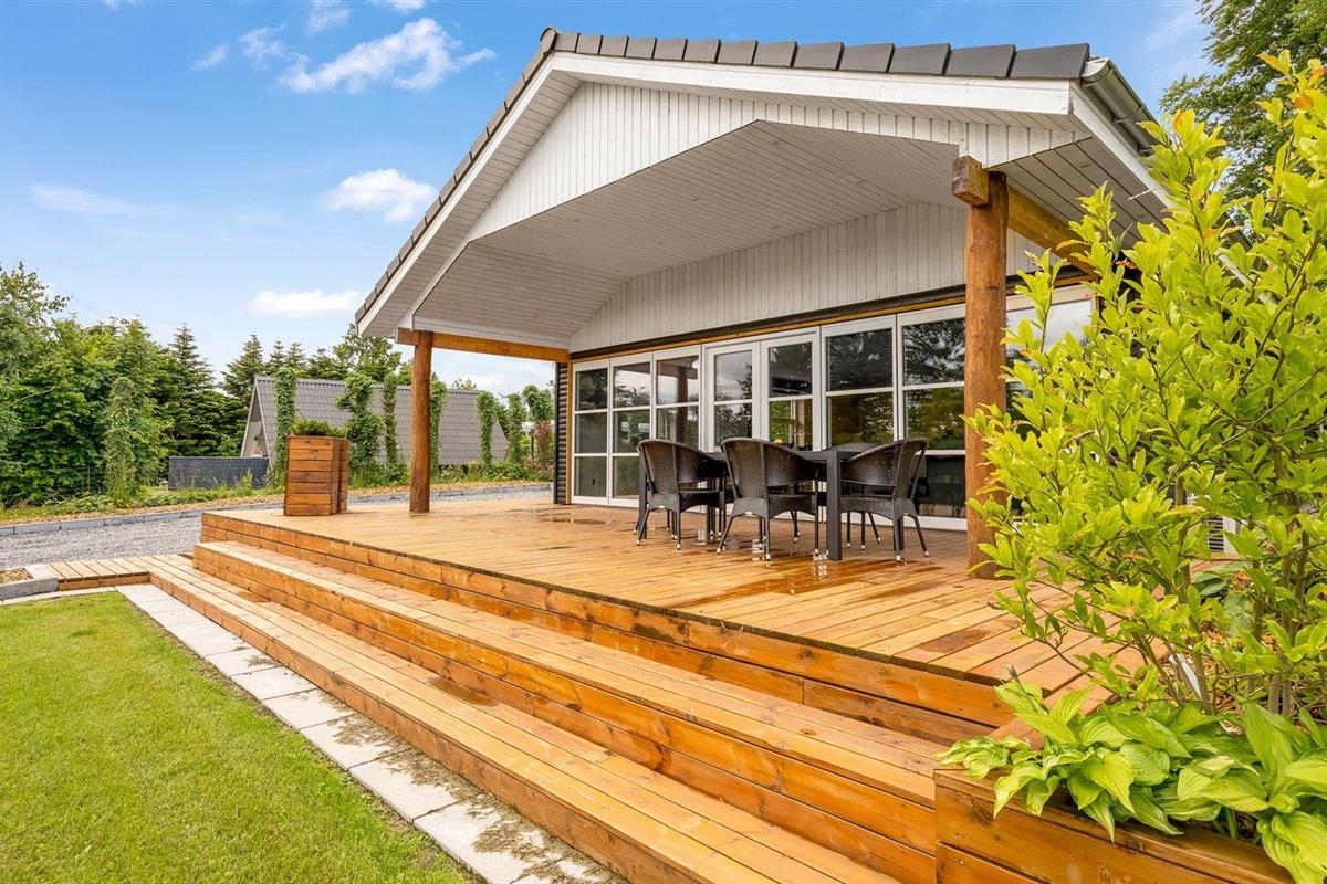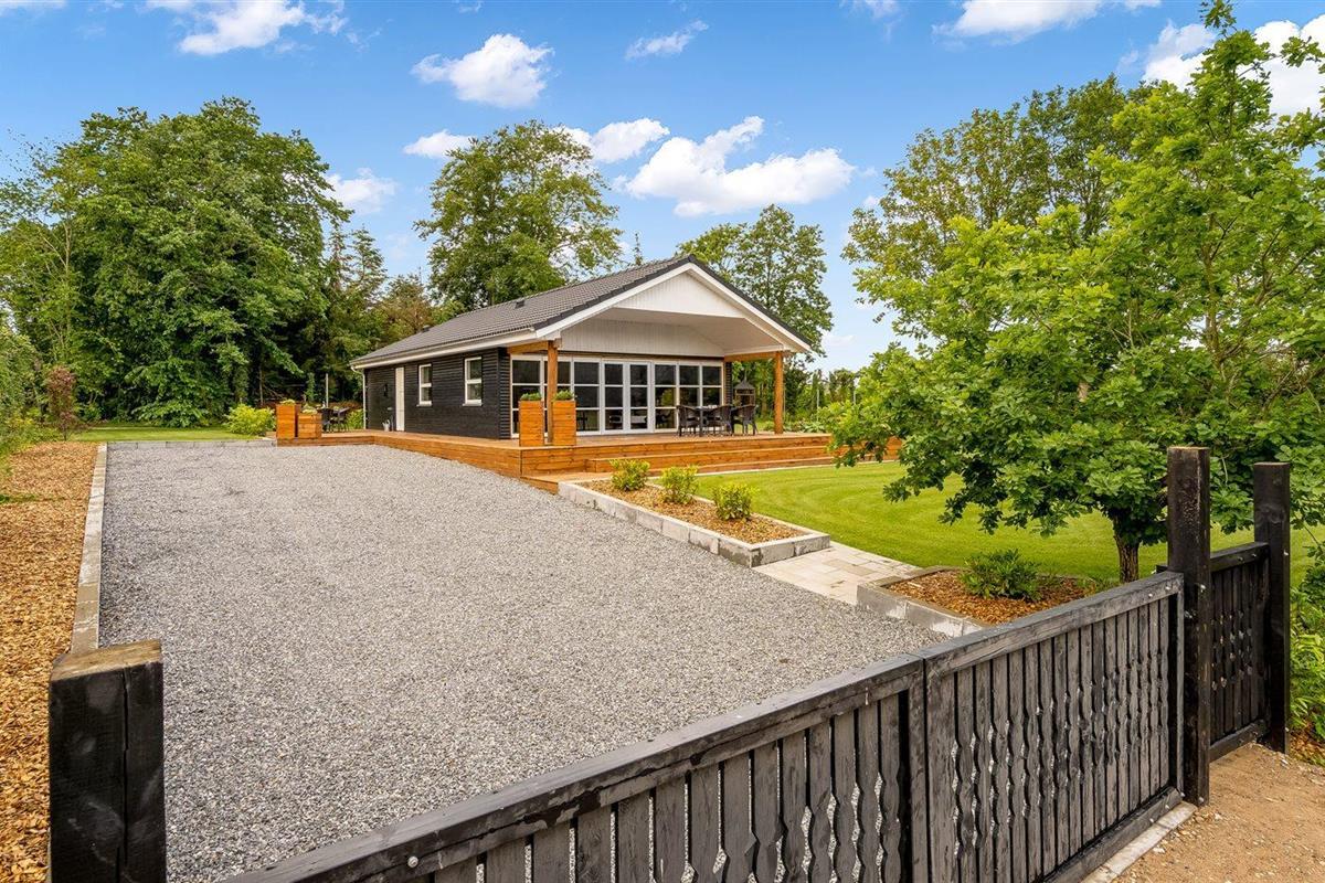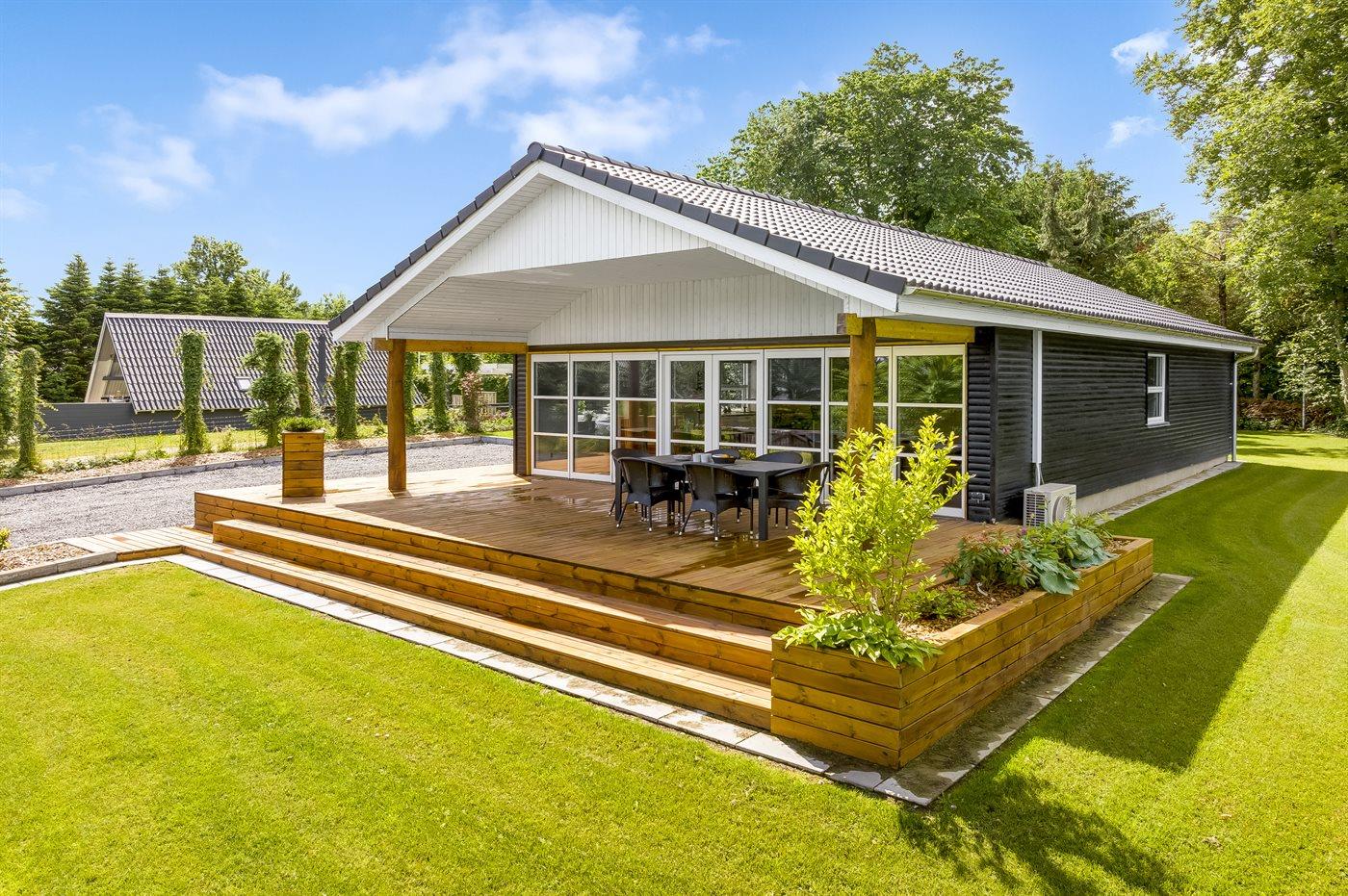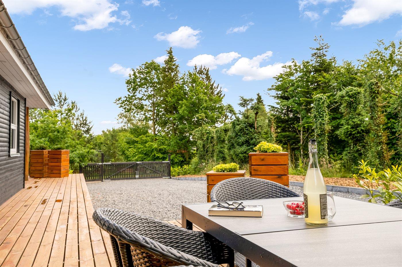 De vakantiewoning is gelegen op een 1400 m² groot aangelegde tuin. Afstand tot de fjord 300 m. Dichtstbijzijnde winkel 4000 m. Bij de vakantiewoning hoort terras. Daarnaast is er een overdekt terras. Schommel. Speeltoren. Parkeerplaats bij het huis.