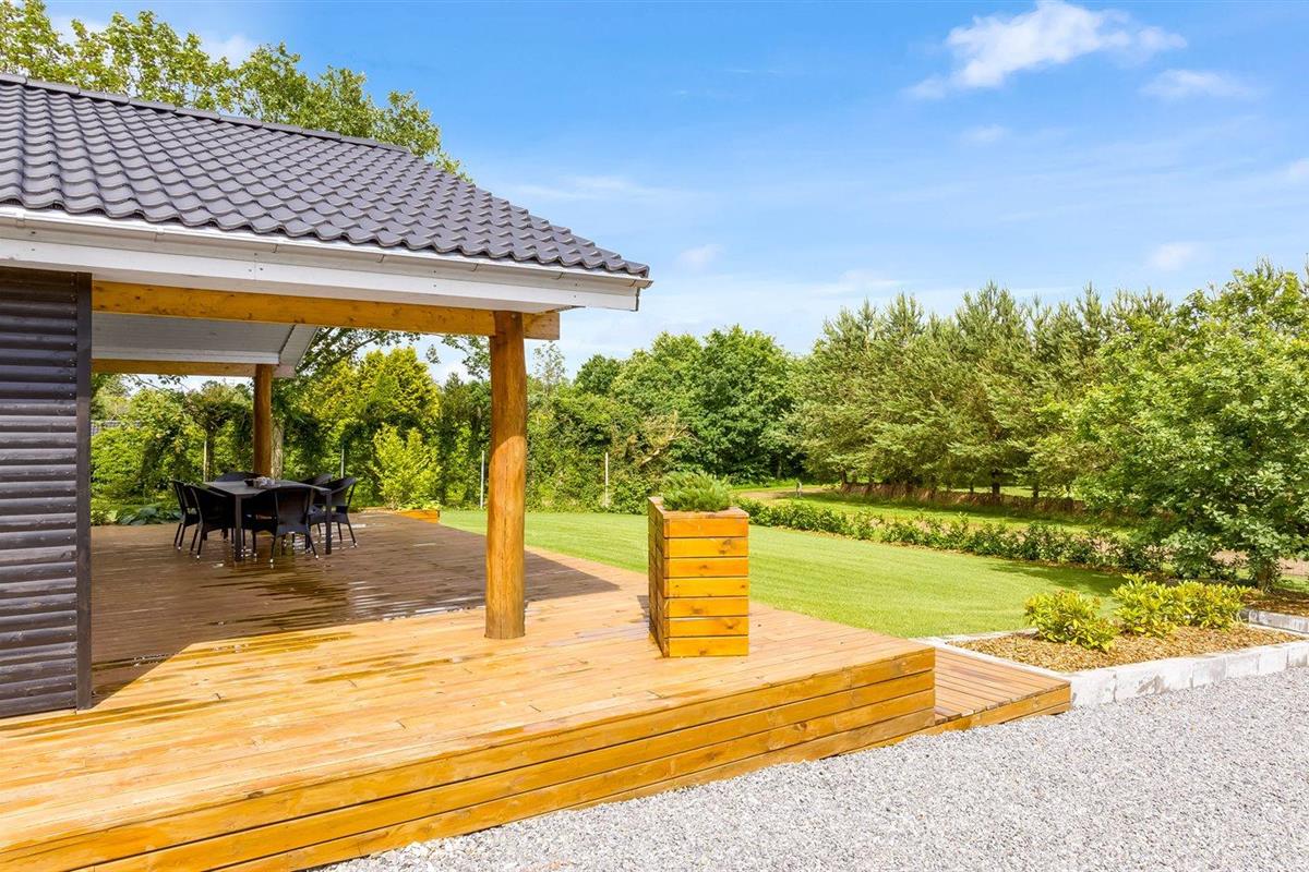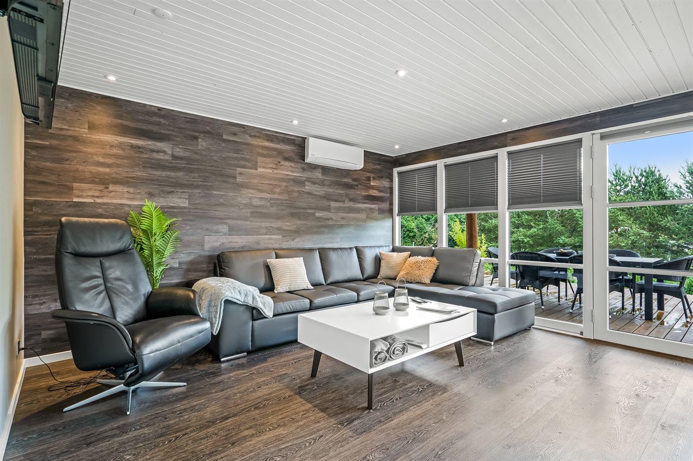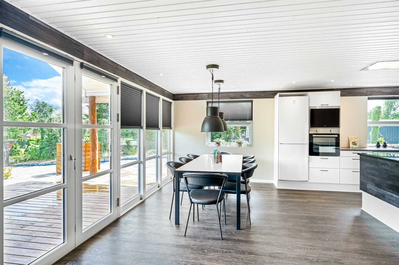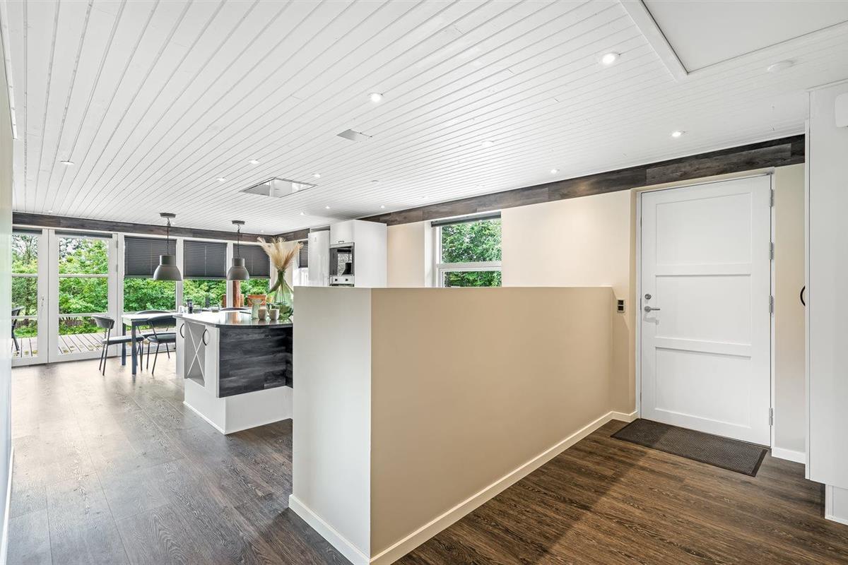 De vakantiewoning is gelegen op een 1400 m² groot aangelegde tuin. Afstand tot de fjord 300 m. Dichtstbijzijnde winkel 4000 m. Bij de vakantiewoning hoort terras. Daarnaast is er een overdekt terras. Schommel. Speeltoren. Parkeerplaats bij het huis.