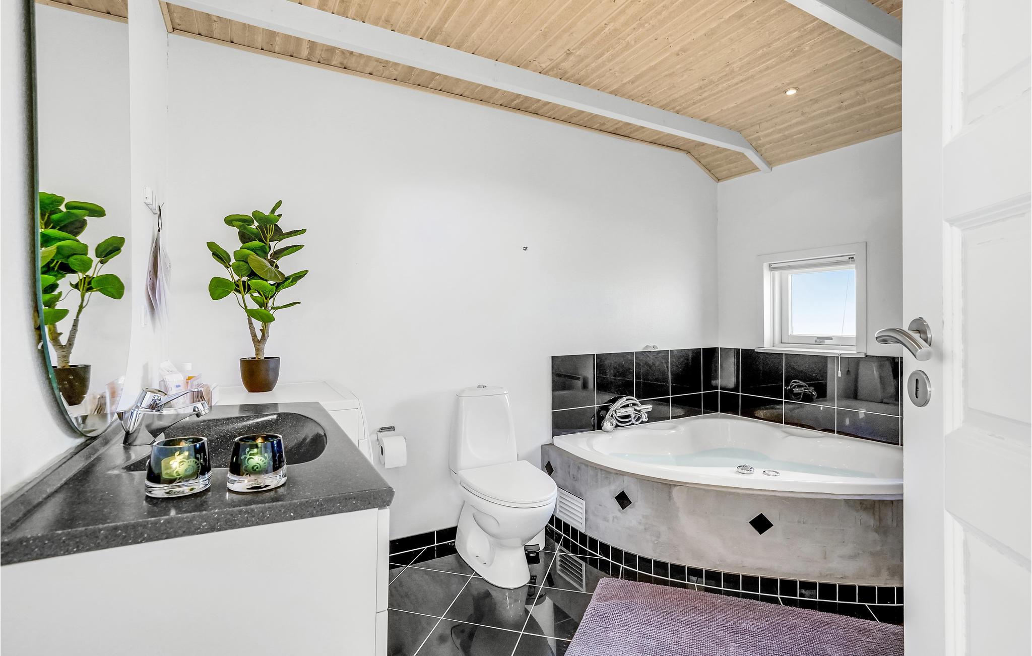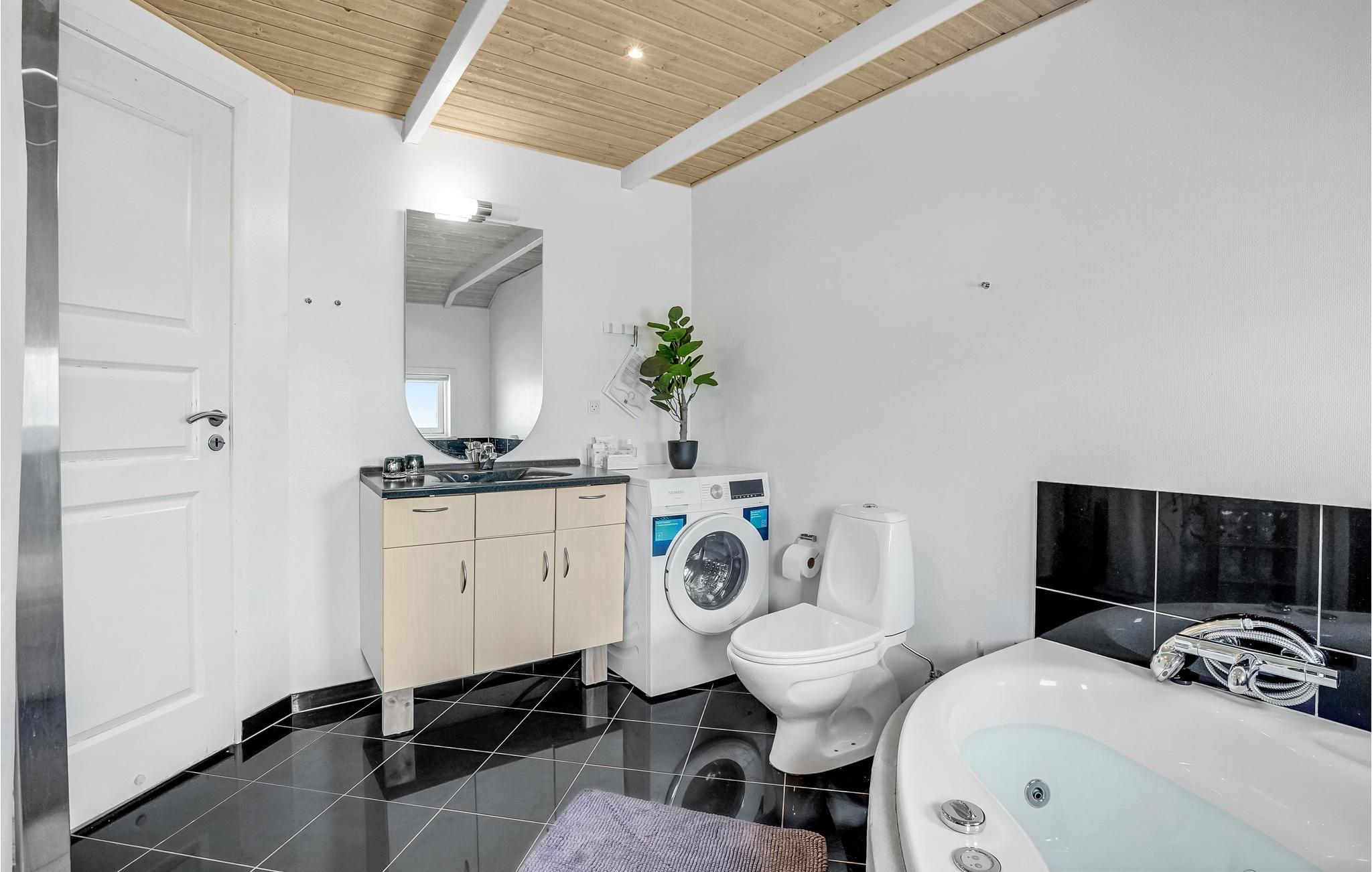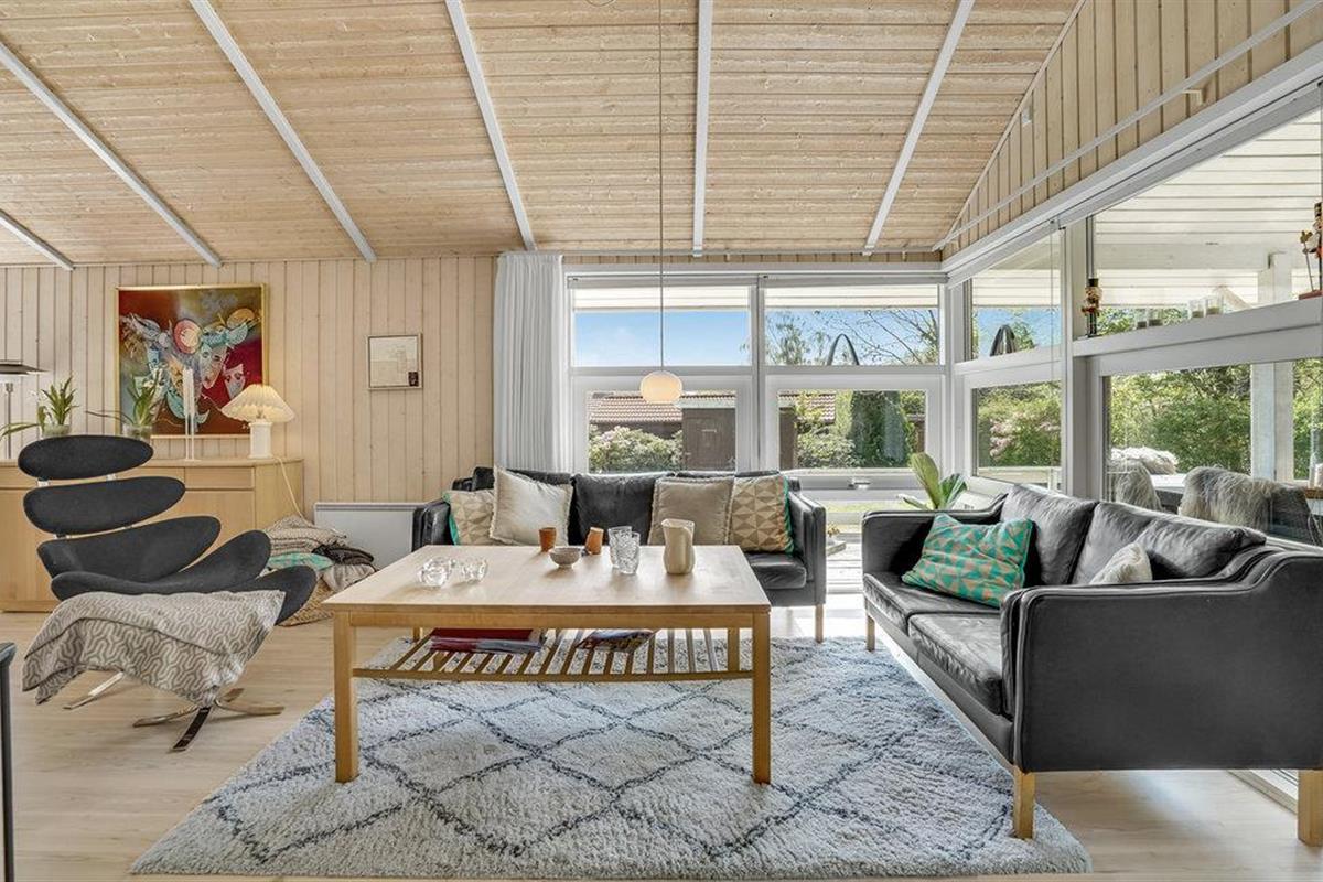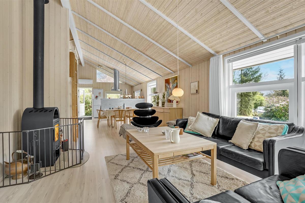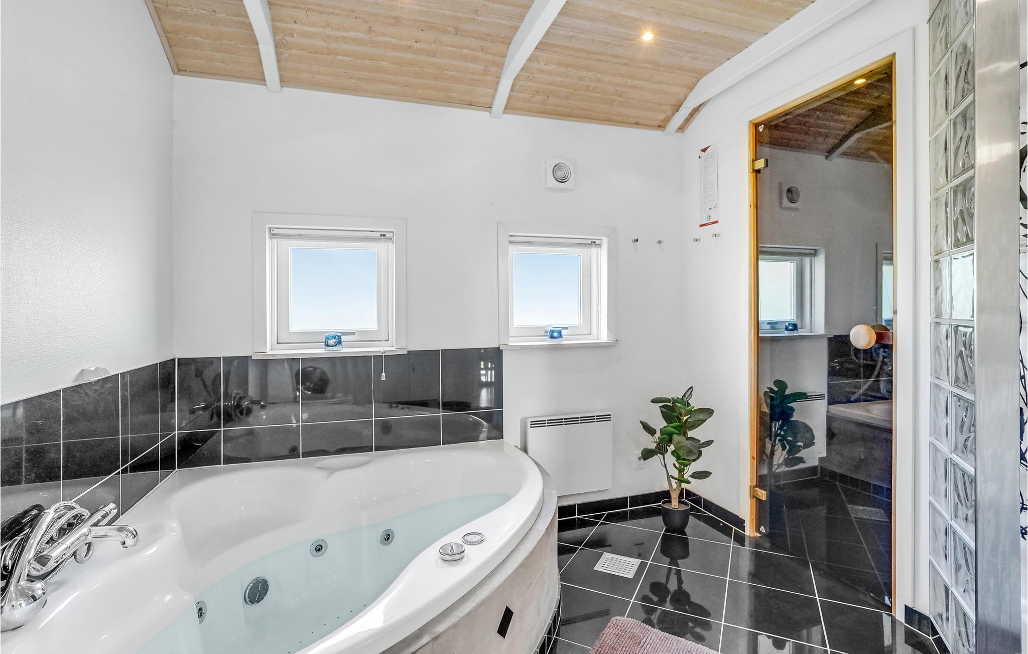 Dit mooie vakantiehuis ligt hoog in de mondaine wijk aan Strib Strand. Het huis heeft verschillende mooie terrasgedeeltes, waarvan één overdekt. Het is dus altijd mogelijk om een windvrij hoekje te vinden. Het vakantiehuis heeft een mooie woonkamer met een houtkachel. Naast de woonkamer ligt de open, goed uitgeruste keuken. De mooie badkamer van het huis heeft zowel een whirlpool als een sauna, zodat het lichaam verwend kan worden. Overal in het vakantiehuis en op het terras kunt u comfortabel gebruik maken van de snelle internetverbinding. Het vakantiehuis ligt op slechts enkele minuten lopen van het familievriendelijke strand. Een trap leidt naar het strand.