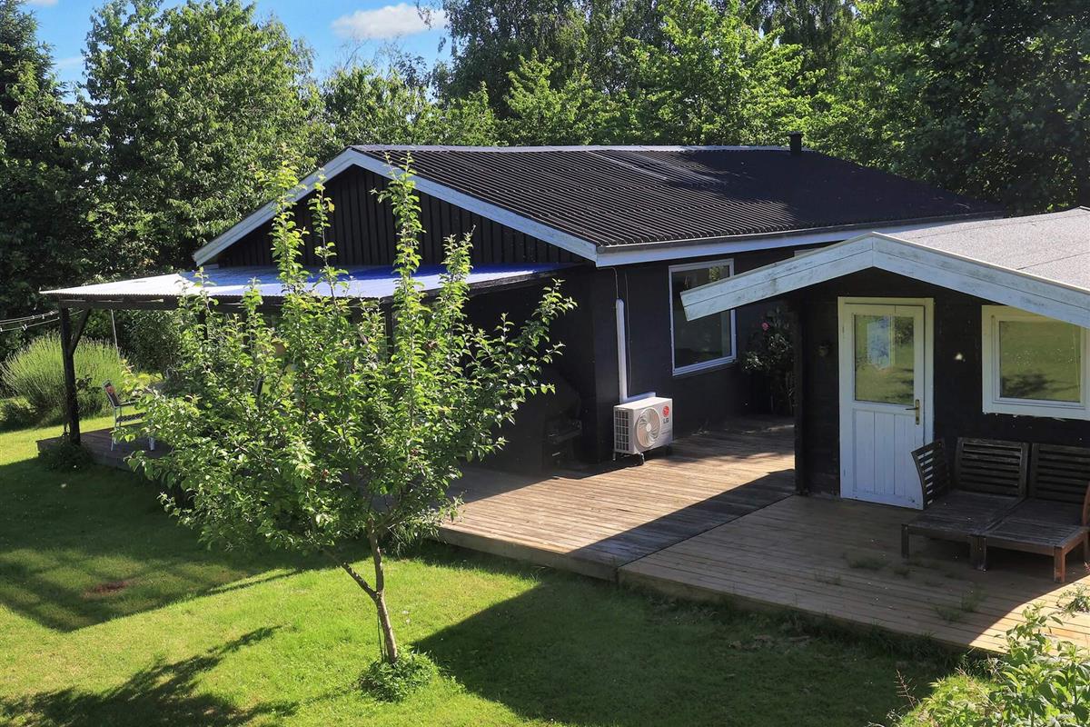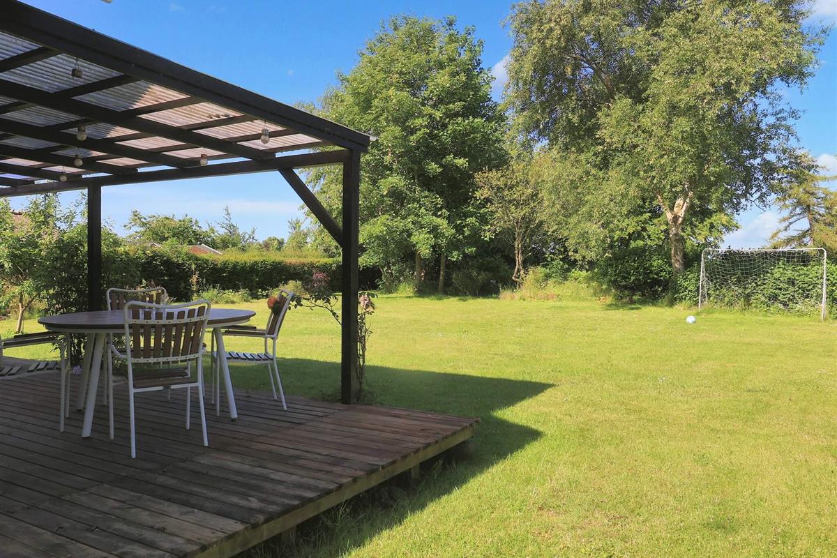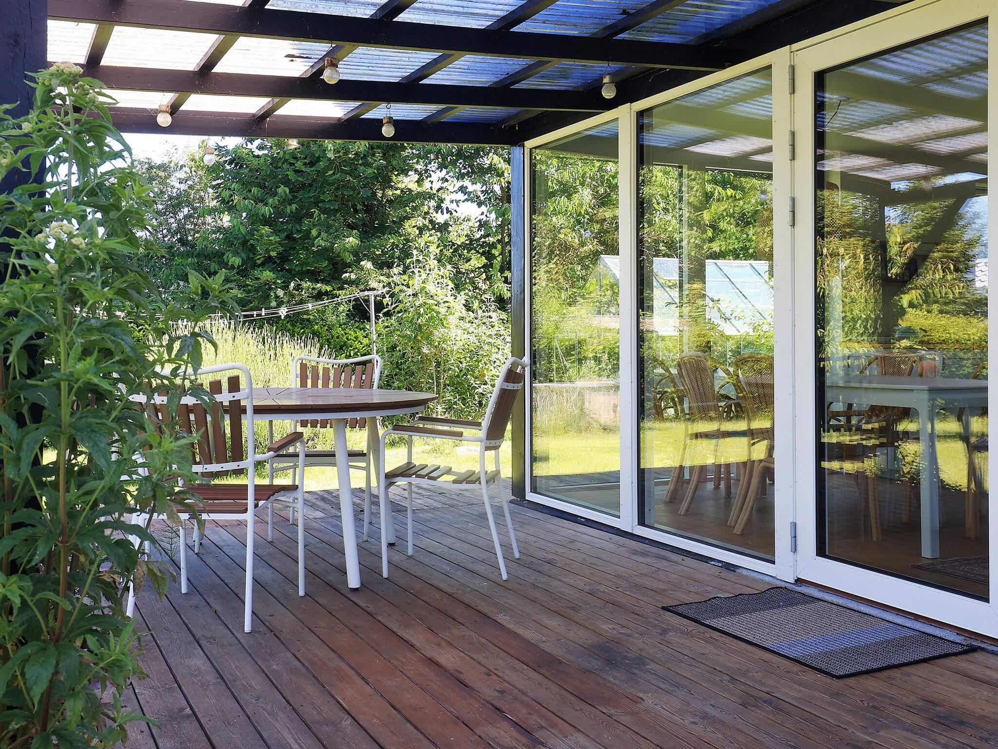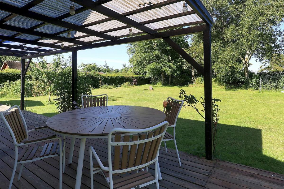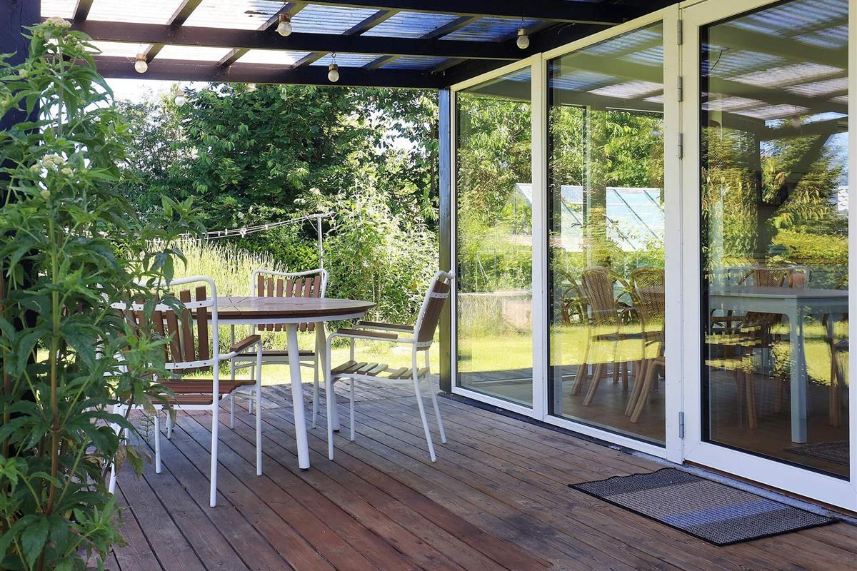 Vom Wohnzimmer aus können Sie direkt auf die teils überdachte Holzterrasse gehen und die Sonne in den Gartenmöbeln genießen oder auf dem Holzkohlegrill grillen. Das Ferienhaus steht auf einem Naturgrundstück von 1.202 m2 Größe mit Blick zum Grønsund und Platz für Spiel und Spaß.