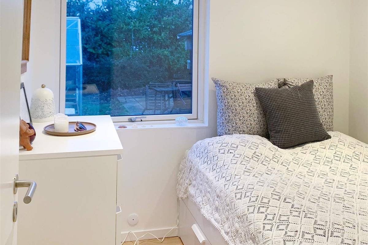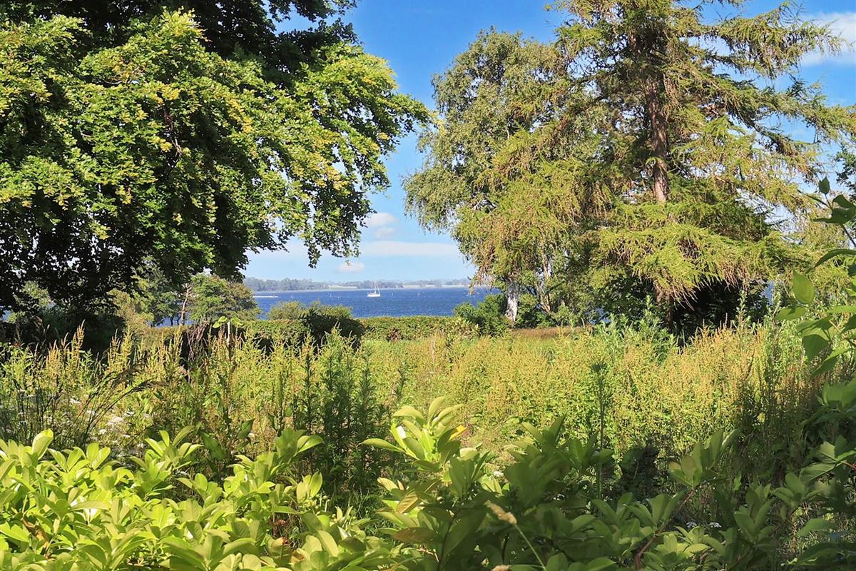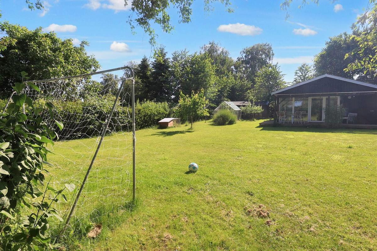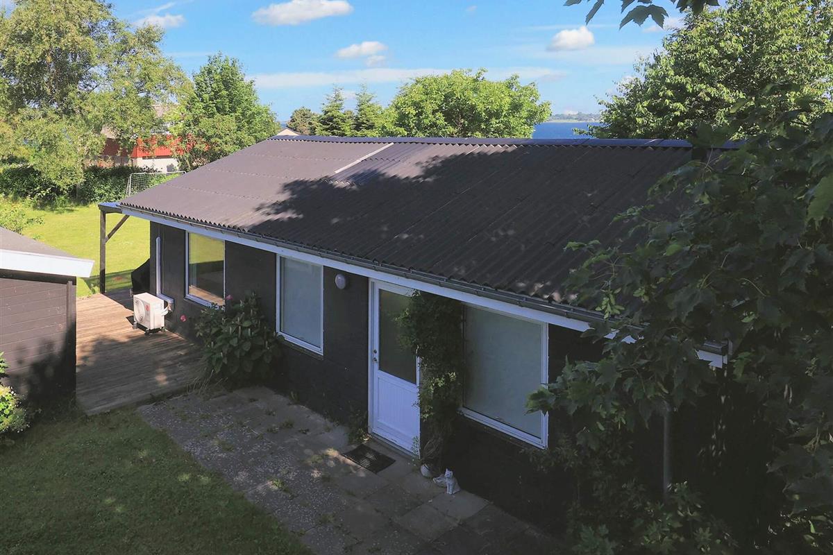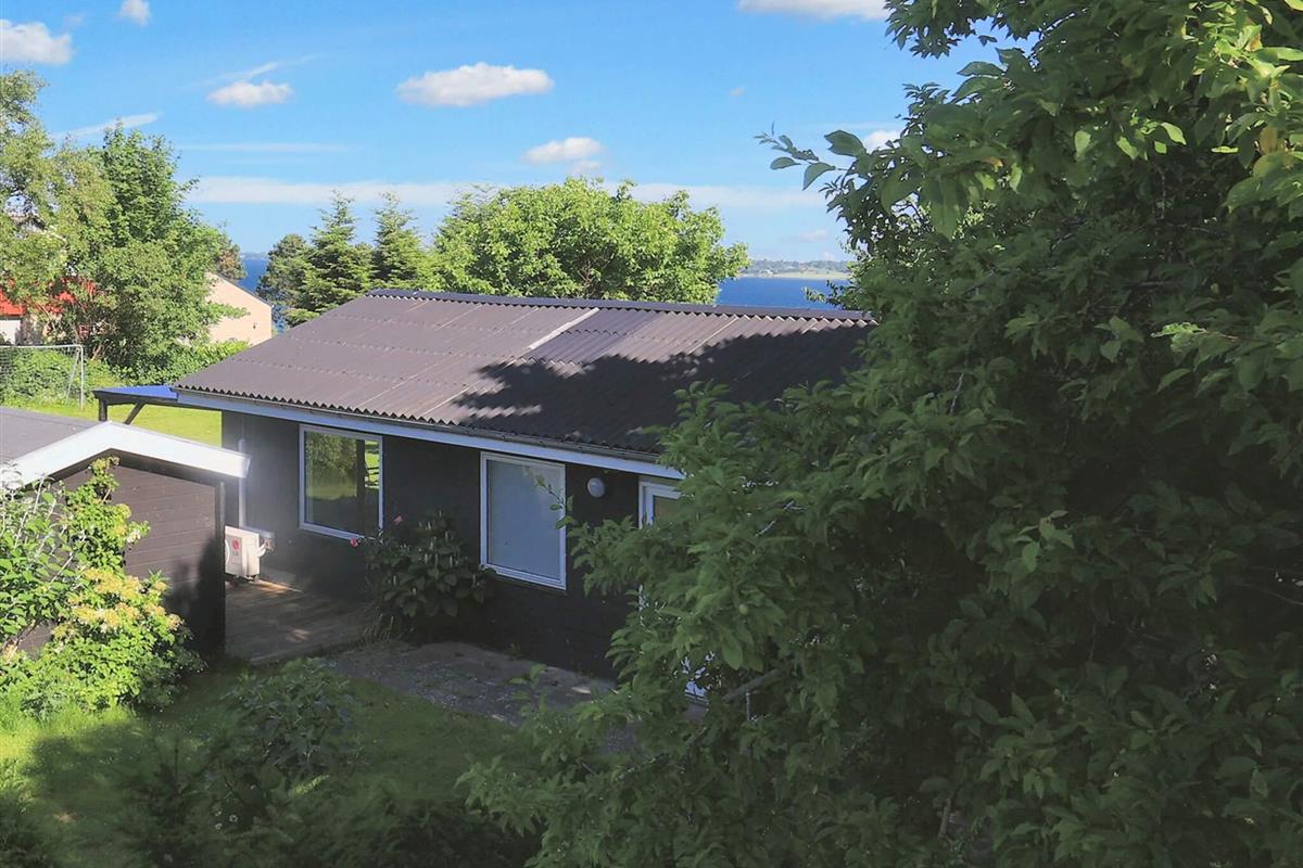 Vom Wohnzimmer aus können Sie direkt auf die teils überdachte Holzterrasse gehen und die Sonne in den Gartenmöbeln genießen oder auf dem Holzkohlegrill grillen. Das Ferienhaus steht auf einem Naturgrundstück von 1.202 m2 Größe mit Blick zum Grønsund und Platz für Spiel und Spaß.