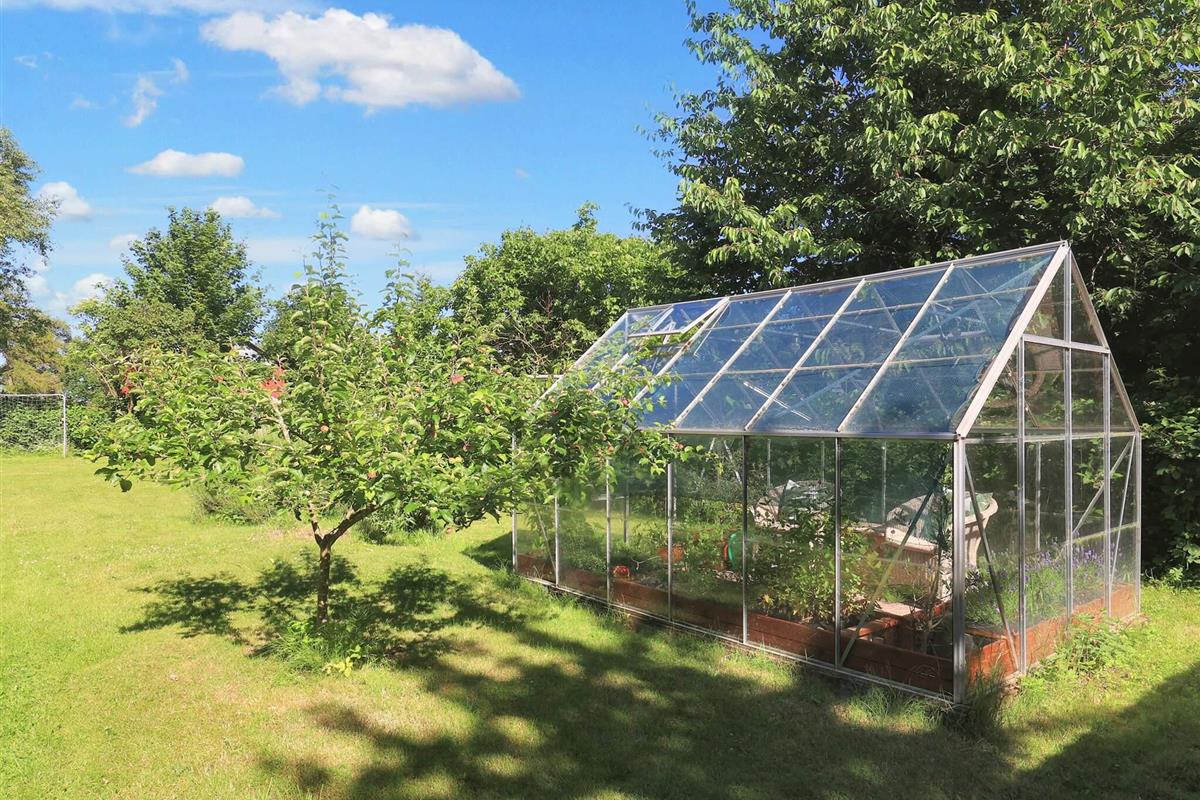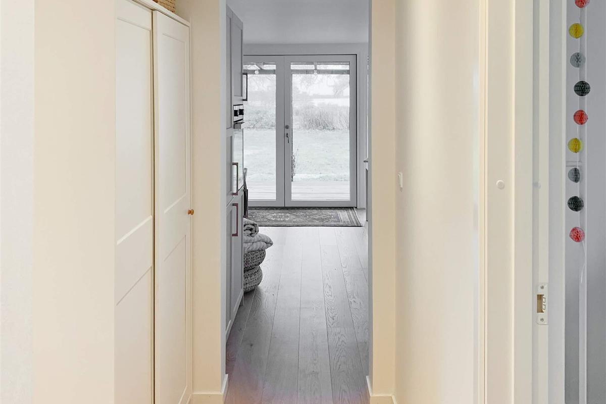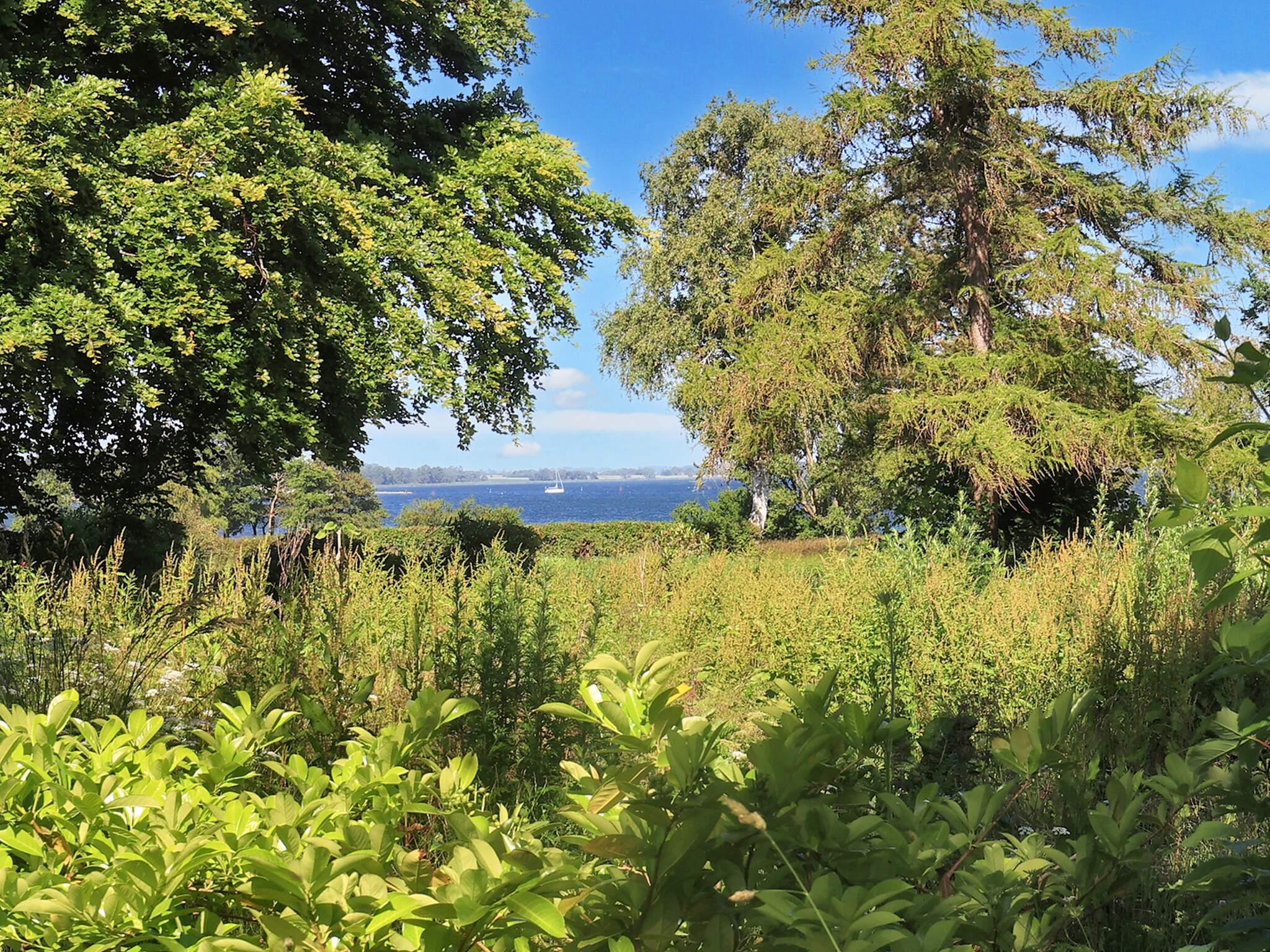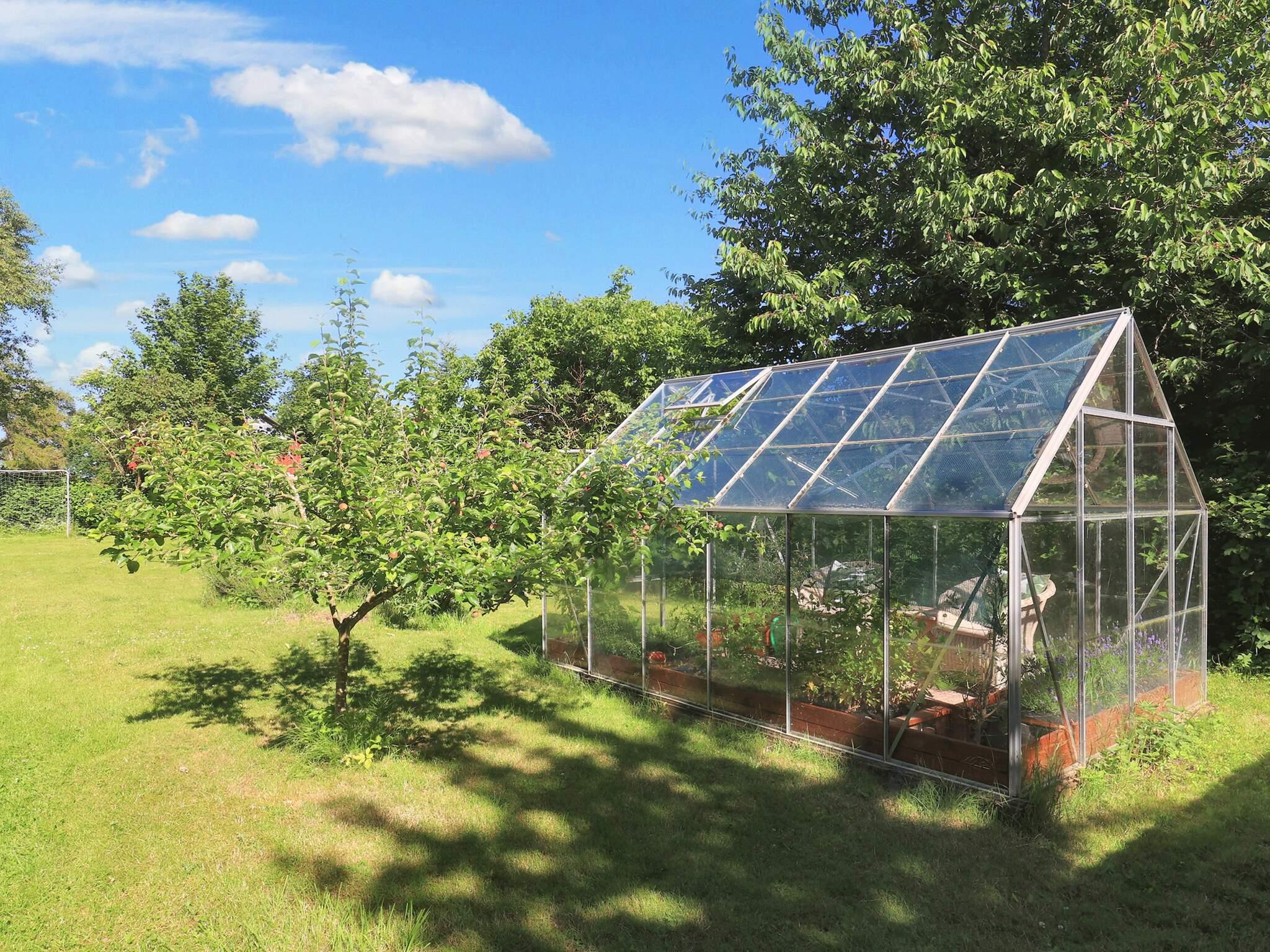 Vom Wohnzimmer aus können Sie direkt auf die teils überdachte Holzterrasse gehen und die Sonne in den Gartenmöbeln genießen oder auf dem Holzkohlegrill grillen. Das Ferienhaus steht auf einem Naturgrundstück von 1.202 m2 Größe mit Blick zum Grønsund und Platz für Spiel und Spaß.