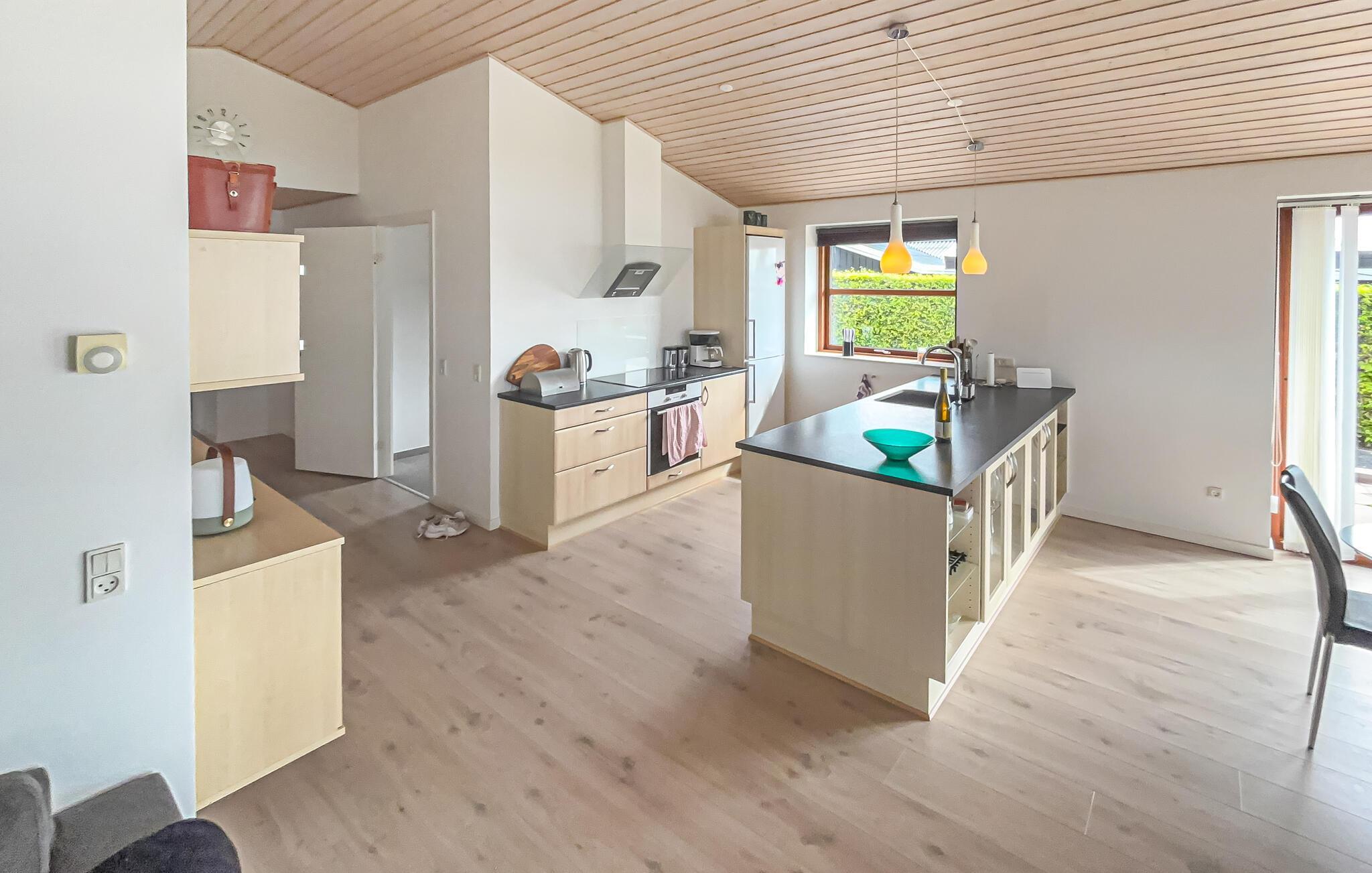Beleef een ontspannen vakantie in dit lichtovergoten huis, dat u rust, comfort en een prachtig uitzicht biedt. Je vakantiehuis ligt direct aan Sunds Sø en combineert stijlvol wonen met een unieke ligging aan het water. Kom binnen in de ruime woonkamer en geniet van het open ontwerp met hoge plafonds en grote ramen met uitzicht op het meer. Maak het jezelf gemakkelijk op de bank of fauteuils of geniet van je maaltijden aan de lange eettafel met uitzicht op de natuurlijke omgeving. De open keuken is modern uitgerust en nodigt uit om samen te koken.