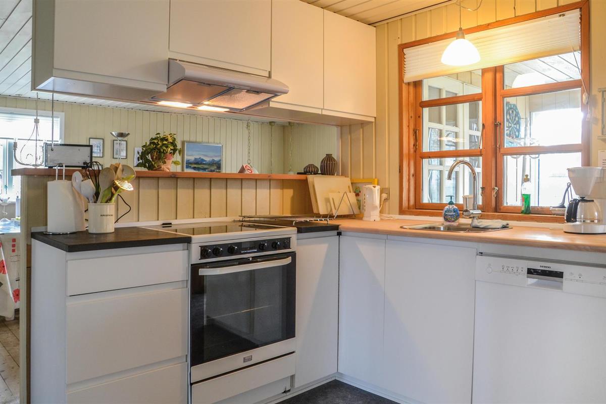 In de gezellige keuken zorgt de houtkachel voor een gezellige sfeer op koele dagen.