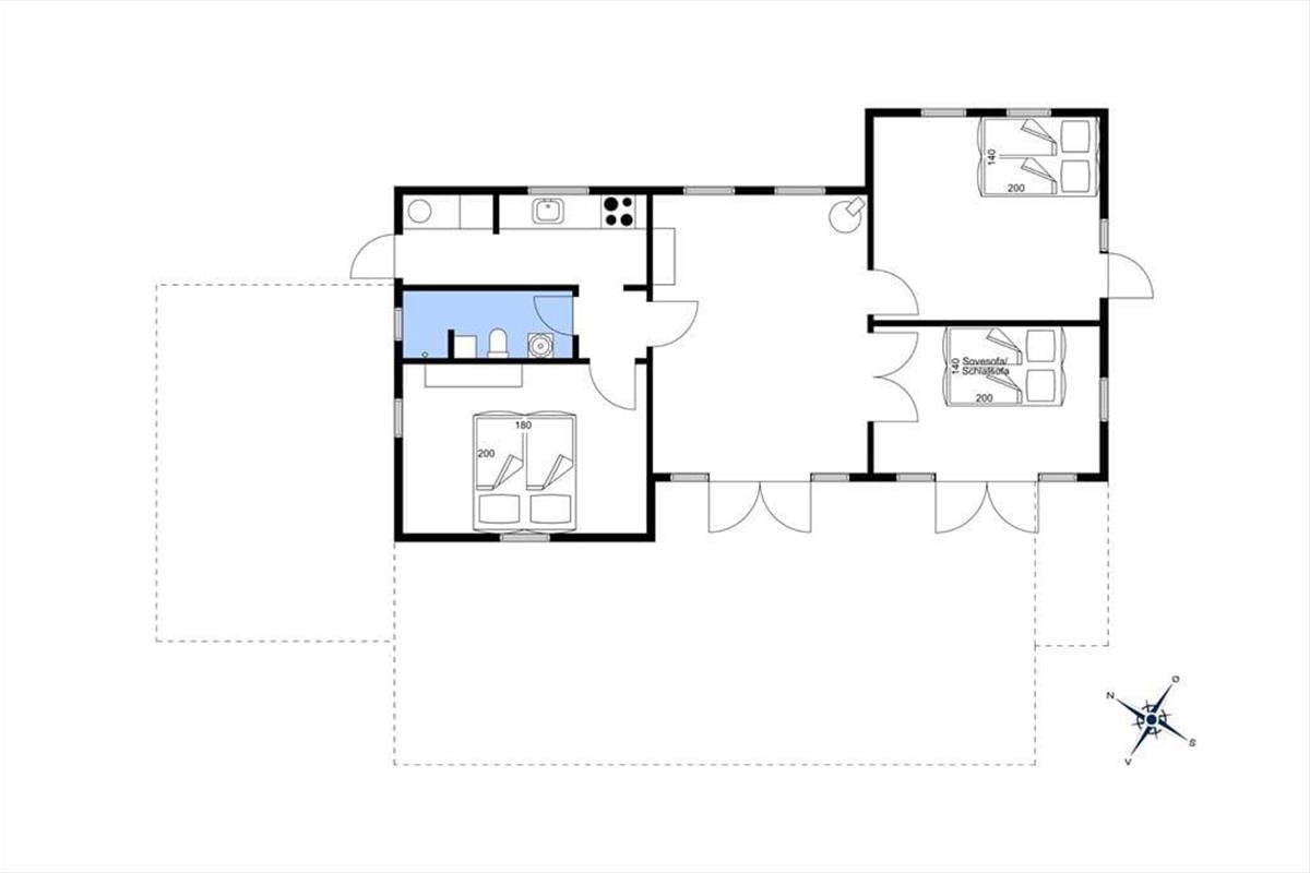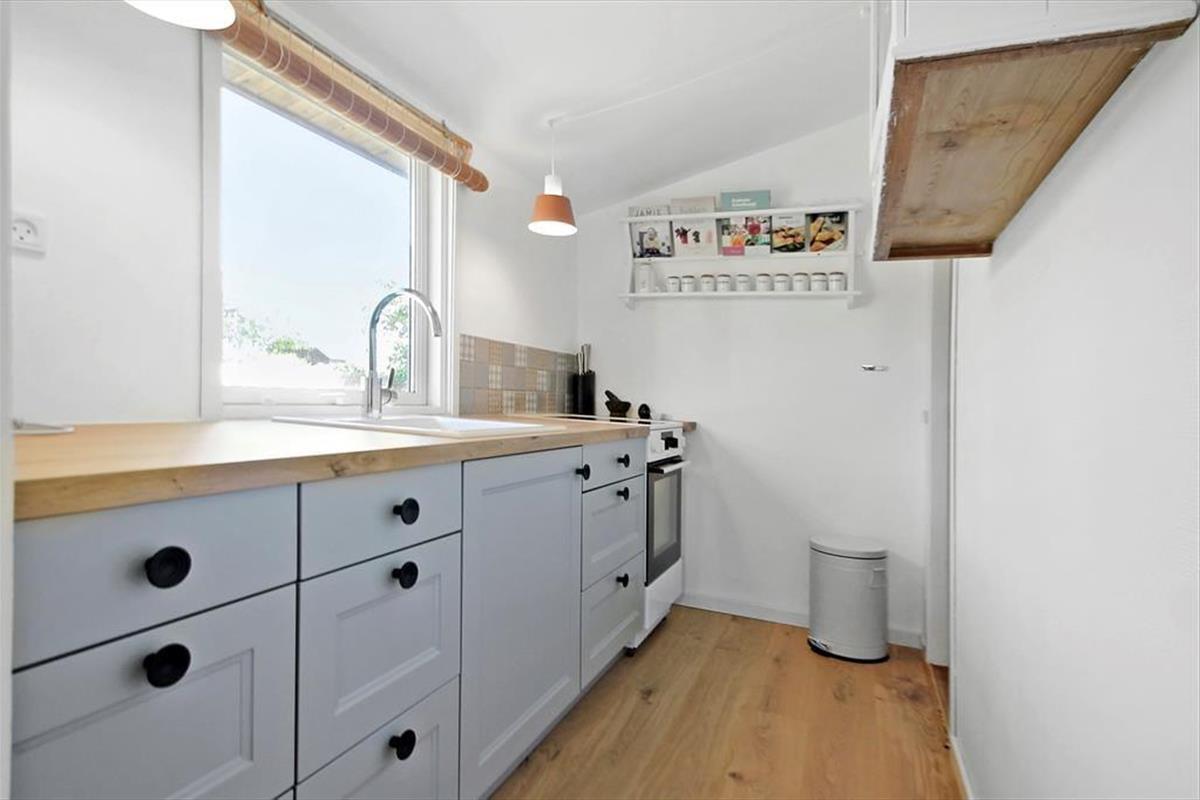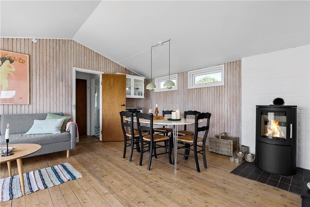 Kleine Küche, die mit weißen Elementen, Herd und Kühl- Gefrierschrank ausgestattet ist. Wohnzimmer mit gemütlicher Sofaecke, TV, Essplatz und Kaminofen. Von hier aus gelangt man auf die Terrasse und hat eine fantastische Aussicht auf das Meer. Badezimmer mit Duschnische und Fußbodenheizung. 3 Schlafzimmer, zwei mit Doppelbetten und ein mit ein Dobbelten Schlafcouch. Heizung des Hauses erfolgt durch Wärmepumpe, Kaminofen und elektrische Heizung.