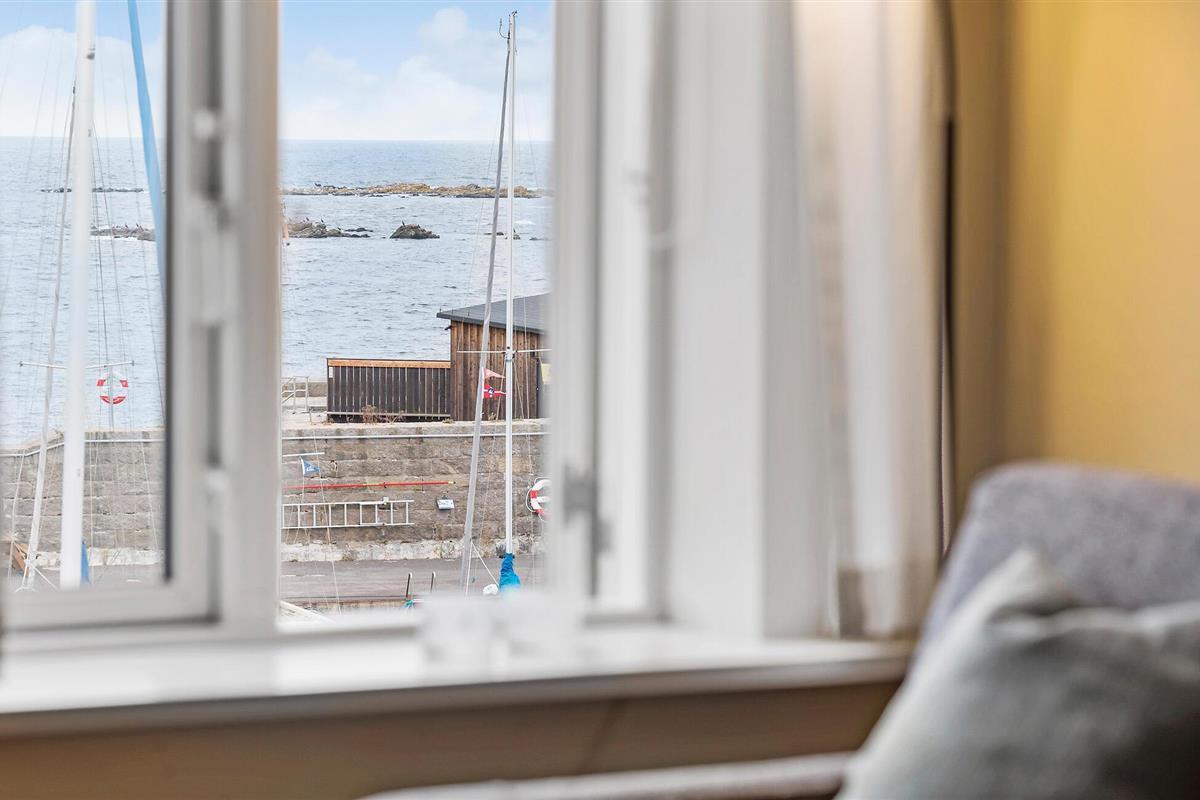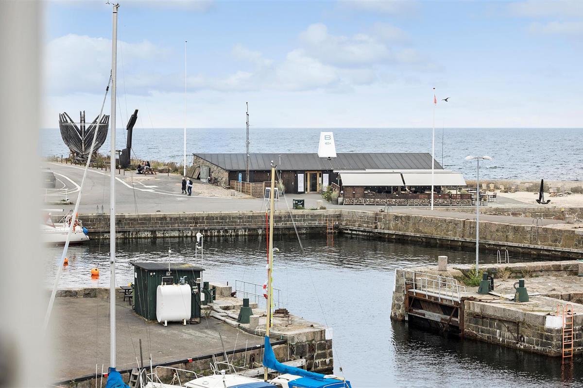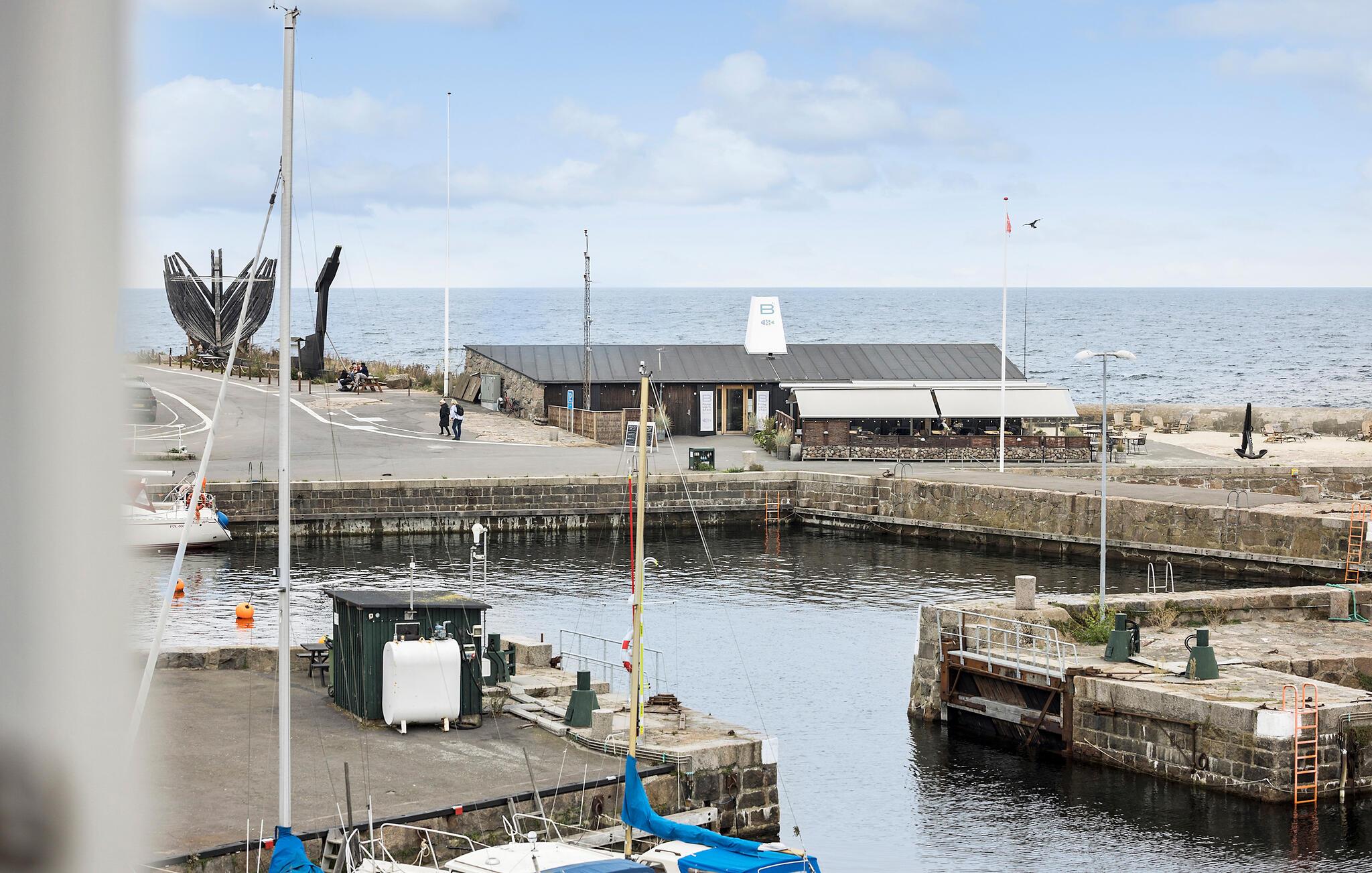 Ontspan in een stijlvol appartement aan de haven van Svaneke met zeezicht en gedeeld verwarmd zwembad.