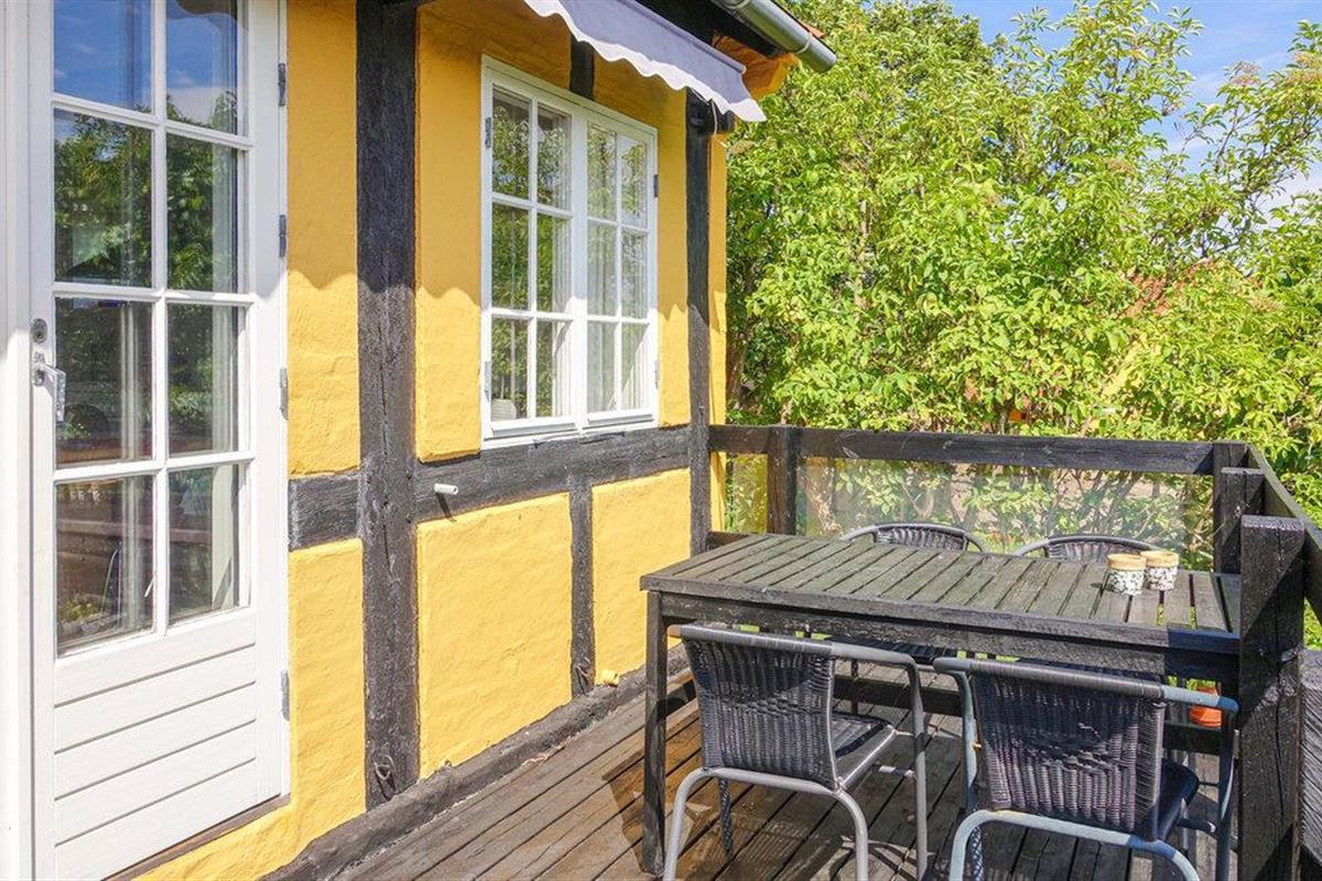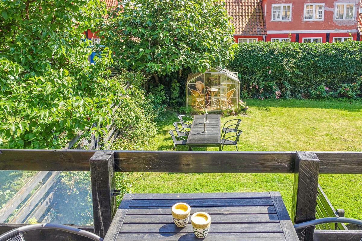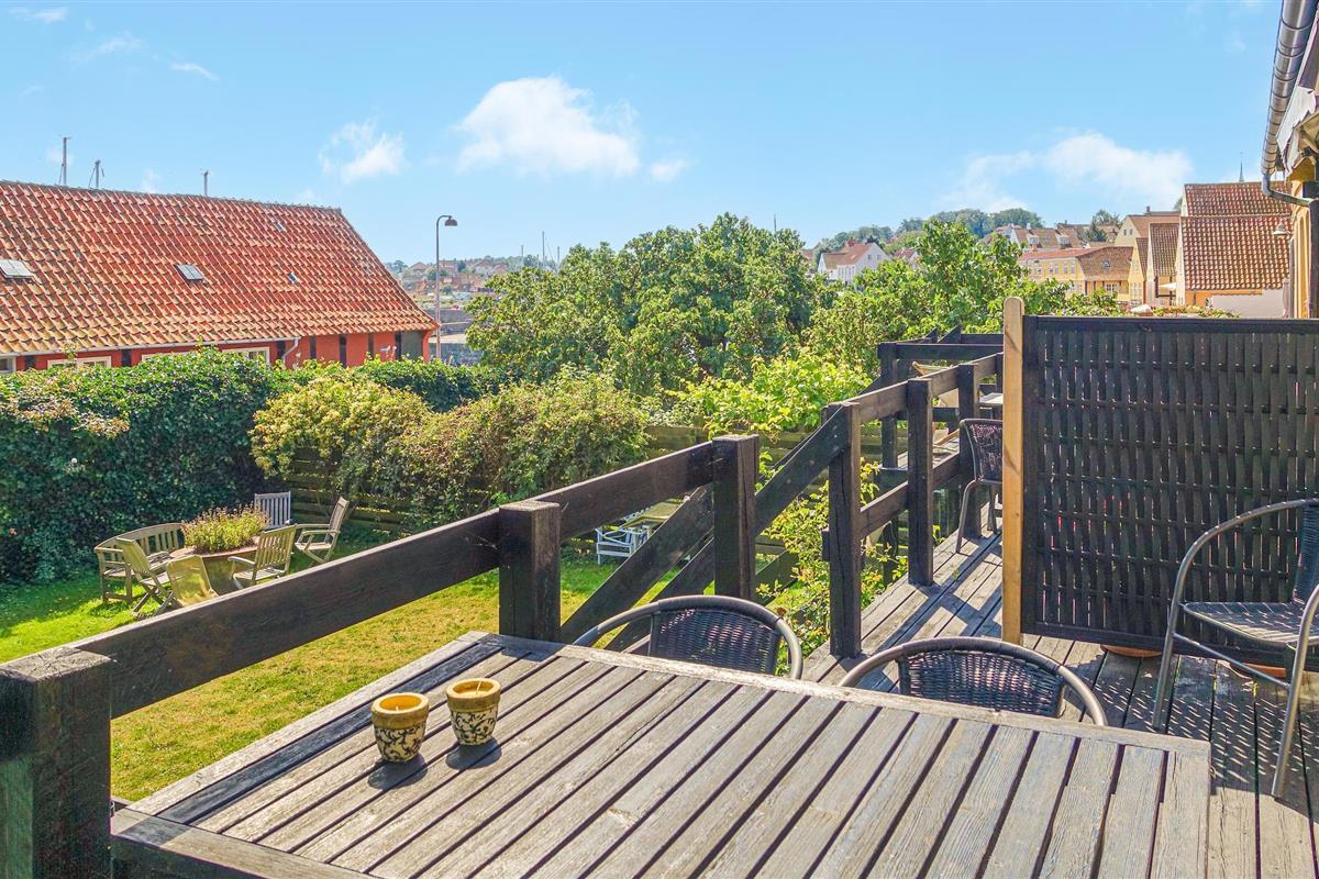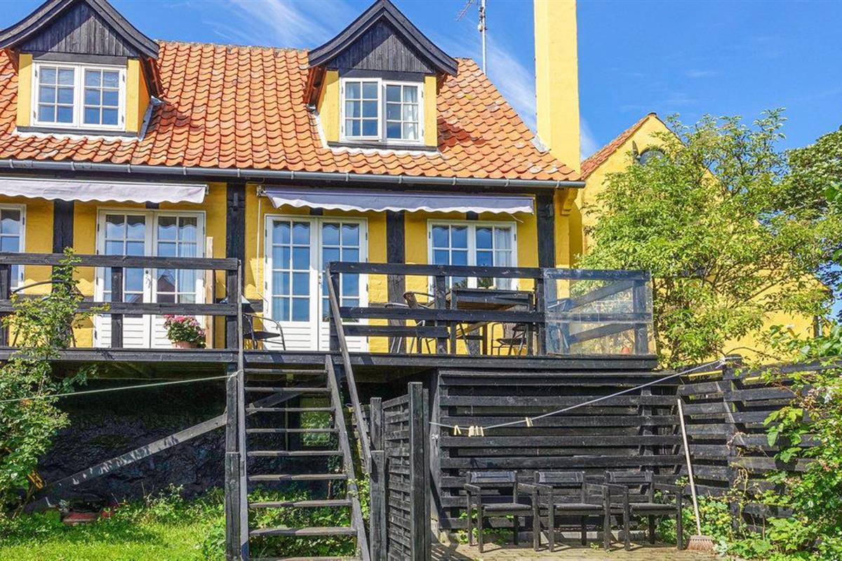 Sfeervol vakantieappartement aan de haven van Svaneke met deels zeezicht en houten terras.
