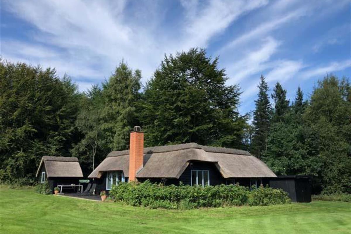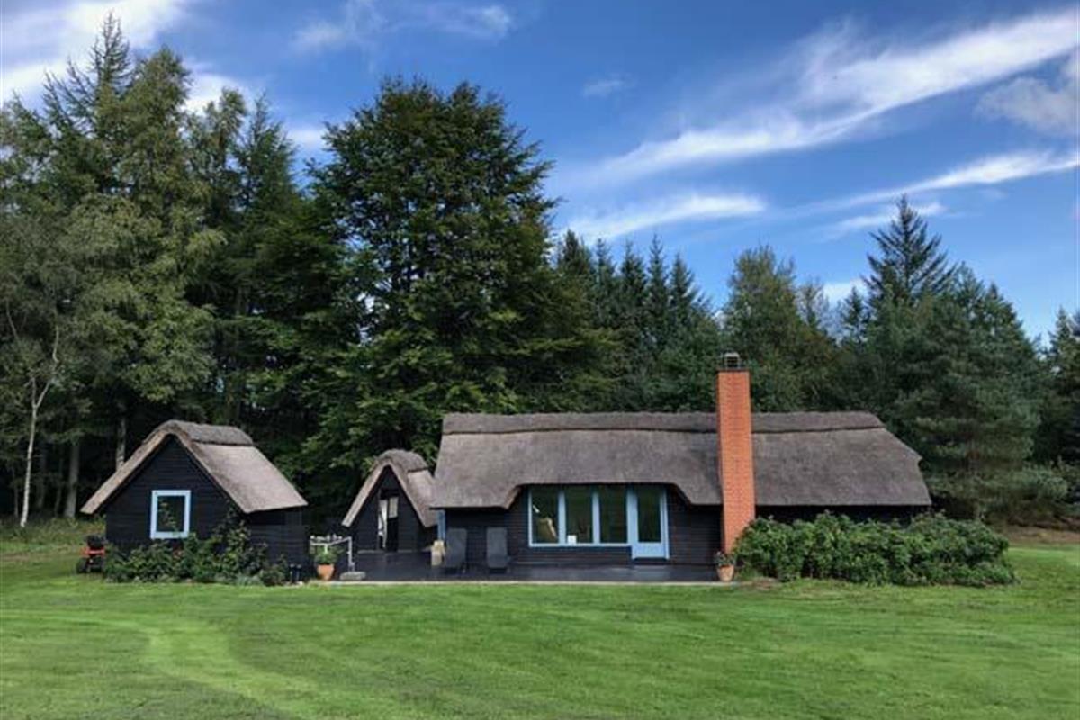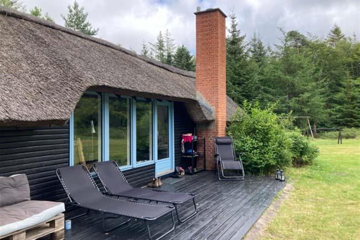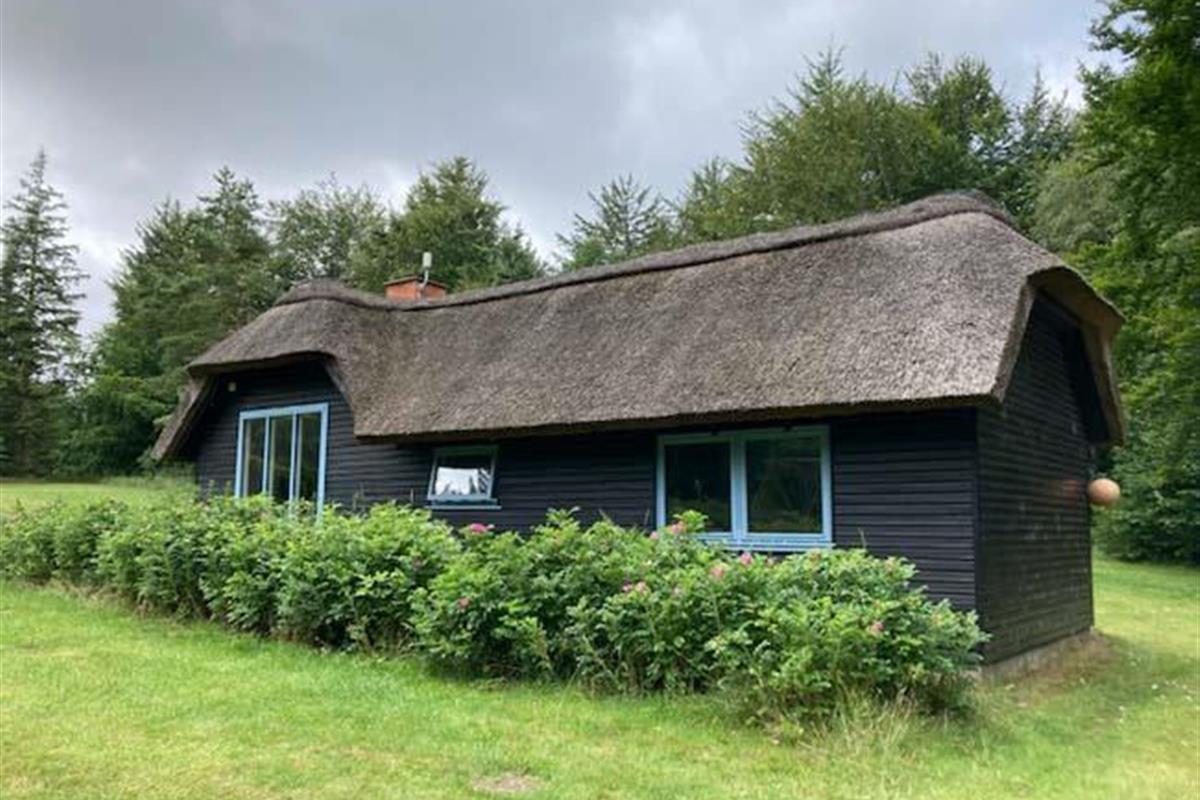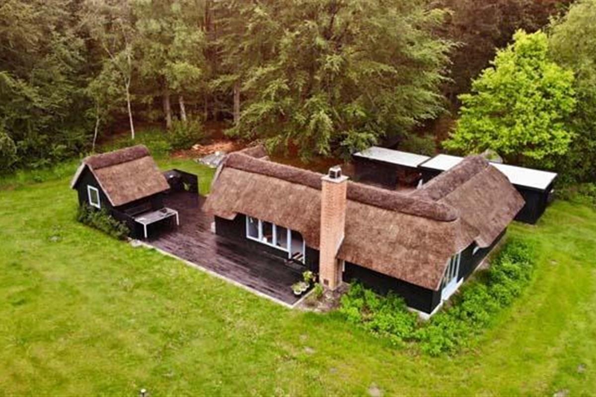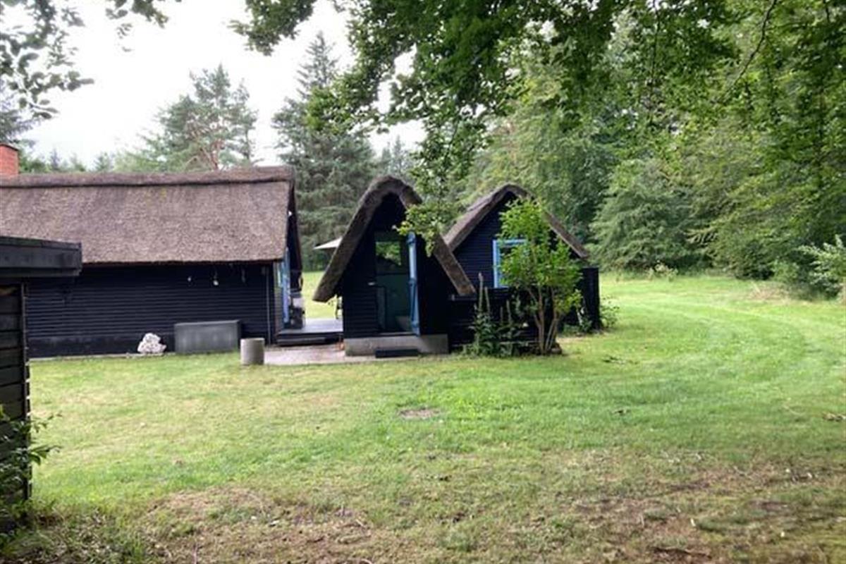 Ude midt i skoven, på en stor lysning ligger dette eventyrligt spændende stråtækte sommerhus. Huset ligger på 65.000 m naturgrund, hvoraf et stort område foran huset er græs, hvor der en stille aften græsser rådyr. Der er ”ud i grunden” mange slåede stier, så man kan blive ledt rundt mellem lyng, enebær, bjergfyr og høje træer, - måske møde nogle af skovens dyr. Nær huset er det bygget et TRÆTOPHUS hvor der også er 2 sovepladser samt et shelter med plads til 3-4 personer, - således er der rig mulighed for hele familien kan overnatte ude, - - - eller hygge omkring bålplads, trampolin, gynge osv.
