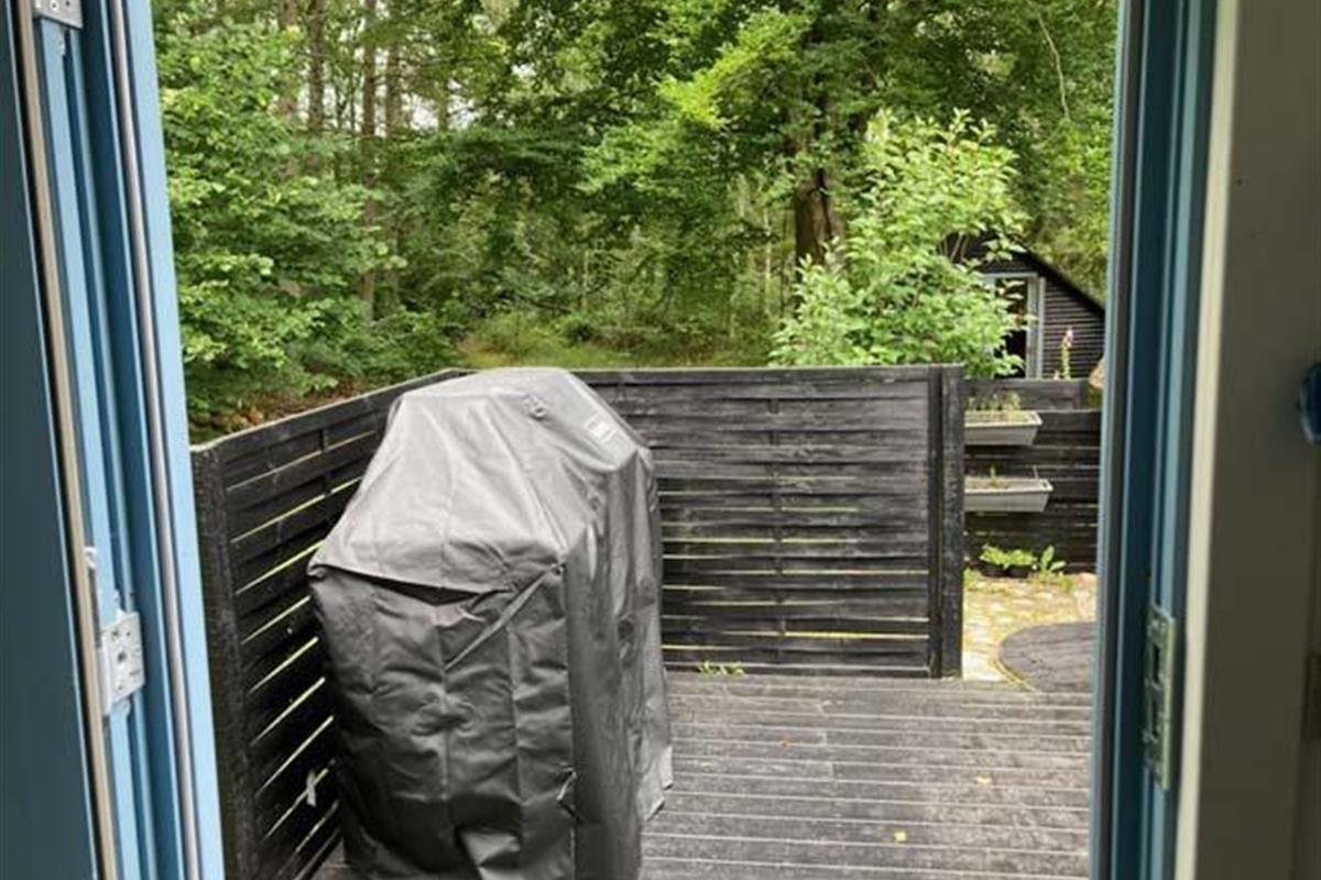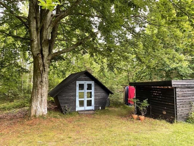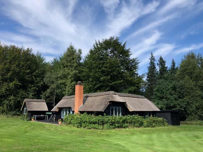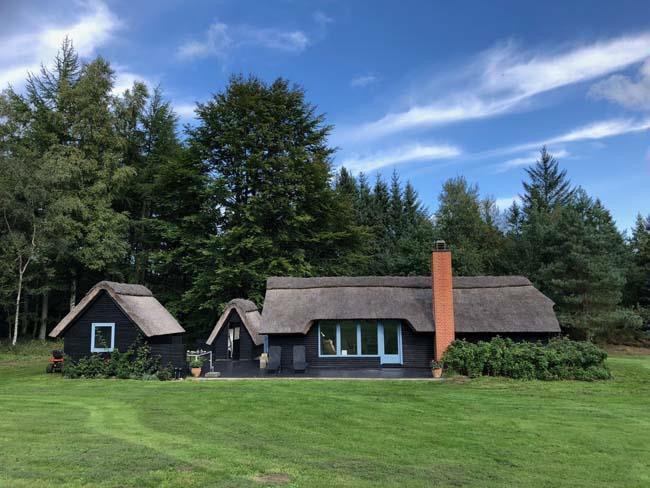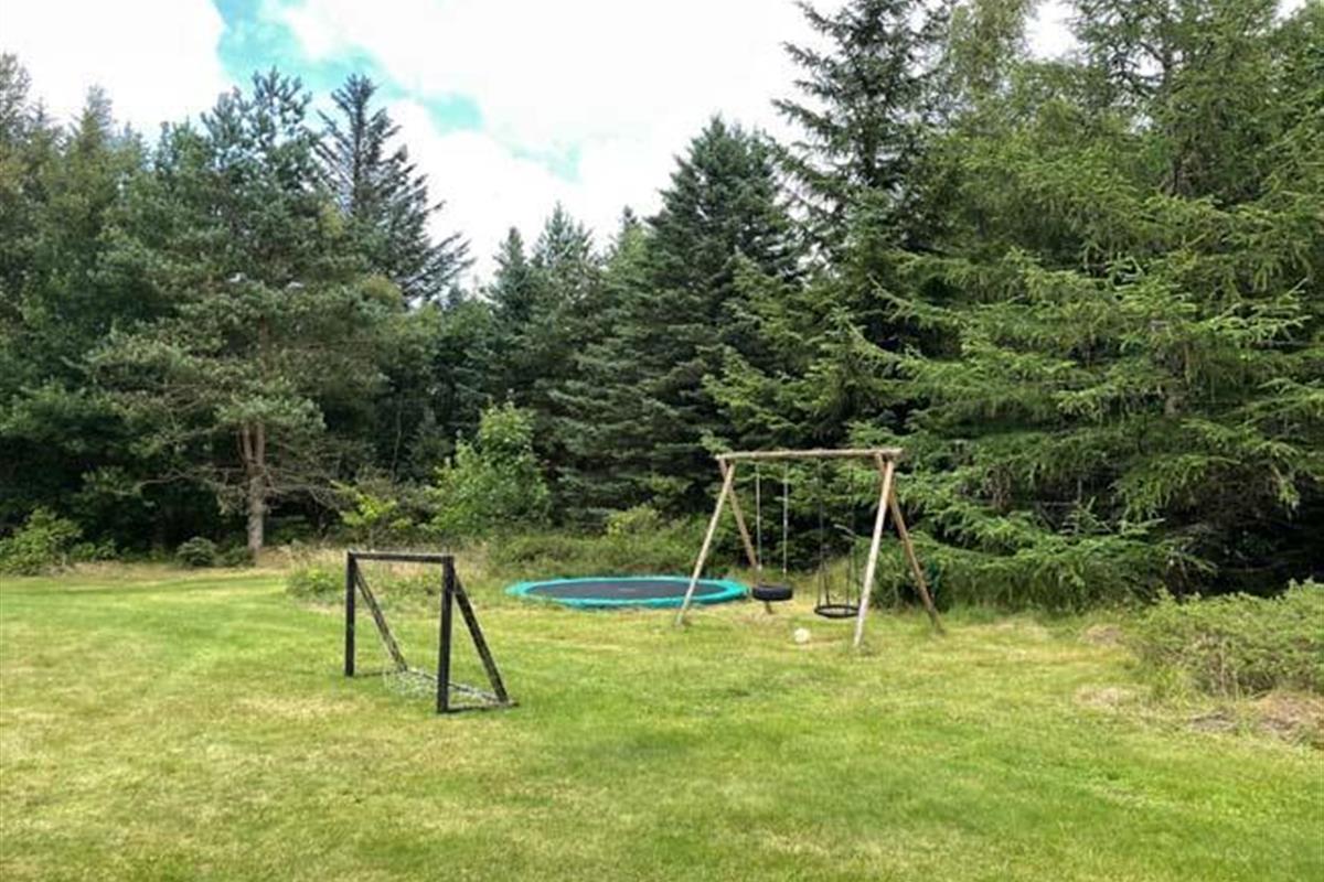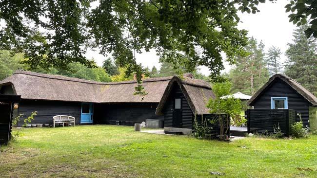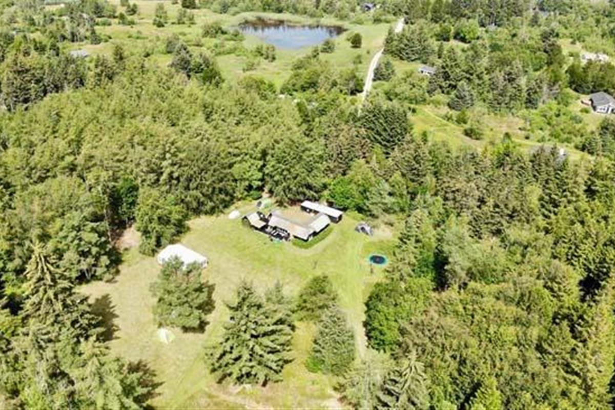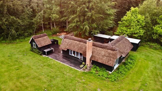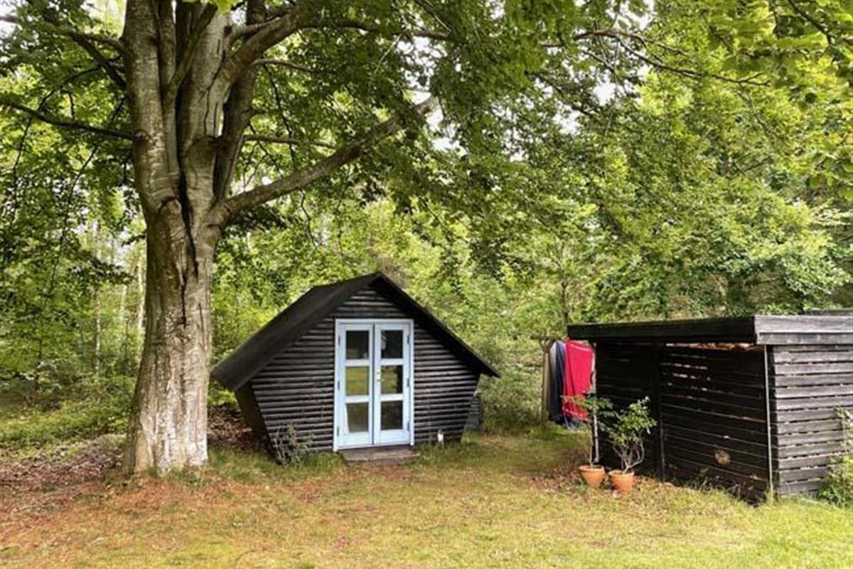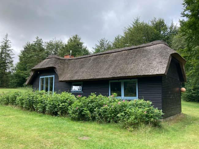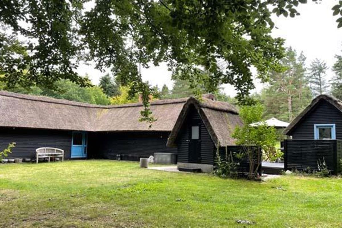 Ude midt i skoven, på en stor lysning ligger dette eventyrligt spændende stråtækte sommerhus. Huset ligger på 65.000 m naturgrund, hvoraf et stort område foran huset er græs, hvor der en stille aften græsser rådyr. Der er ”ud i grunden” mange slåede stier, så man kan blive ledt rundt mellem lyng, enebær, bjergfyr og høje træer, - måske møde nogle af skovens dyr. Nær huset er det bygget et TRÆTOPHUS hvor der også er 2 sovepladser samt et shelter med plads til 3-4 personer, - således er der rig mulighed for hele familien kan overnatte ude, - - - eller hygge omkring bålplads, trampolin, gynge osv.
