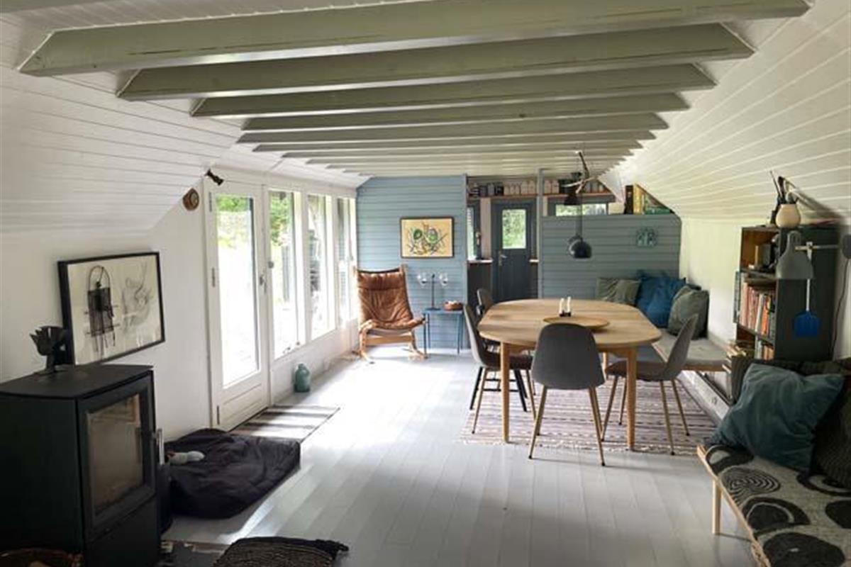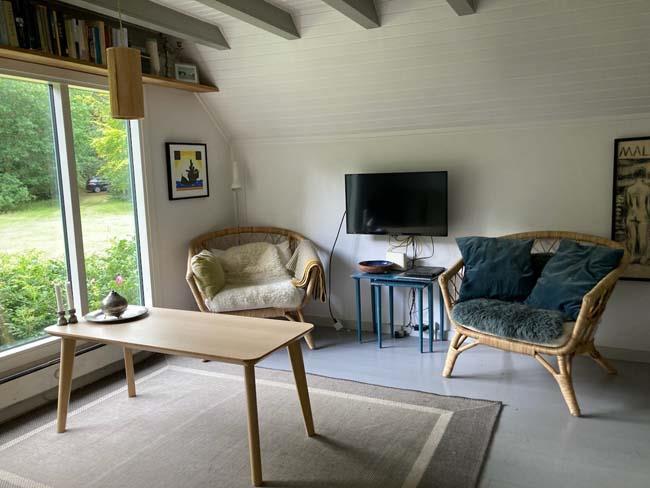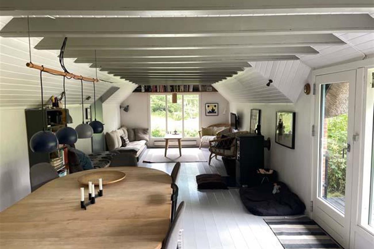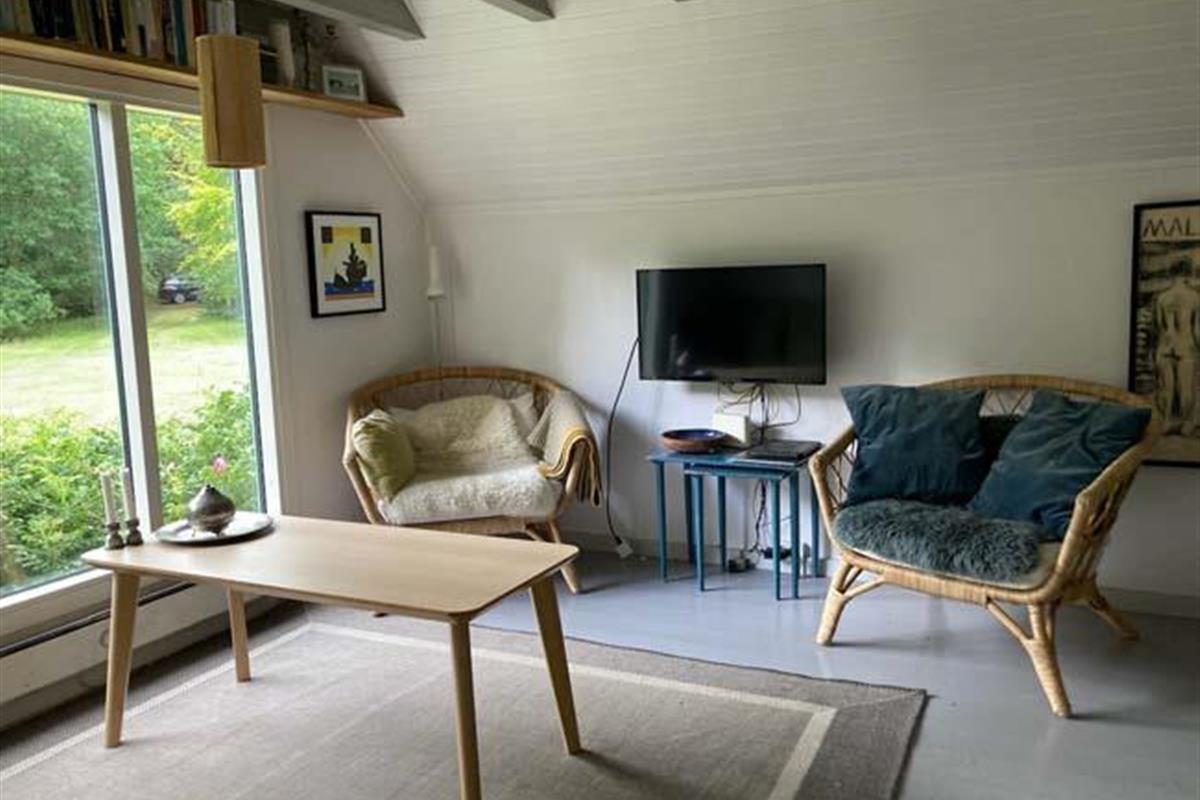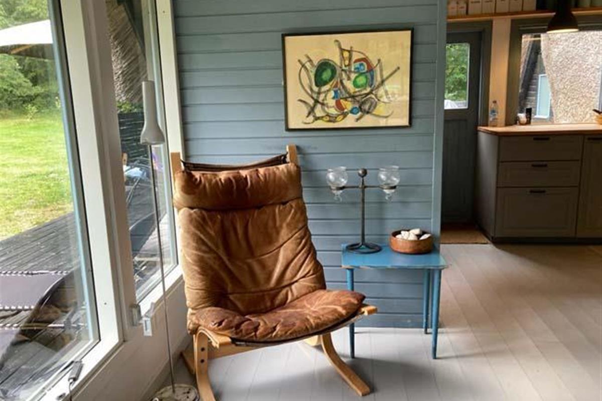 Den fantastisk dejlige stue har mange mange hyggelige siddepladser i forskellige varianter, - således er der rig mulighed for at læse, spille spil eller ”bare” sidde/ligge og nyde de dejlige omgivelser og skønne lysindfald.