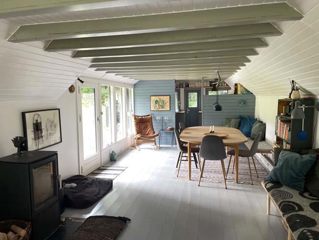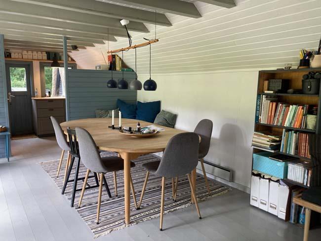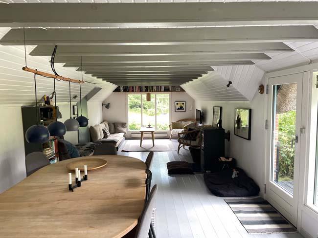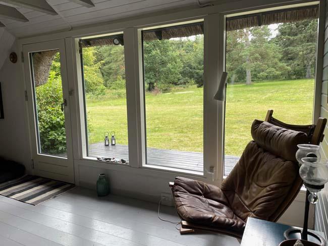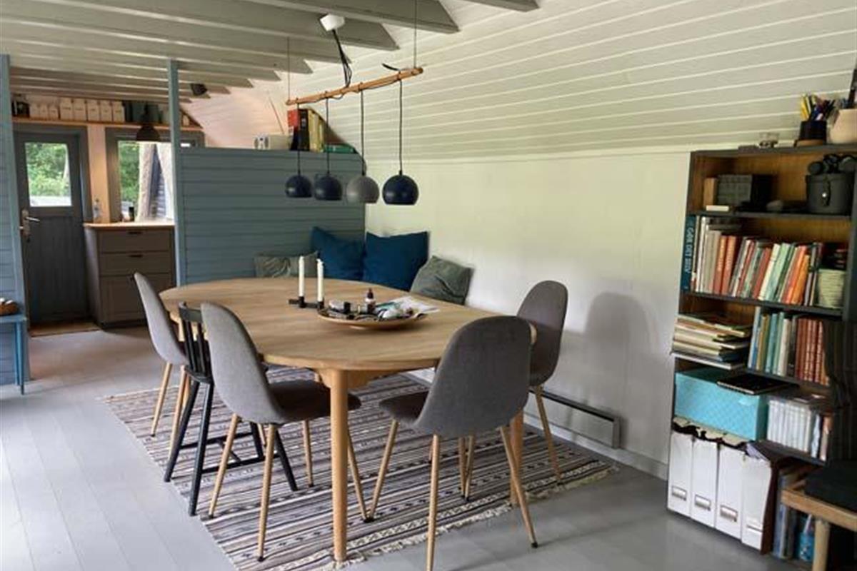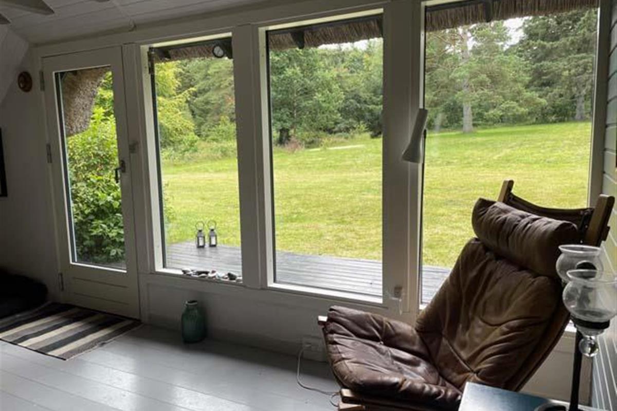 Den fantastisk dejlige stue har mange mange hyggelige siddepladser i forskellige varianter, - således er der rig mulighed for at læse, spille spil eller ”bare” sidde/ligge og nyde de dejlige omgivelser og skønne lysindfald.