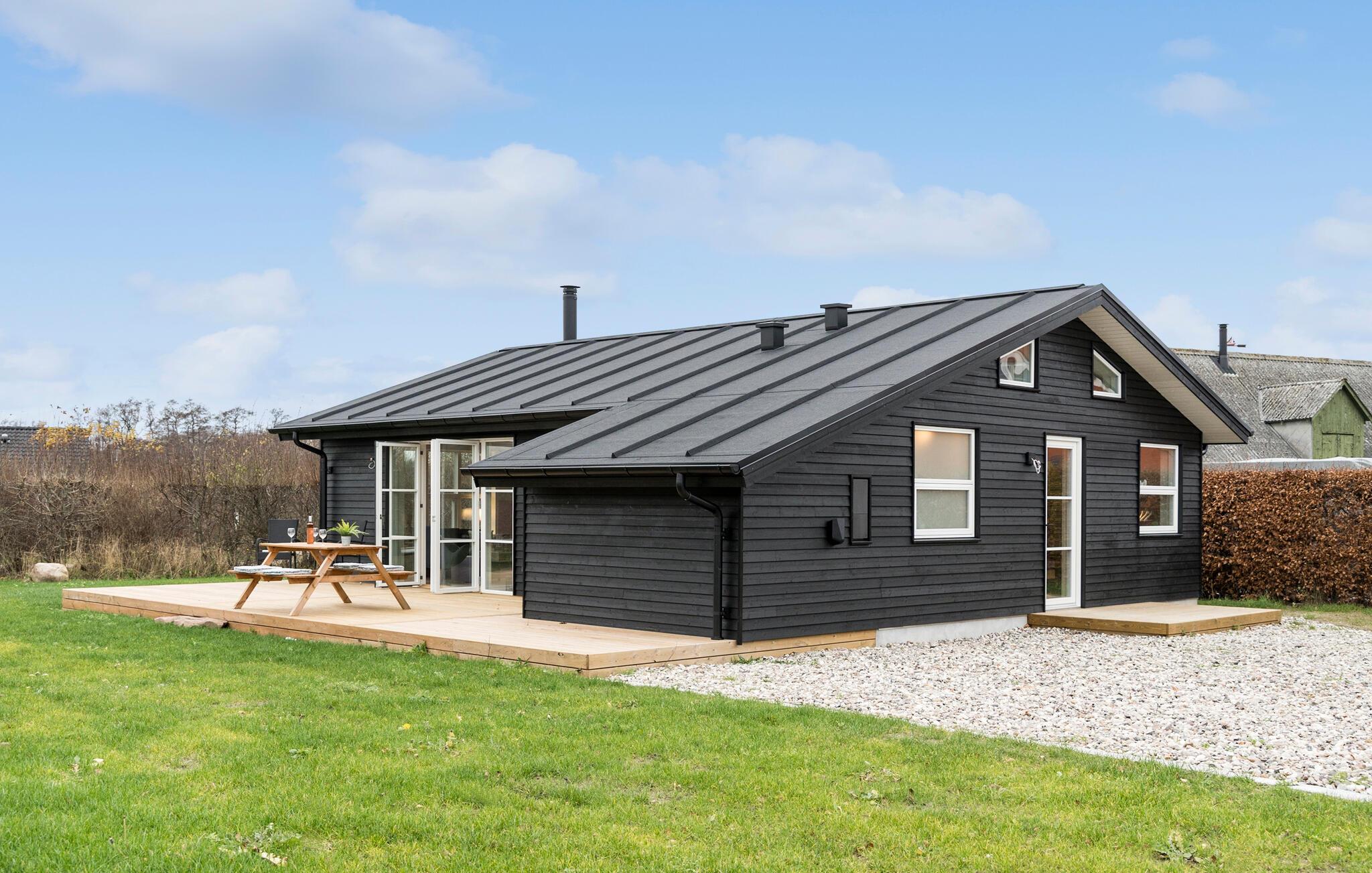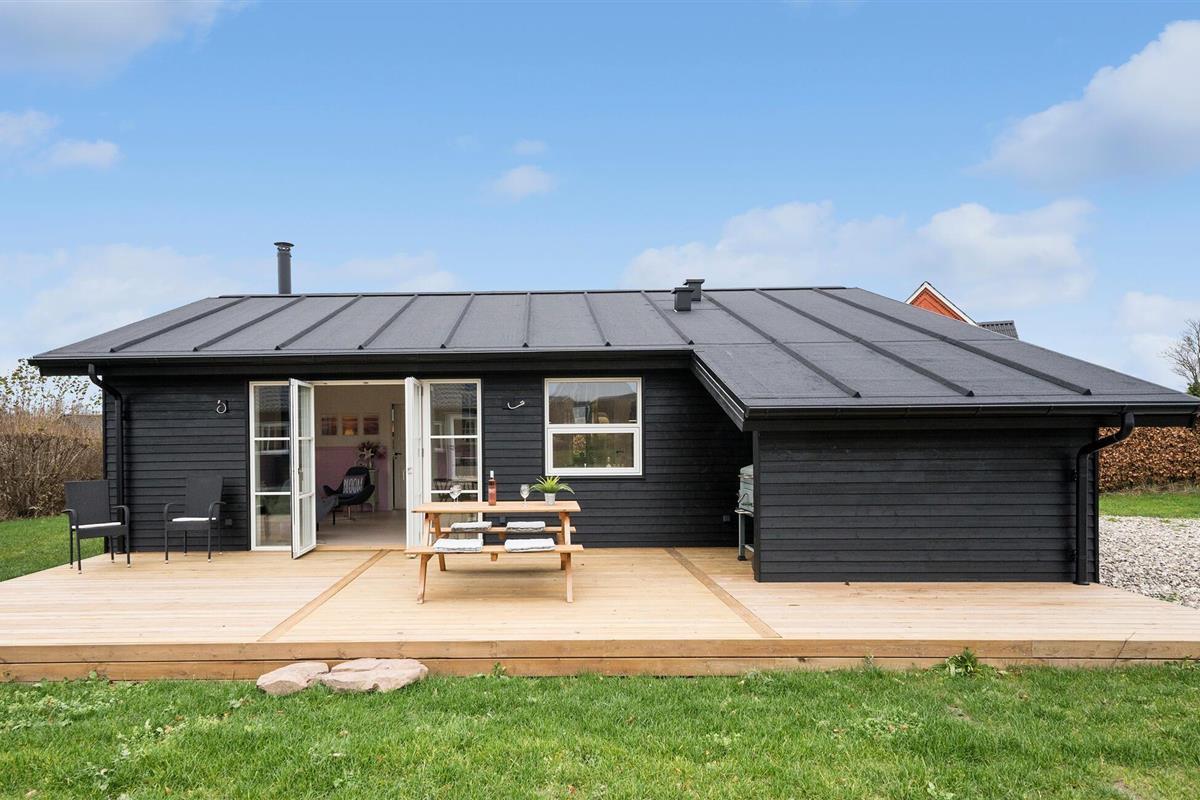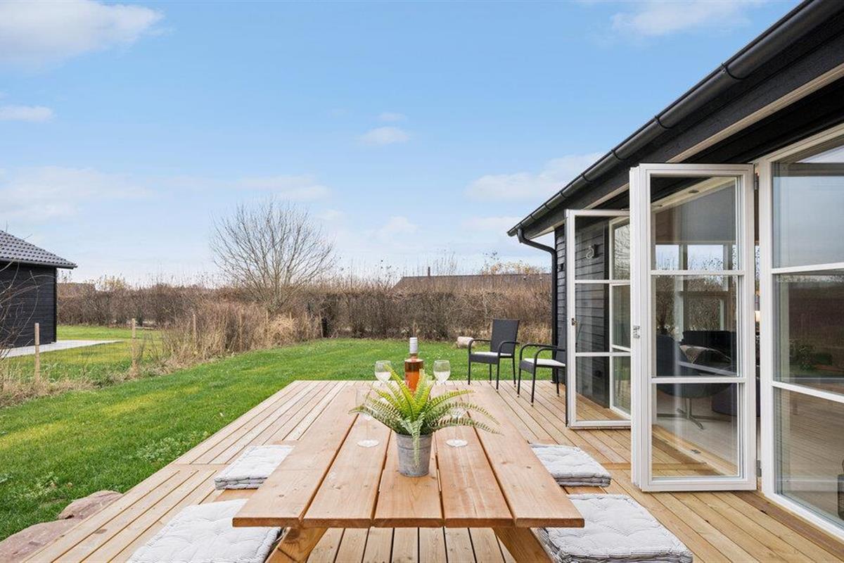 Modern vakantiehuis in Tårup Strand met groot houten terras en stijlvolle inrichting, ideaal voor een ontspannen gezinsvakantie.
