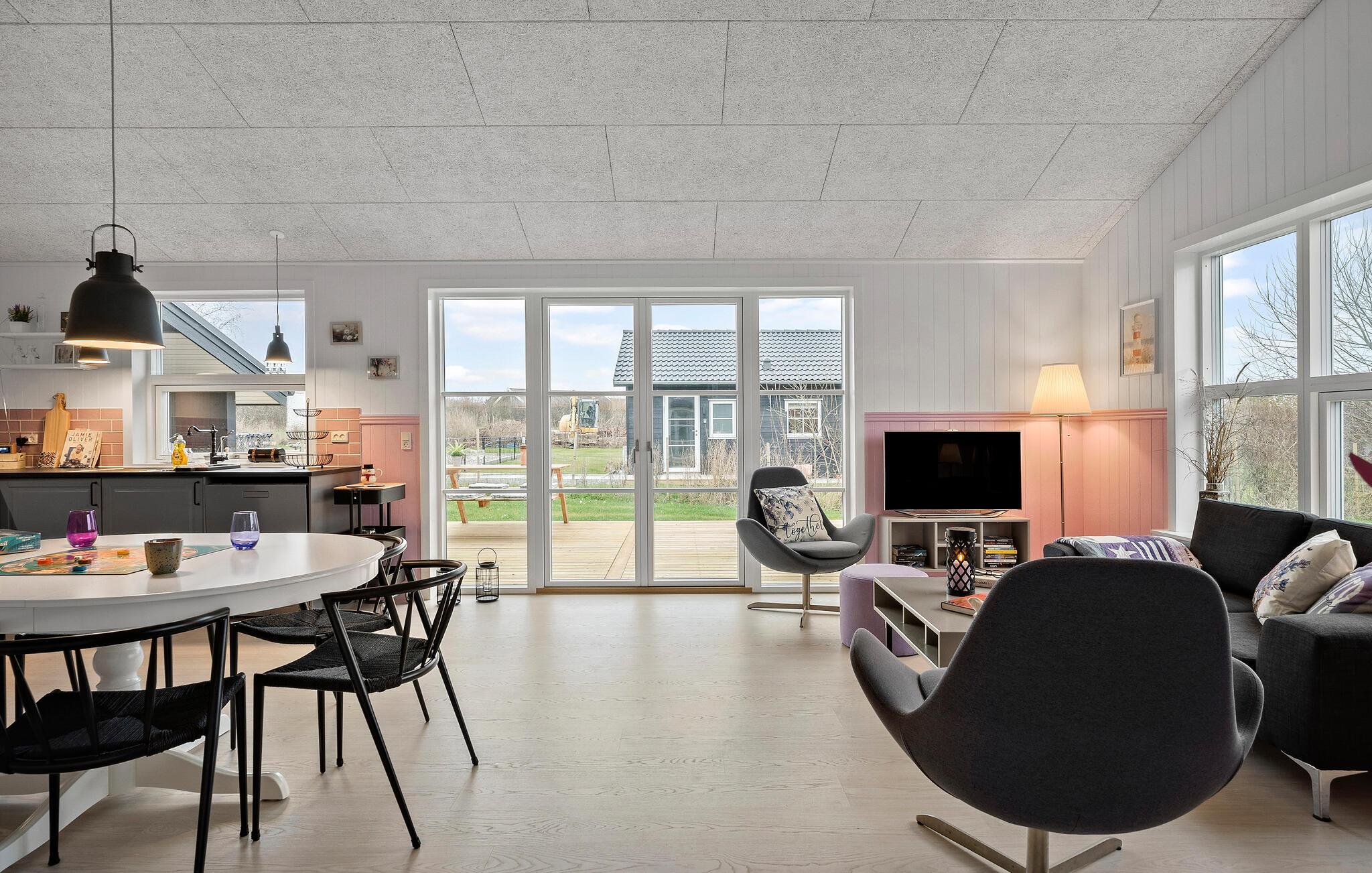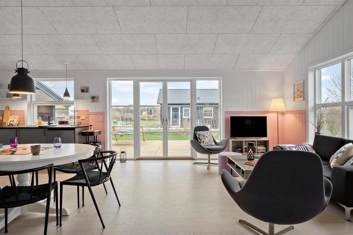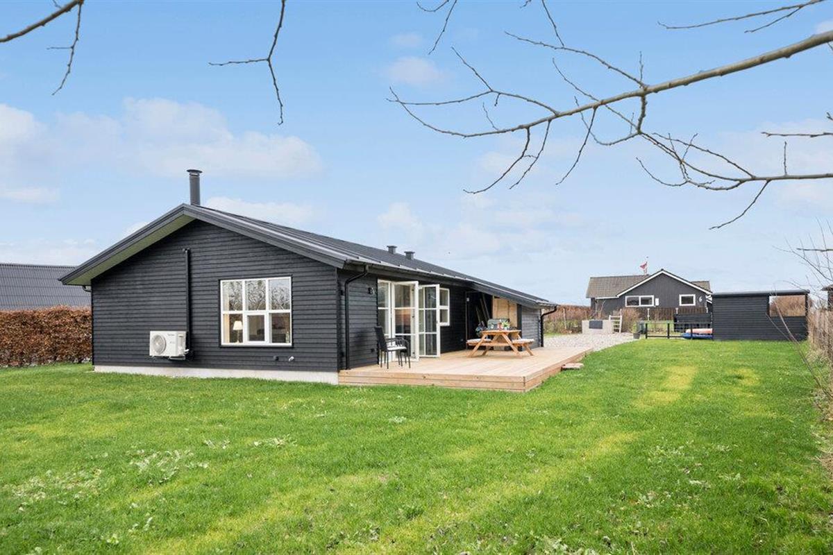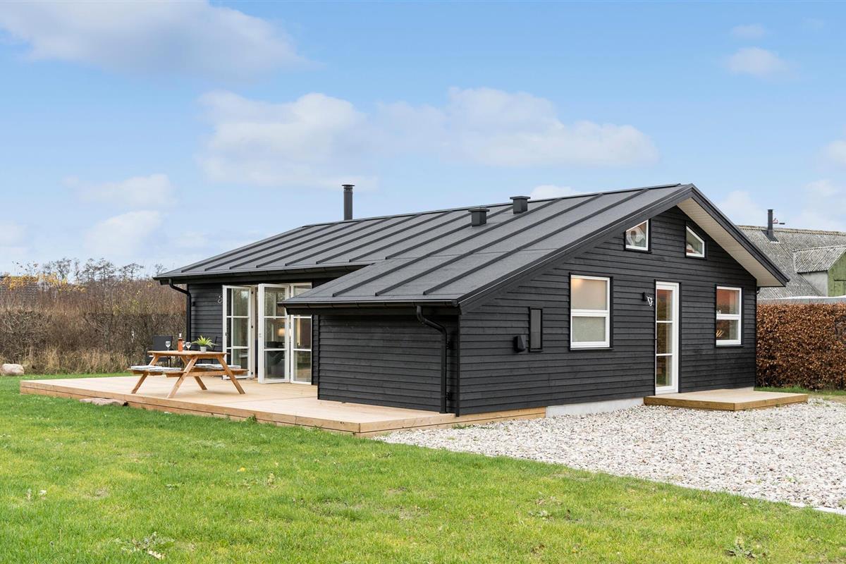 Modern vakantiehuis in Tårup Strand met groot houten terras en stijlvolle inrichting, ideaal voor een ontspannen gezinsvakantie.
