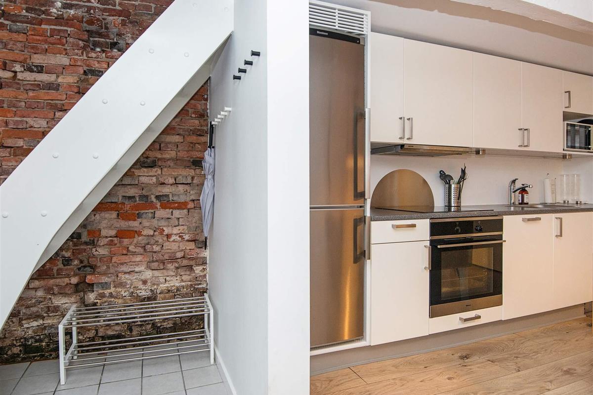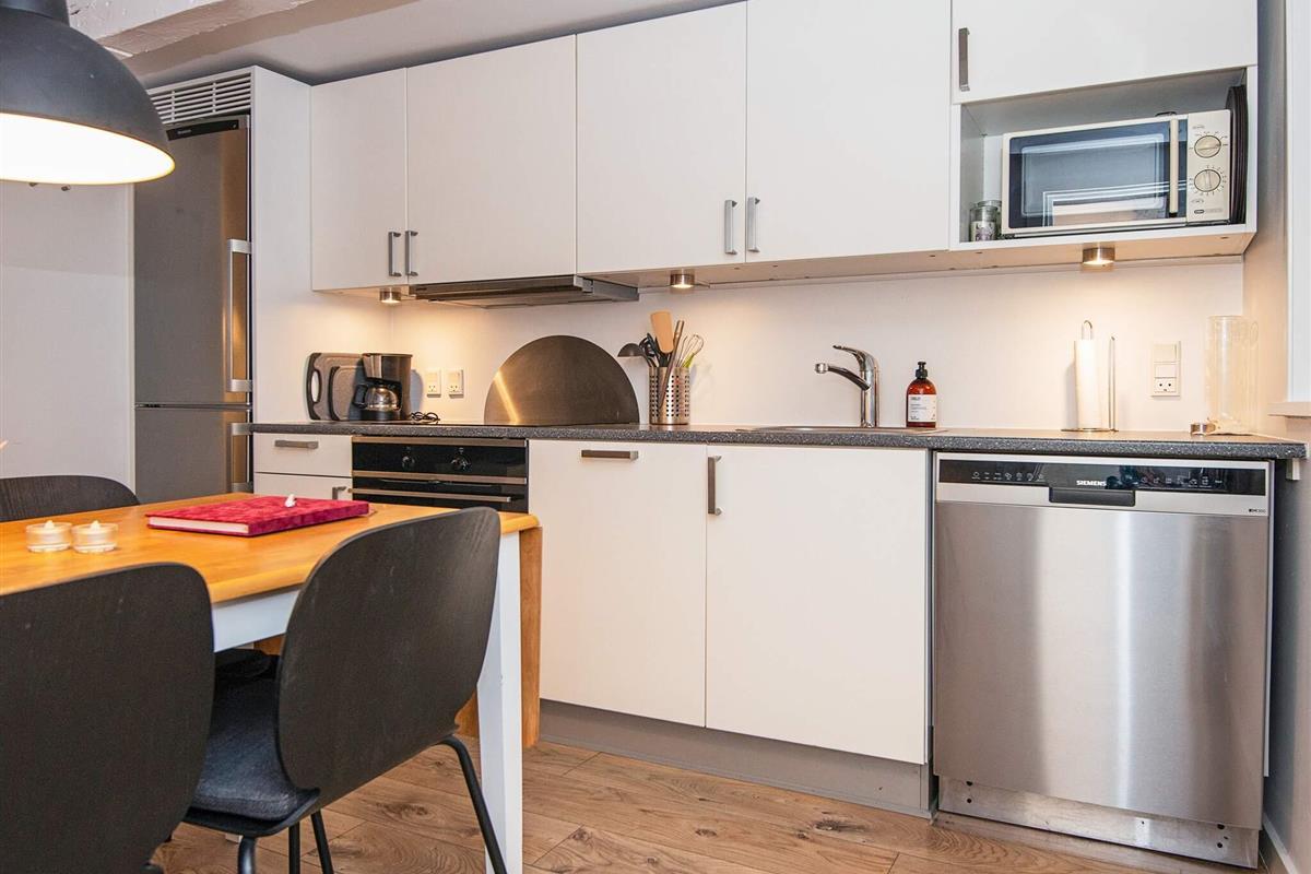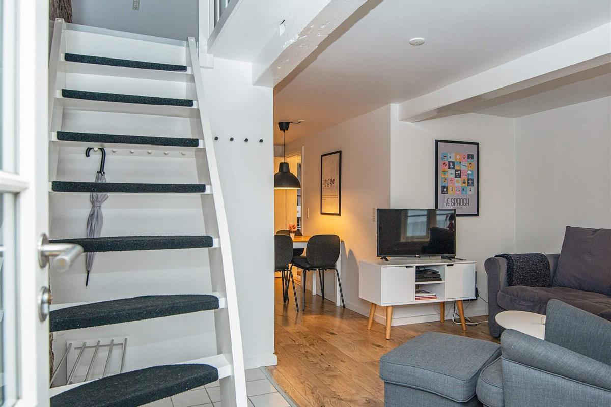 Im Erdgeschoss befinden sich ein kleiner Eingangsbereich mit Stauraum für Schuhe und Oberbekleidung sowie eine helle, gut ausgestattete Küche mit Geschirrspüler und Mikrowelle, die zum Fernsehzimmer hin offen ist. Im Fernsehzimmer bietet ein Schlafsofa Platz für bis zu zwei Gäste. Das Erdgeschoss verfügt außerdem über ein voll ausgestattetes Badezimmer mit Dusche. Im Dachgeschoss befindet sich ein Schlafzimmer mit einem Doppelbett. Die gesamte Wohnung ist gepflegt, praktisch und geschmackvoll eingerichtet und sorgt für einen komfortablen Aufenthalt.