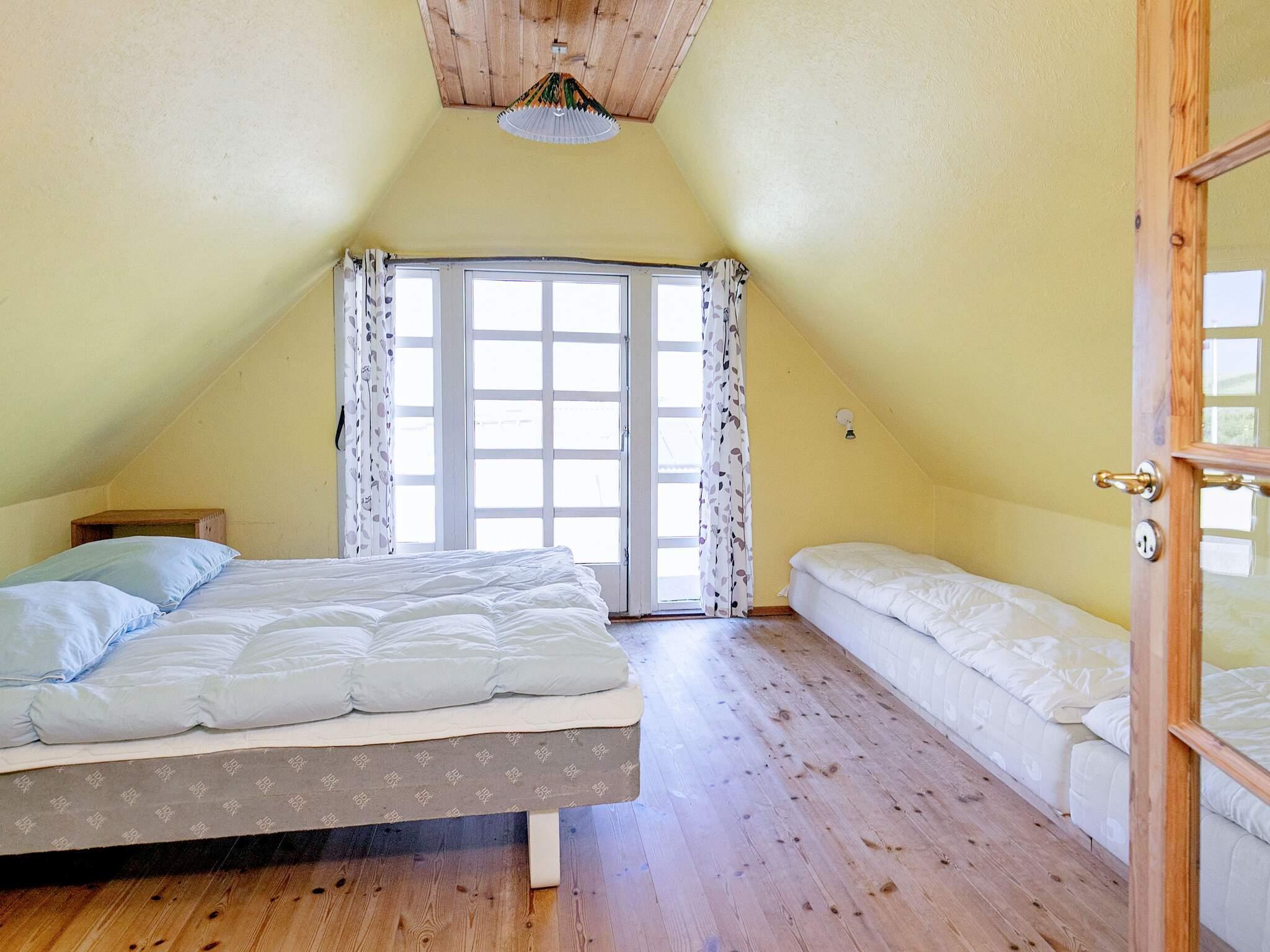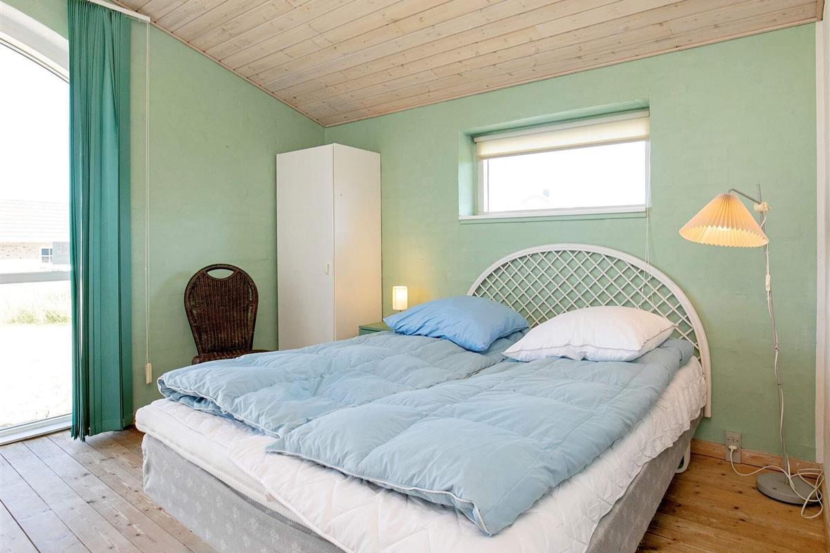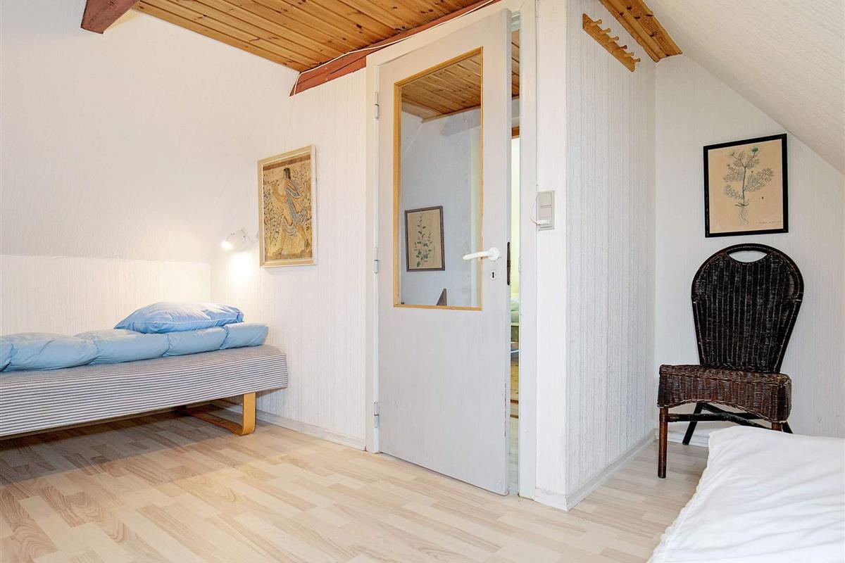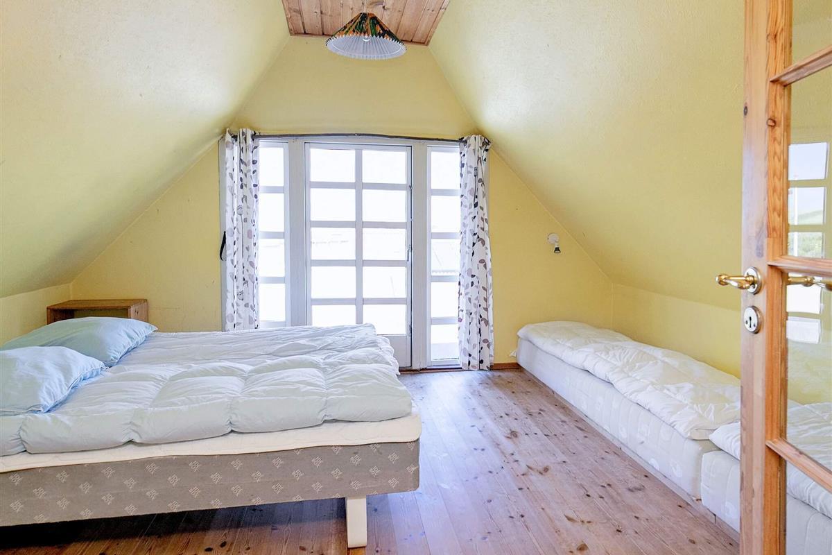 Im ersten Stock liegen drei weitere Schlafzimmer, eines davon ein Durchgangszimmer mit Einzelbett, während die beiden anderen mit jeweils einem Doppelbett ausgestattet sind und guten Ausblick in Richtung Thorsminde bieten.