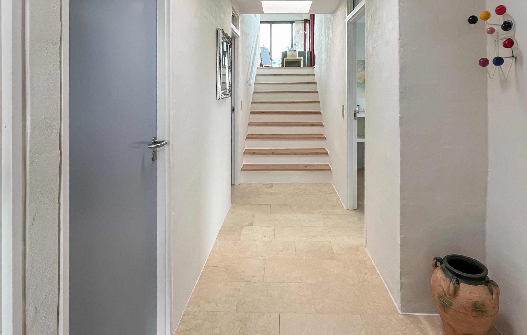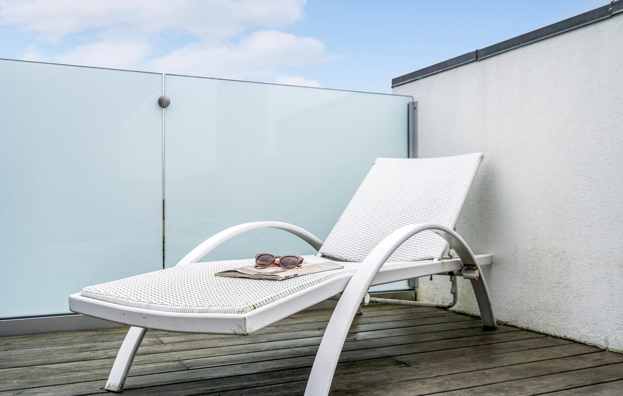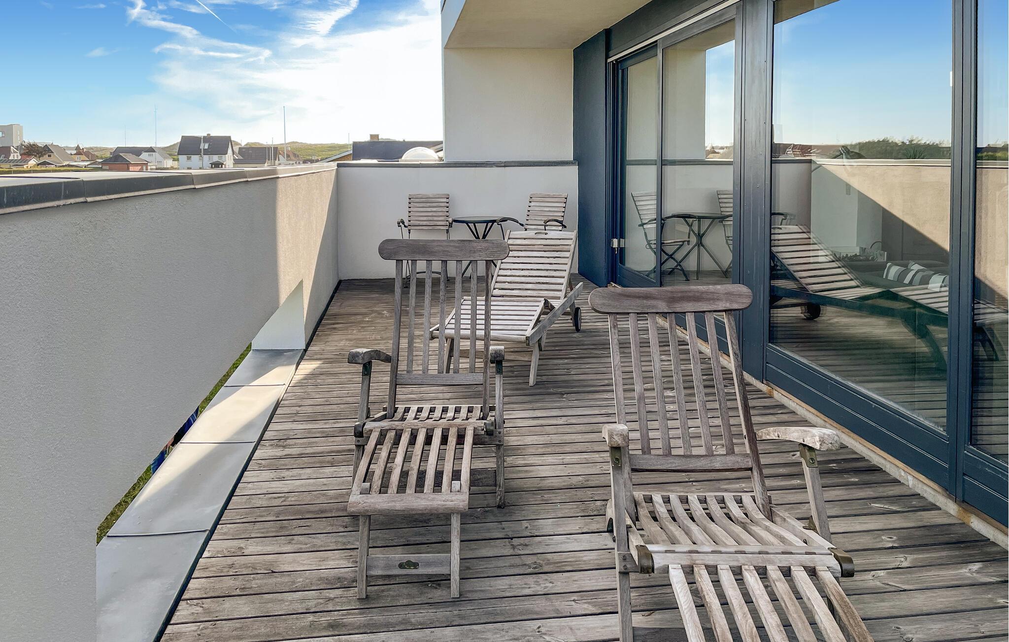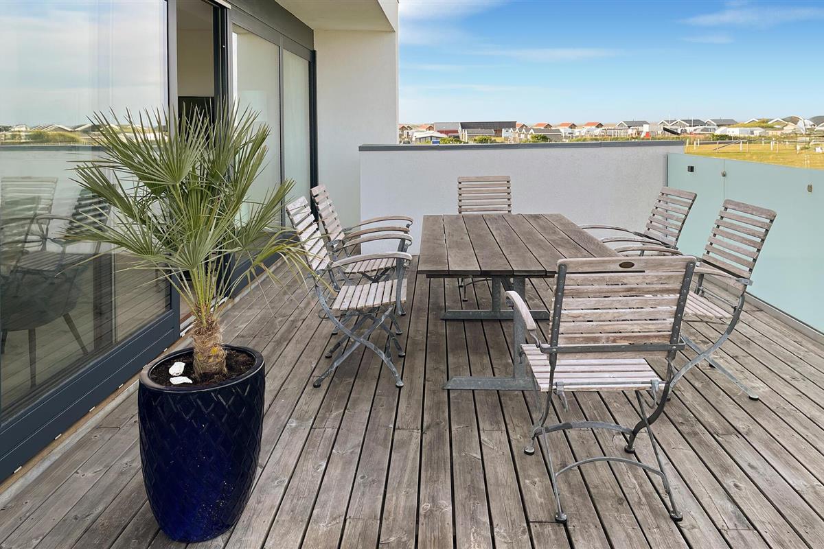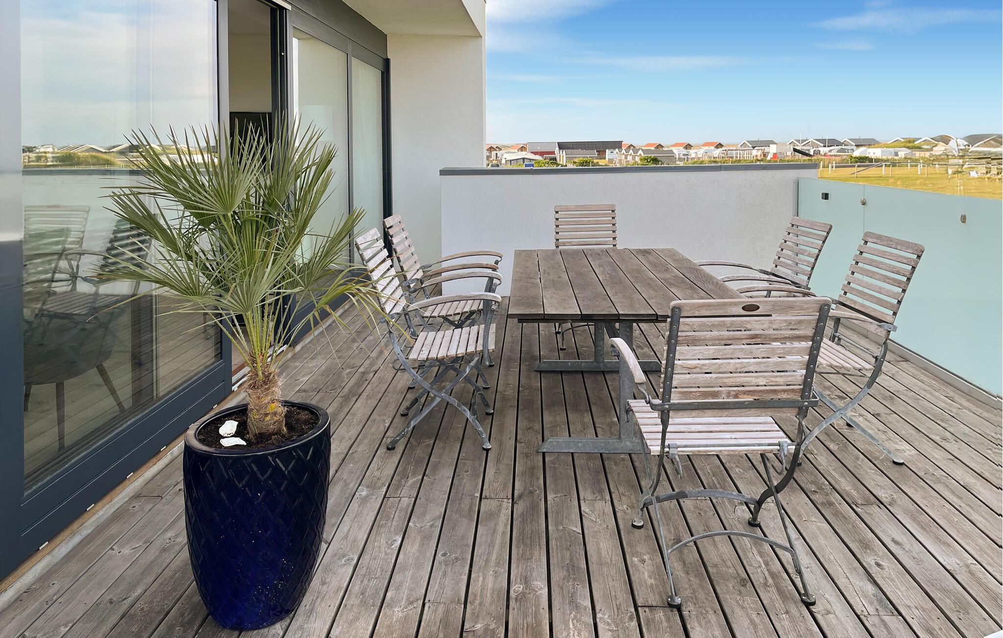 De buitenruimte van het vakantiehuis is een echt hoogtepunt. Het ruime dakterras biedt een adembenemend uitzicht op het kustlandschap en nodigt uit tot gezellige avonden met een gezamenlijke maaltijd in de frisse lucht.