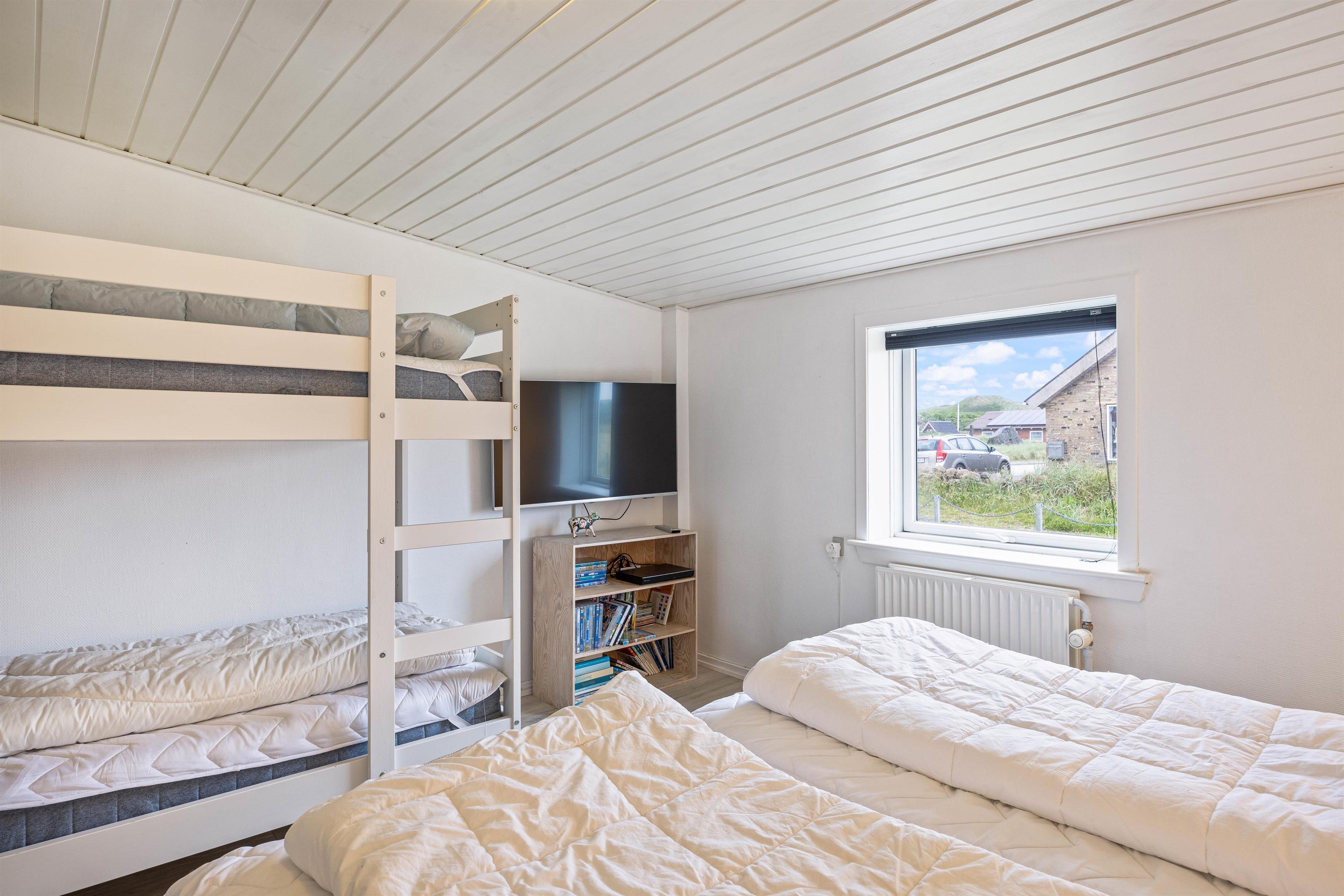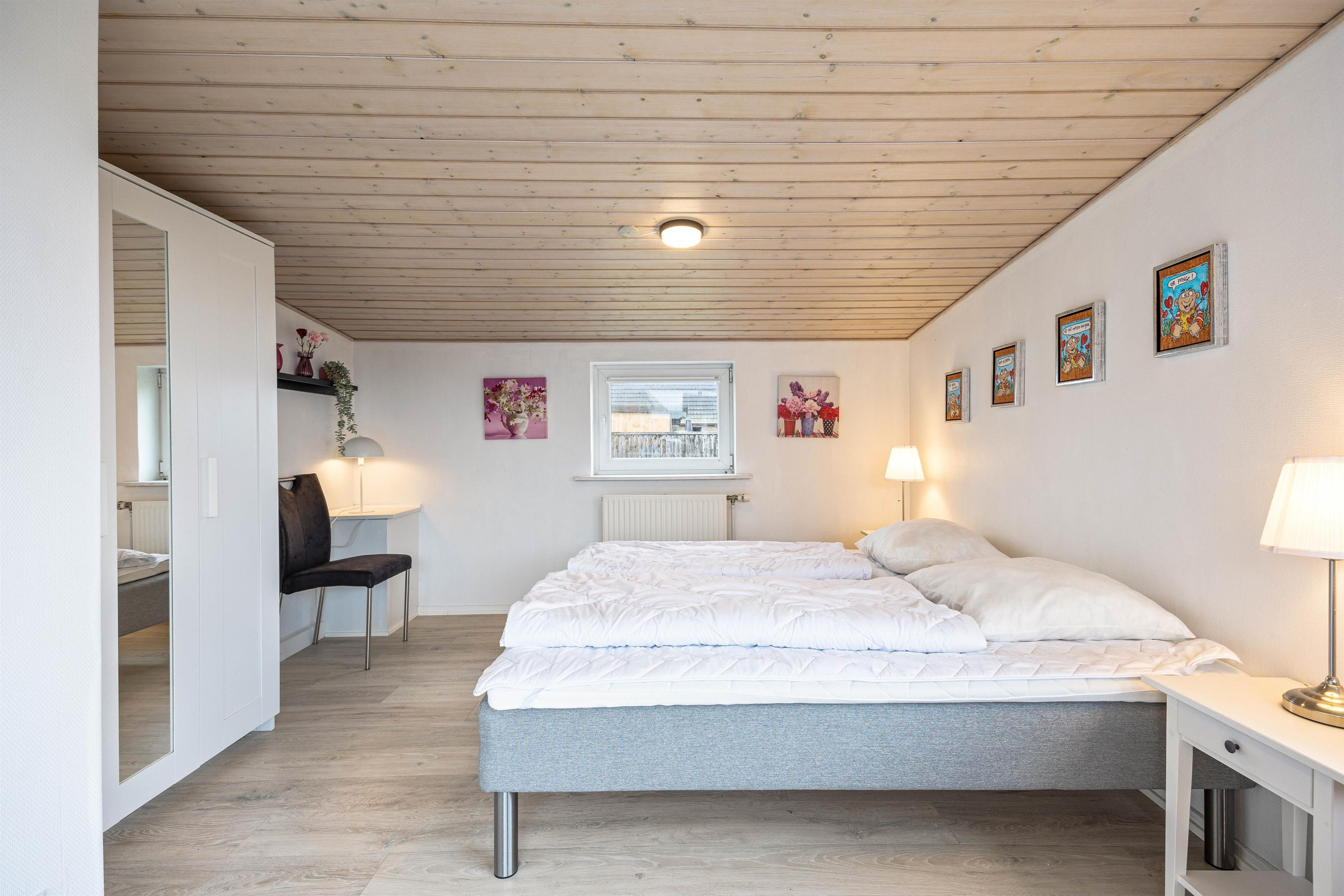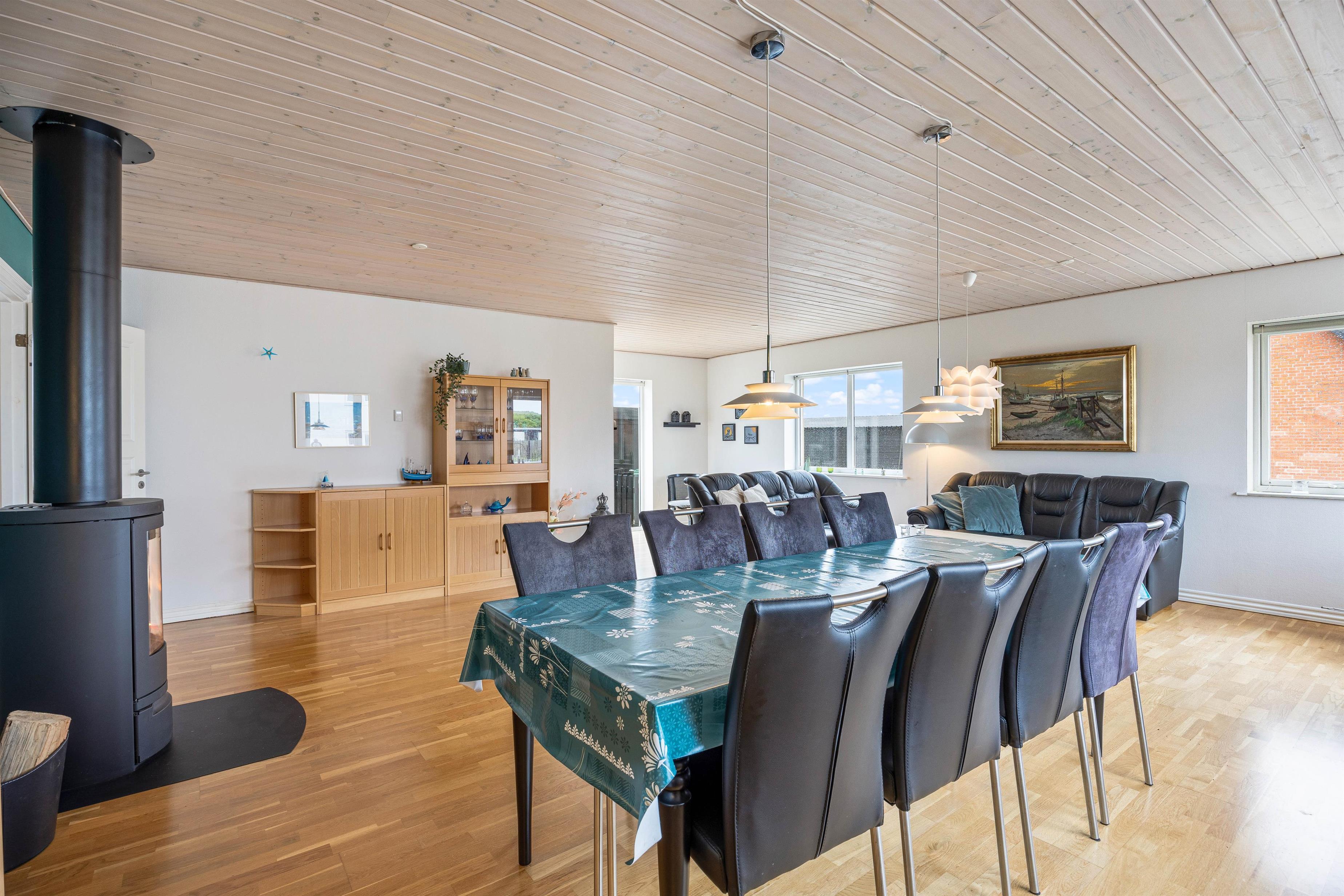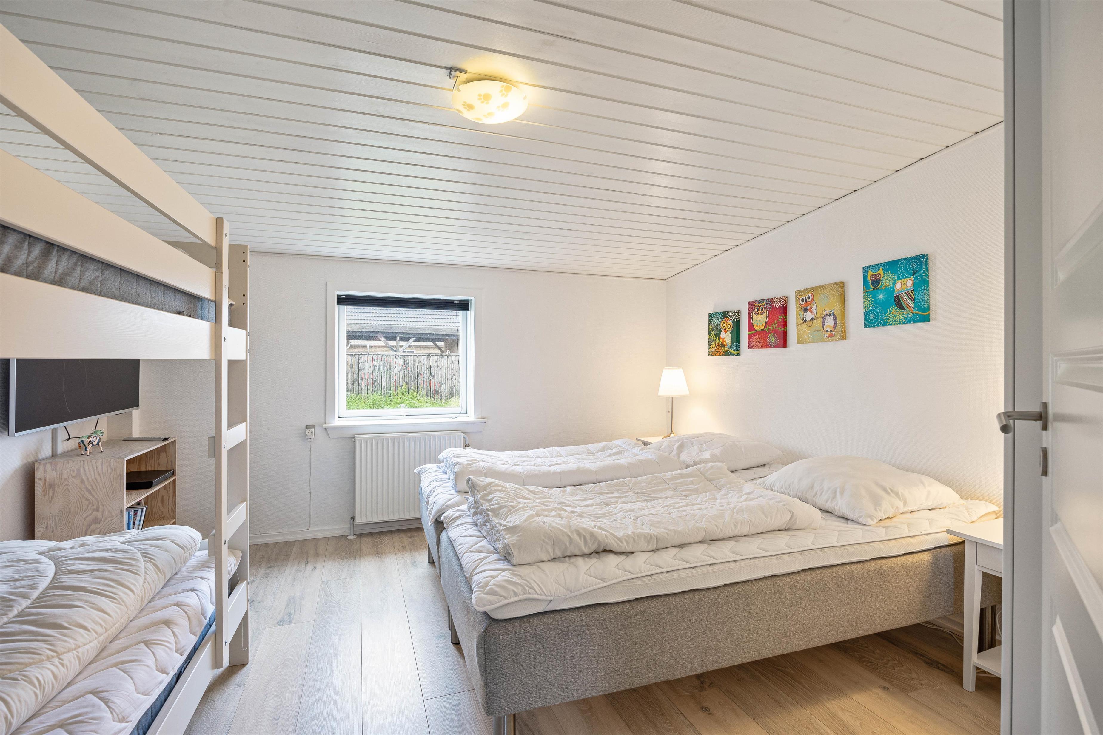 The holiday home provides everything needed for a relaxing holiday. With three bedrooms featuring three double beds and one bunk bed, everyone will find their ideal sleeping space. The welcoming wood-burning stove in the living room is perfect for relaxing evenings, while underfloor heating in the bathroom adds extra comfort. A dishwasher, washing machine and tumble dryer mean less time spent on household tasks and more time for relaxation.