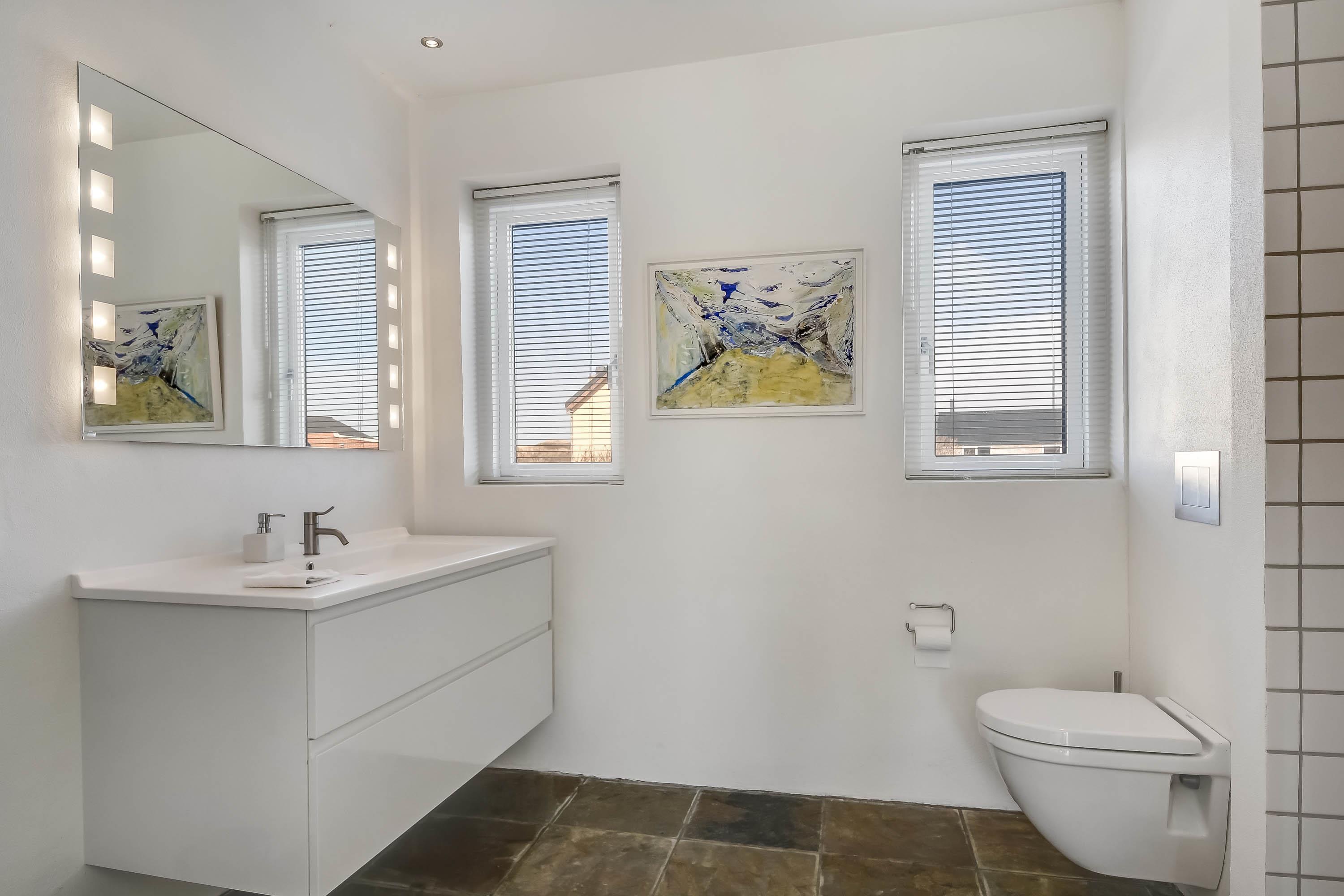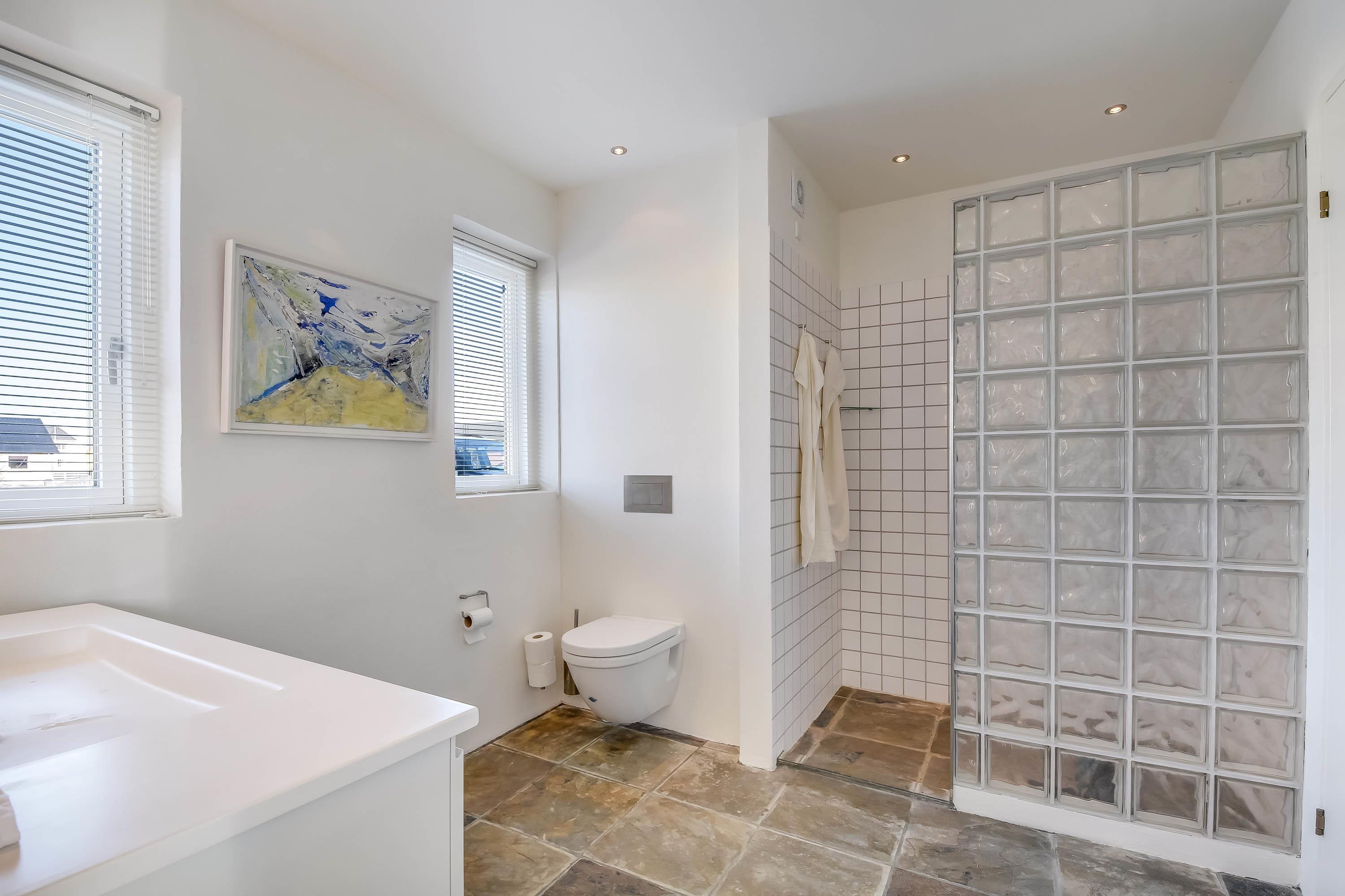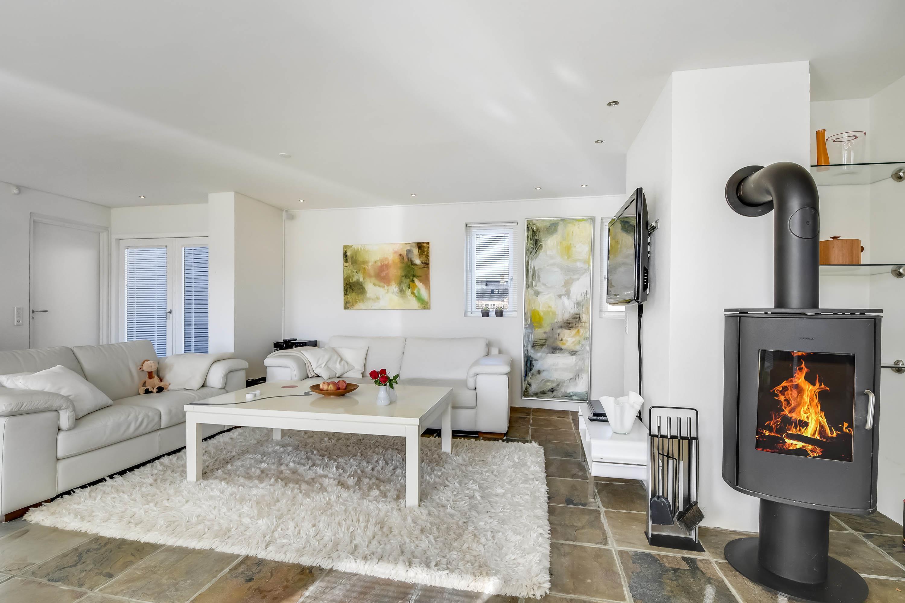 Layout: spacious entrance areawith stairs to the first fllor. Brightly furnished living room with slate floor, open white designer kitchen, dining area and beautiful wood-burning stove. A total of 3 bedrooms, all with wooden floors, good double beds and each with its own bathroom are located on the 1st floor.
