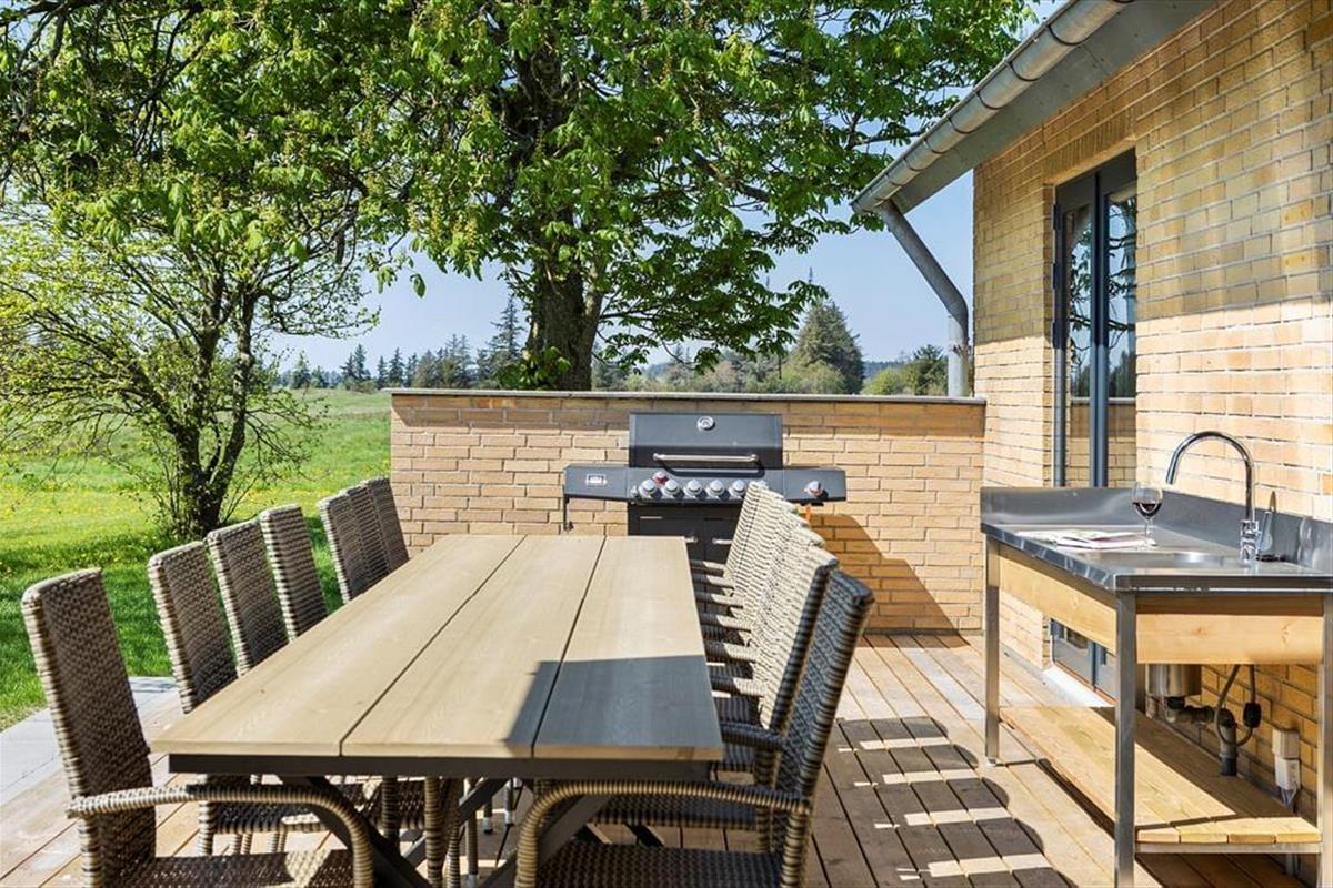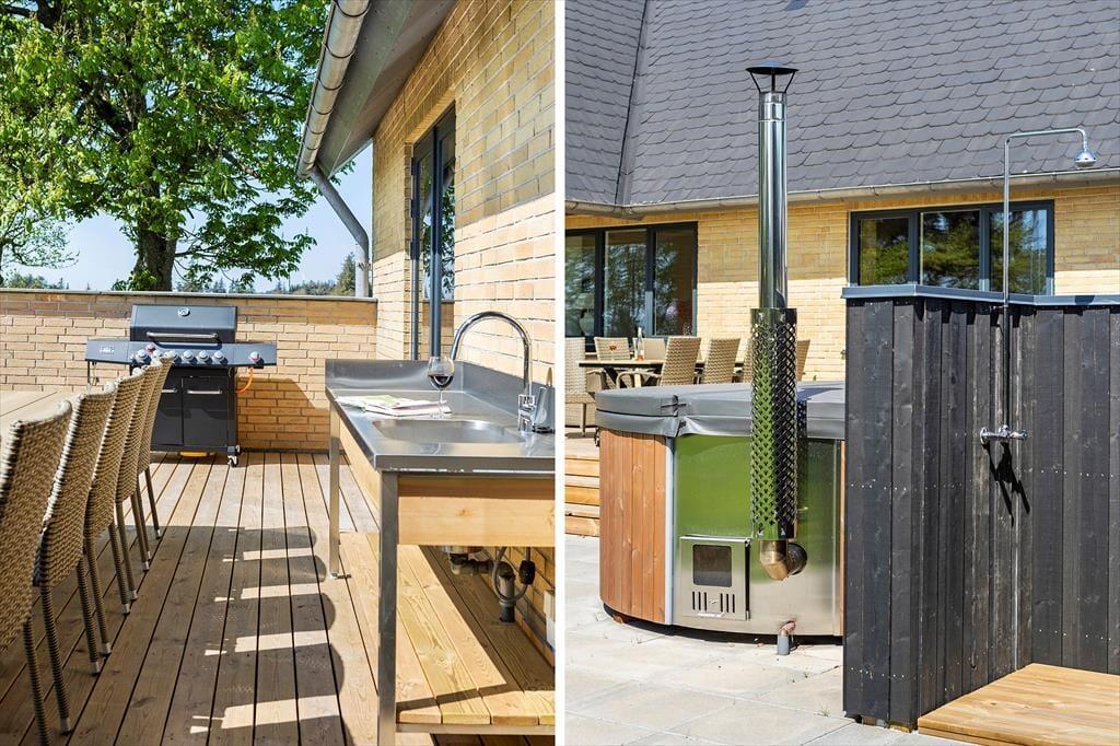 Der Wohnraum bietet Zugang zum Garten und auf die große, nach Süden gerichtete und teilweise überdachte Terrasse. Bei schönem Wetter können Sie auf der Terrasse die Mahlzeiten genießen und ein gutes Essen auf dem Grill und in der Außenküche zubereiten. In Verlängerung der Terrasse genießen Sie herrliche Stunden in der schwedischen Badetonne, die bei jedem Wetter erholsame Momente garantiert. Die Rasenfläche animiert Jung und Alt zu Ballspielen. Im Garten treffen Sie auf eine Schutzhütte zum Übernachten im Freien. Die jüngsten Urlauber dürfen sich auf eine Schaukel und eine Sandkiste freuen. Die anderen Gebäude auf dem Grundstück sind nicht Teil des Mietvertrages und daher während Ihres Aufenthalts verschlossen.