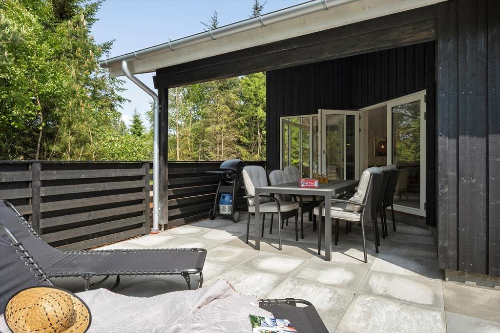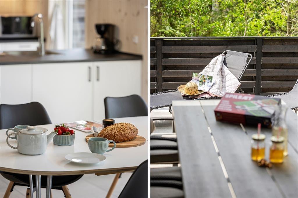 Draußen erwartet dich ein ungestörtes Naturgrundstück mit viel Ruhe, Privatsphäre und Vogelgezwitscher – der perfekte Ort, um dem Alltag zu entfliehen. Zum Haus gehören mehrere schöne Terrassenbereiche: eine kleine Terrasse mit Caféset, auf der du morgens deinen Kaffee in der Sonne genießen kannst, sowie eine größere, teilweise überdachte Terrasse mit viel Platz zum Entspannen oder für Mahlzeiten an der frischen Luft. Je nach Wetter findest du hier Sonne, Schatten oder Windschutz – und kannst die Sommertage in friedlicher Umgebung genießen.