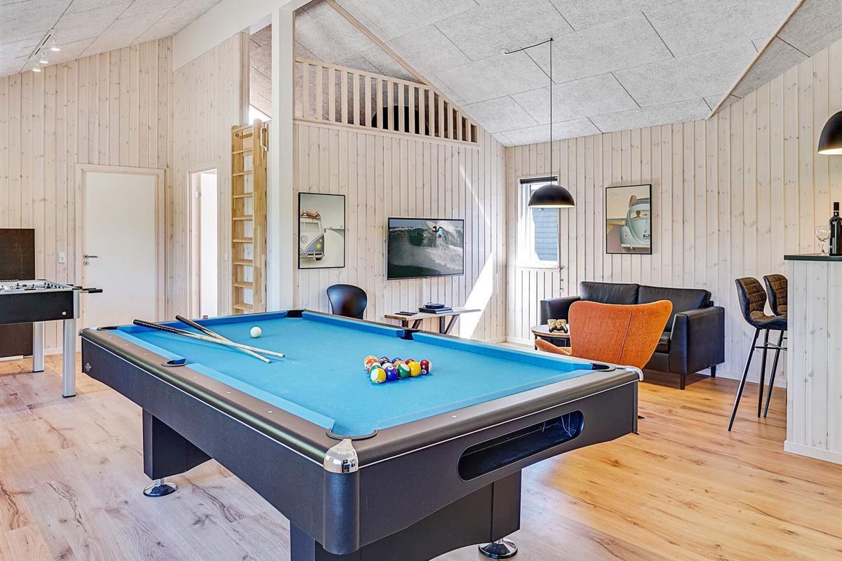Inmitten der herrlichen Küstenlandschaft bei Thorup Strand findet man dieses moderne Ferienhaus für bis zu 18 Personen, umfassend ausgestattet mit sowohl Innenpool als auch einem Whirlpool im Außenbereich. Zudem stehen im Haus verschiedene sportliche Aktivitätsangebote zur Auswahl.