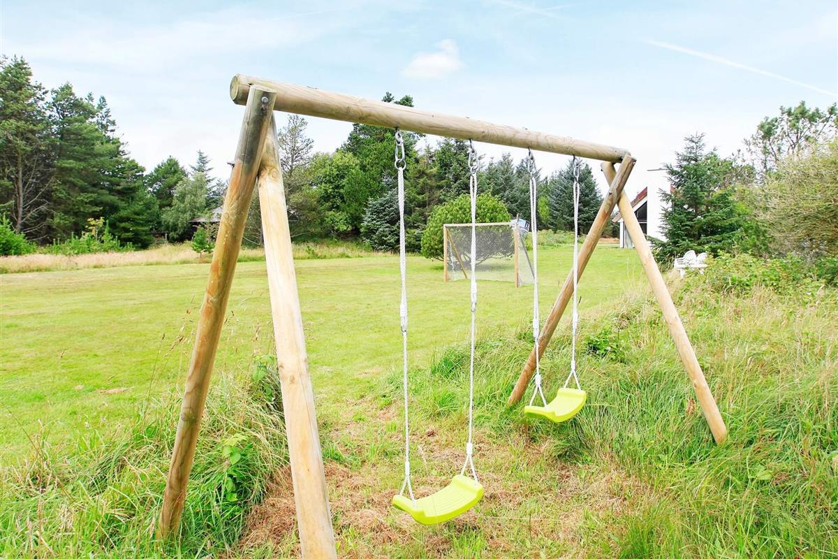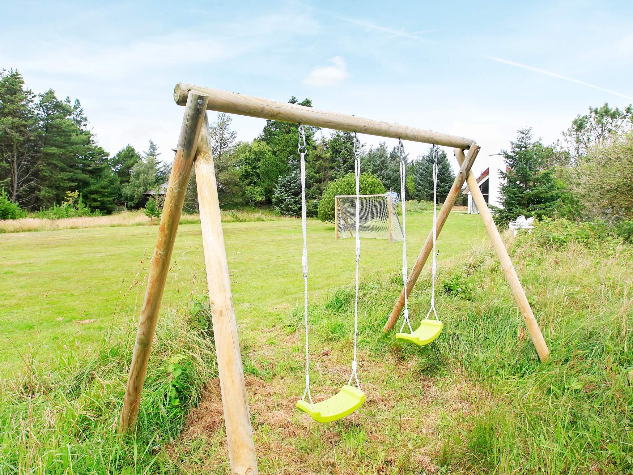 zwei Fußballtore aufgestellt sind. Außerdem Schaukelgerüst auf dem