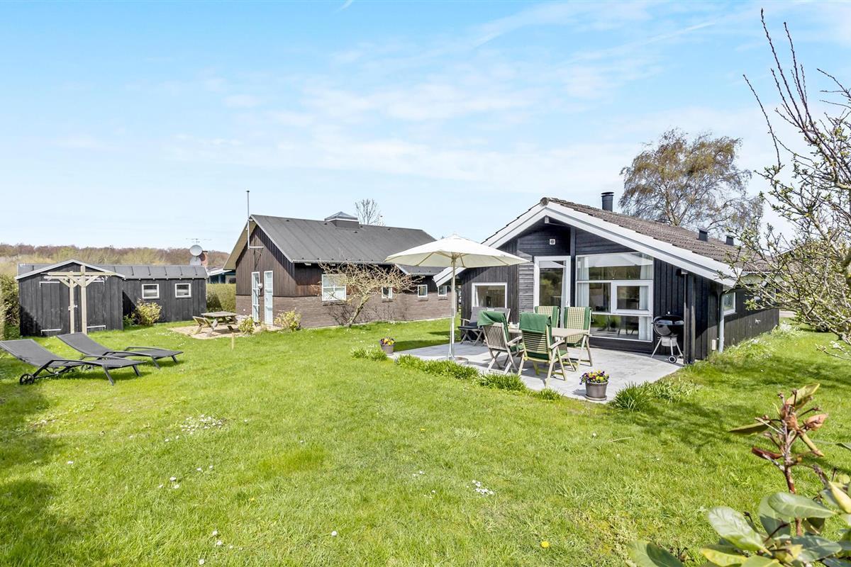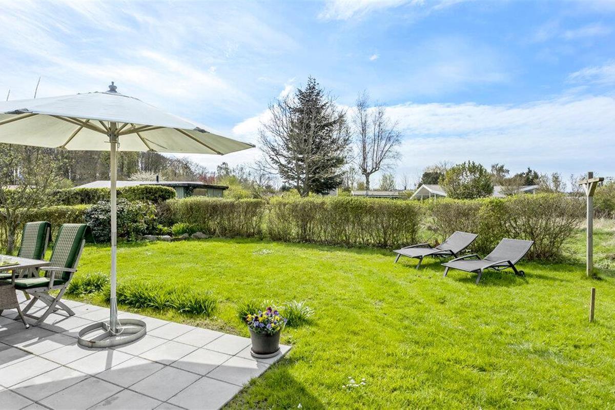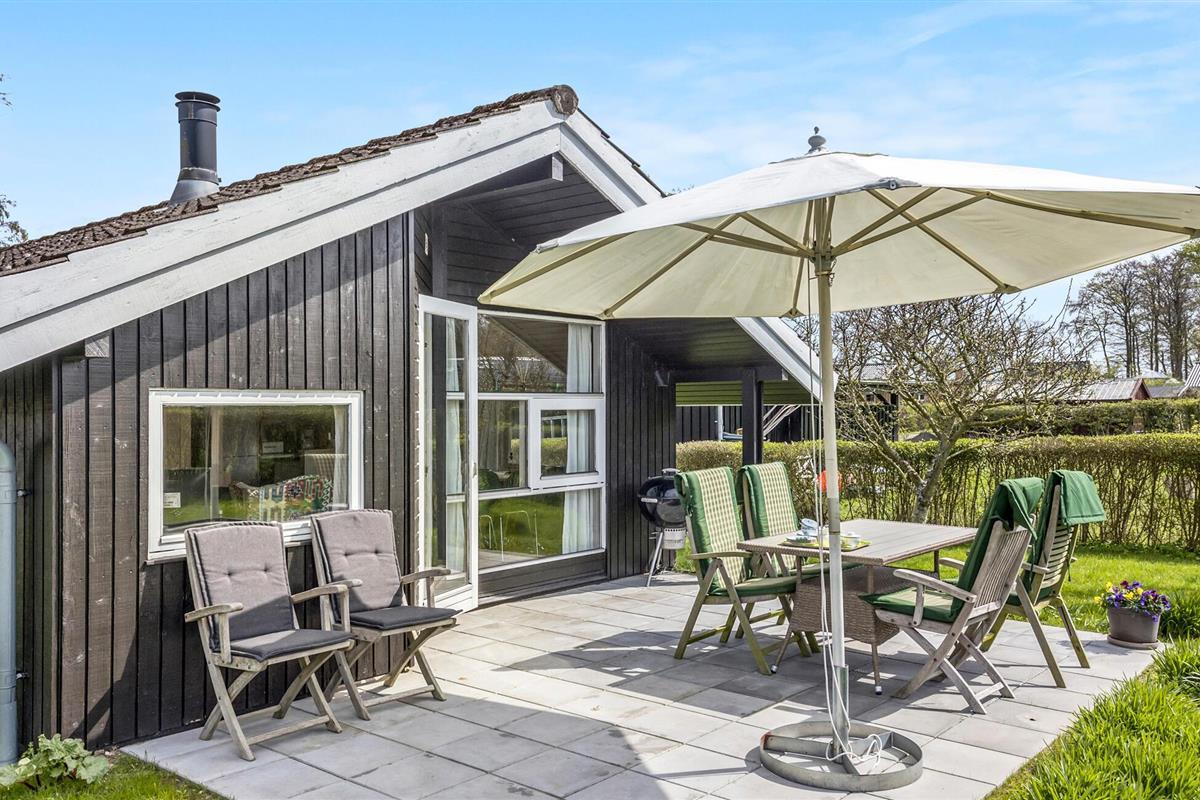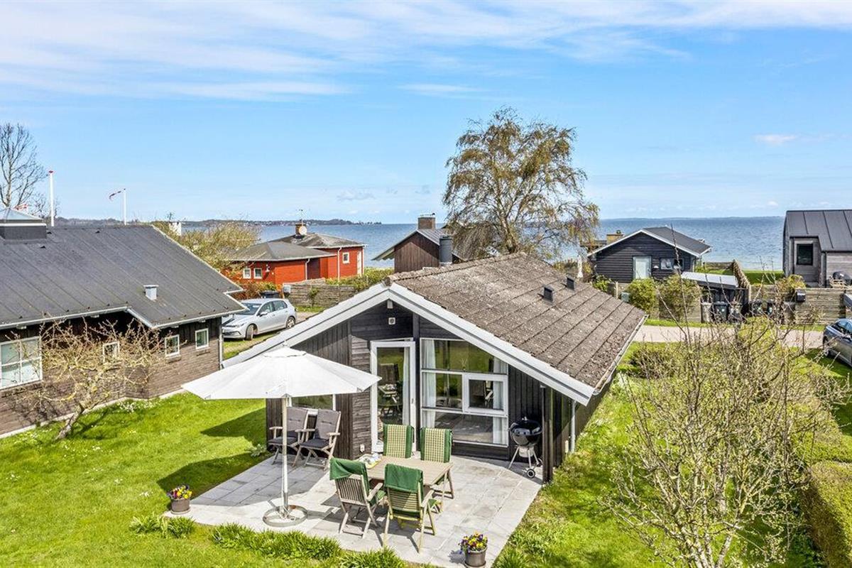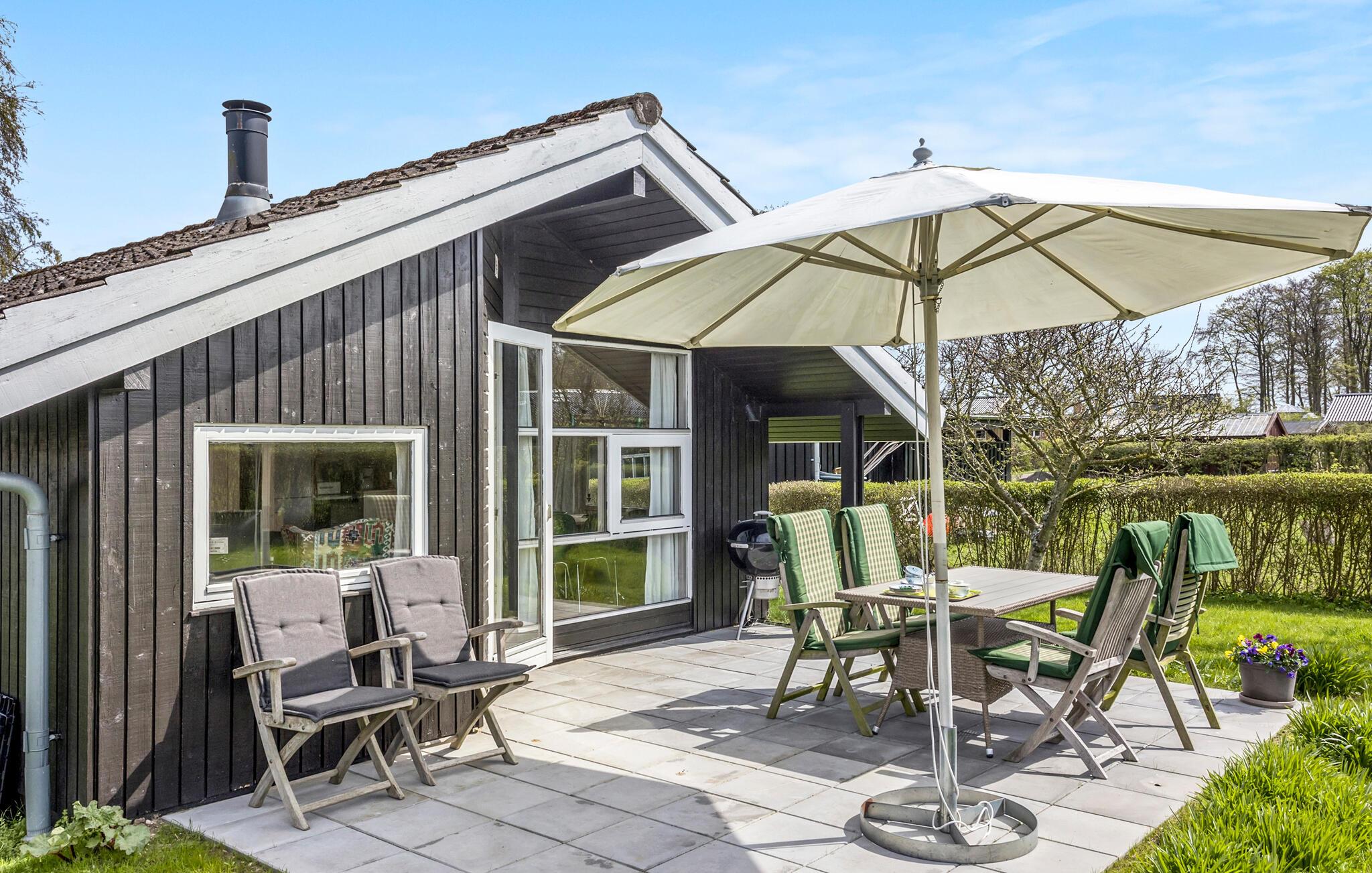 Charmant houten vakantiehuis op Thurø met terras, tuin en uitzicht op zee, perfect voor rust en ontspanning.