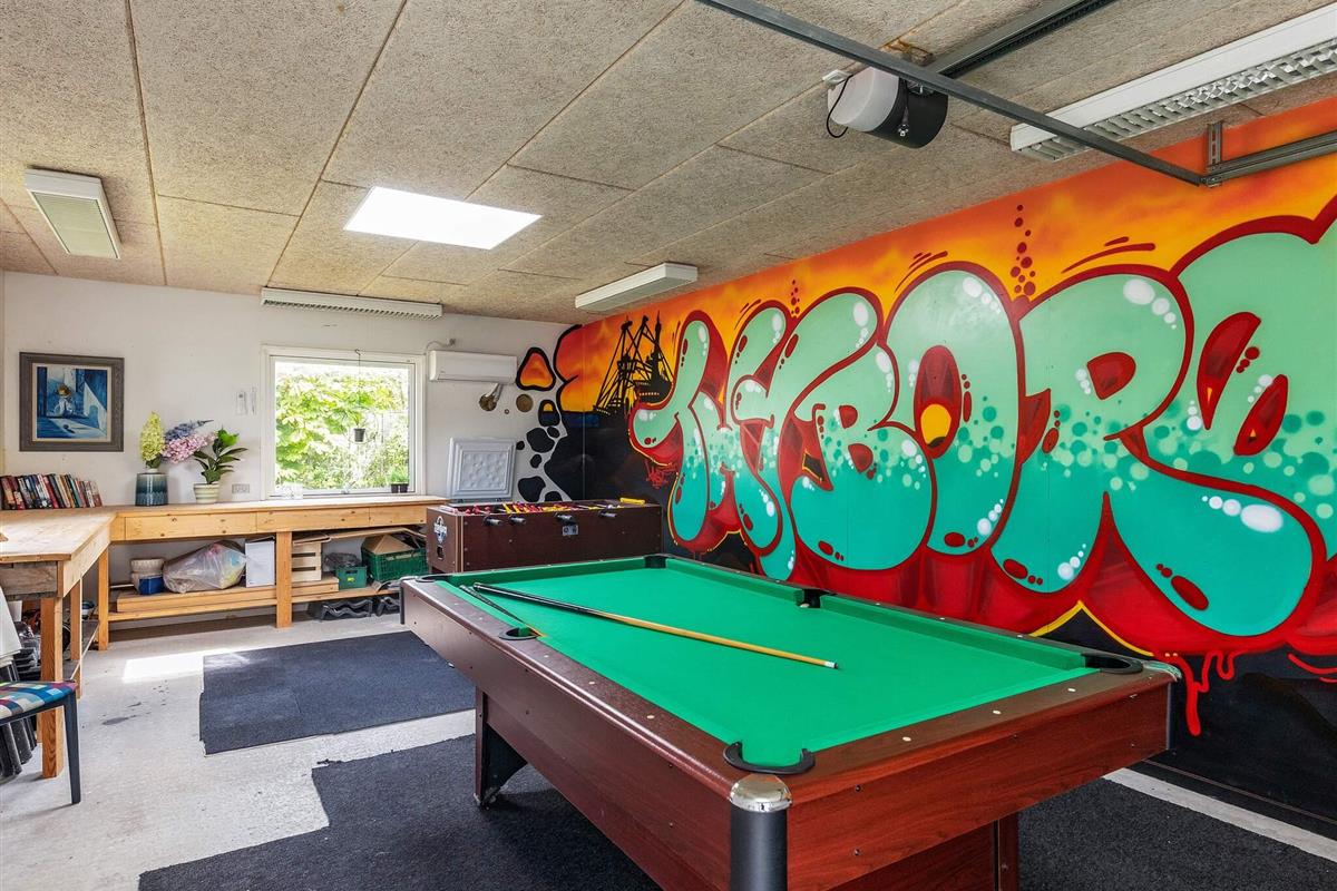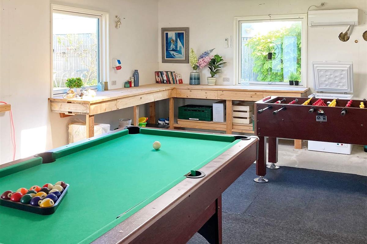 Das Ferienhaus ist gleichzeitig ein Aktivitätszentrum mit vielen Stunden Unterhaltung für Kinder und Erwachsene, darunter Billard und Tischfußball. Der Aktivitätsraum befindet sich in der 36 m³ großen Garage des Hauses mit Wärmepumpe, elektrischem Tor und Dachfenstern.