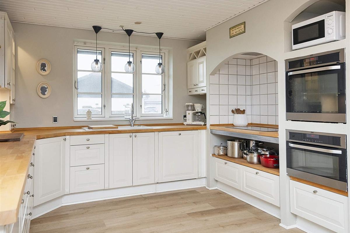 Schöne Küche mit Cerankochfeld, separatem Backofen, separatem Minibackofen, Kühlschrank, separatem Gefrierfach, Kaffeemaschine und Geschirrspüler.