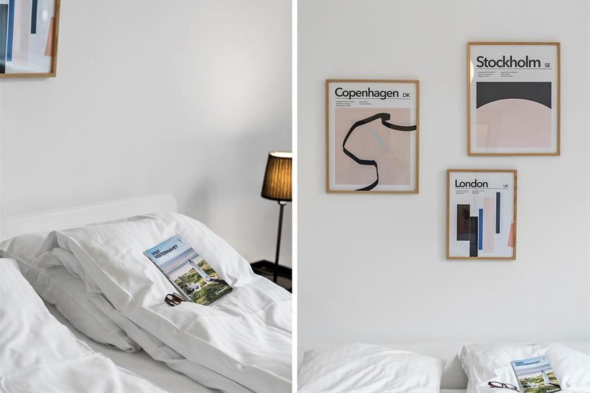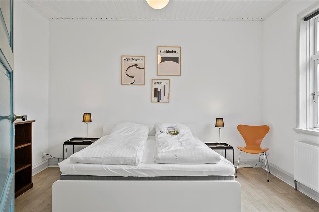 The holiday home is spread over two floors and features a bright and harmonious interior with plenty of personality. The maritime style flows throughout the rooms, where white walls, shades of blue, and small details like driftwood and boat-inspired elements create a mood that evokes sea and summer. The ground floor offers a welcoming living space, where you can easily settle into the sofa with a good book or gather around the dining table with the family. The kitchen and living room are openly connected, making it easy to spend time together – whether you’re cooking, sipping morning coffee, or playing board games. Upstairs, there’s more room to relax and recharge – whether it’s a midday nap or quiet evening time, the cozy ambiance makes it easy to feel at home.