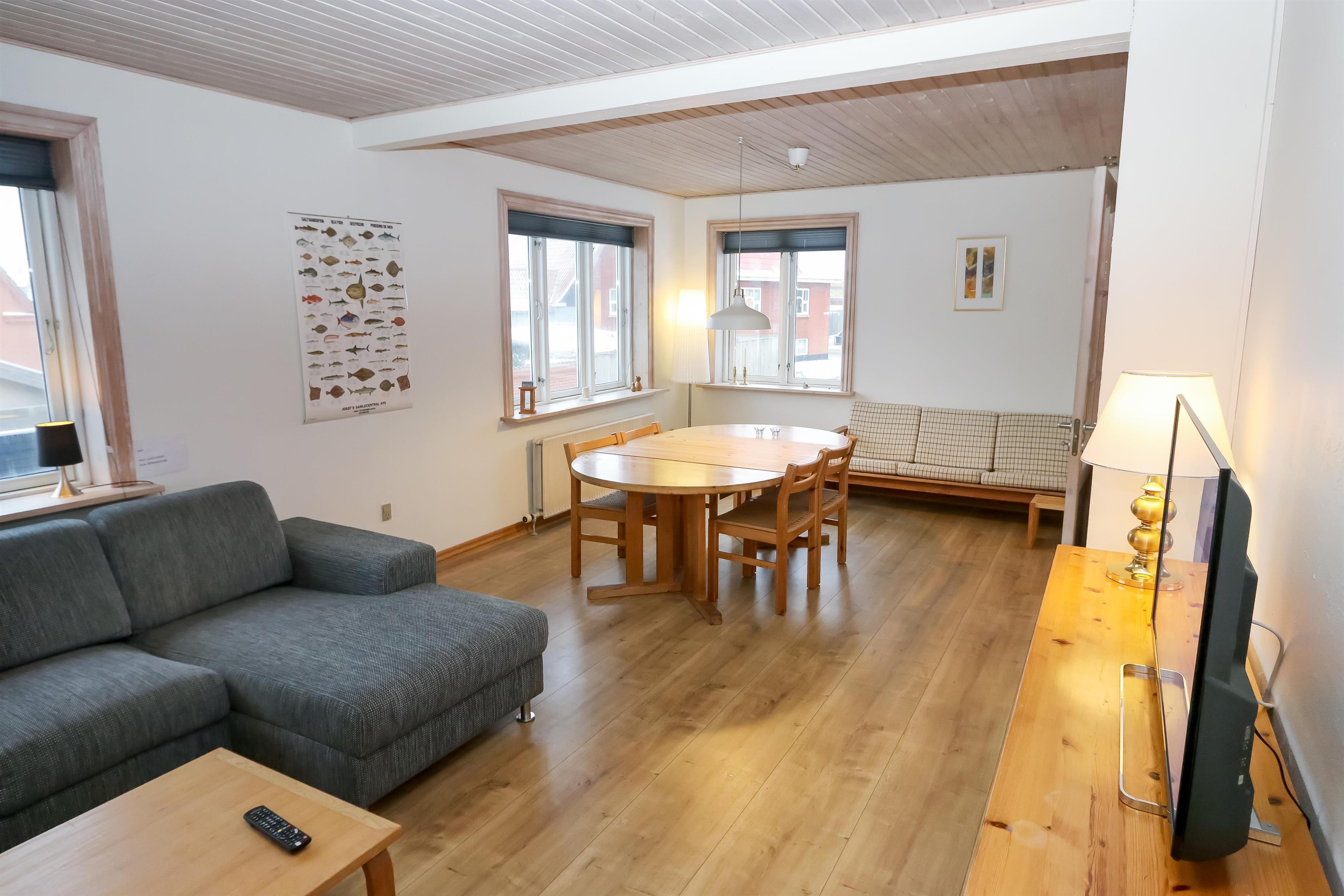 Das Haus ist an einem ruhigen Weg gelegen. Vom Keller und von der Eingangsseite haben Sie einen Zugang zu einem grossen, geschlossenen Sonnenhof mit Gartenmöbeln, Grill und Sonnenliegen. Der Sonnenhof ist ganz geschlossen mit Fliesen und perfekt für Kinder, Hunde und Erwachene, die einen eingezäunten Hof möchten. Im Sonnenhof gibt es einen Sandkasten und ein kleines Gartenhaus mit z.B. Sitzmöglichkeiten, Bob und Dartspiel. Hier können Sie viele Stunden verbringen. Sie müssen die Gartenmöbeln nur zur Sonne ausrichten, um Sie zu geniessen. Sie können hier einen schönen Grillabend machen und im Hintergrund die Geräusche der Wellen geniessen. In Thyborøn können Sie die Jyllandsakvarium, Kystcenter und Seawar Museum besuchen. Sie können aber auch schön Essen gehen, in eins der Restaurants in Thyborøn oder Sie kaufen frischen Fisch und geniessen ihn zu Hause im Ferienhaus. Besuchen Sie den schönen Strand in Thyborøn. Hier können Sie lange Spaziergänge machen oder bloß in den Dünen liegen und die frische Luft und die Geräusche des Meeres geniessen. Das Ganze ist möglich, nur 1000 m vom Haus entfernt. Ein ganz gemütliches Haus, welches schön eingerichtet ist.