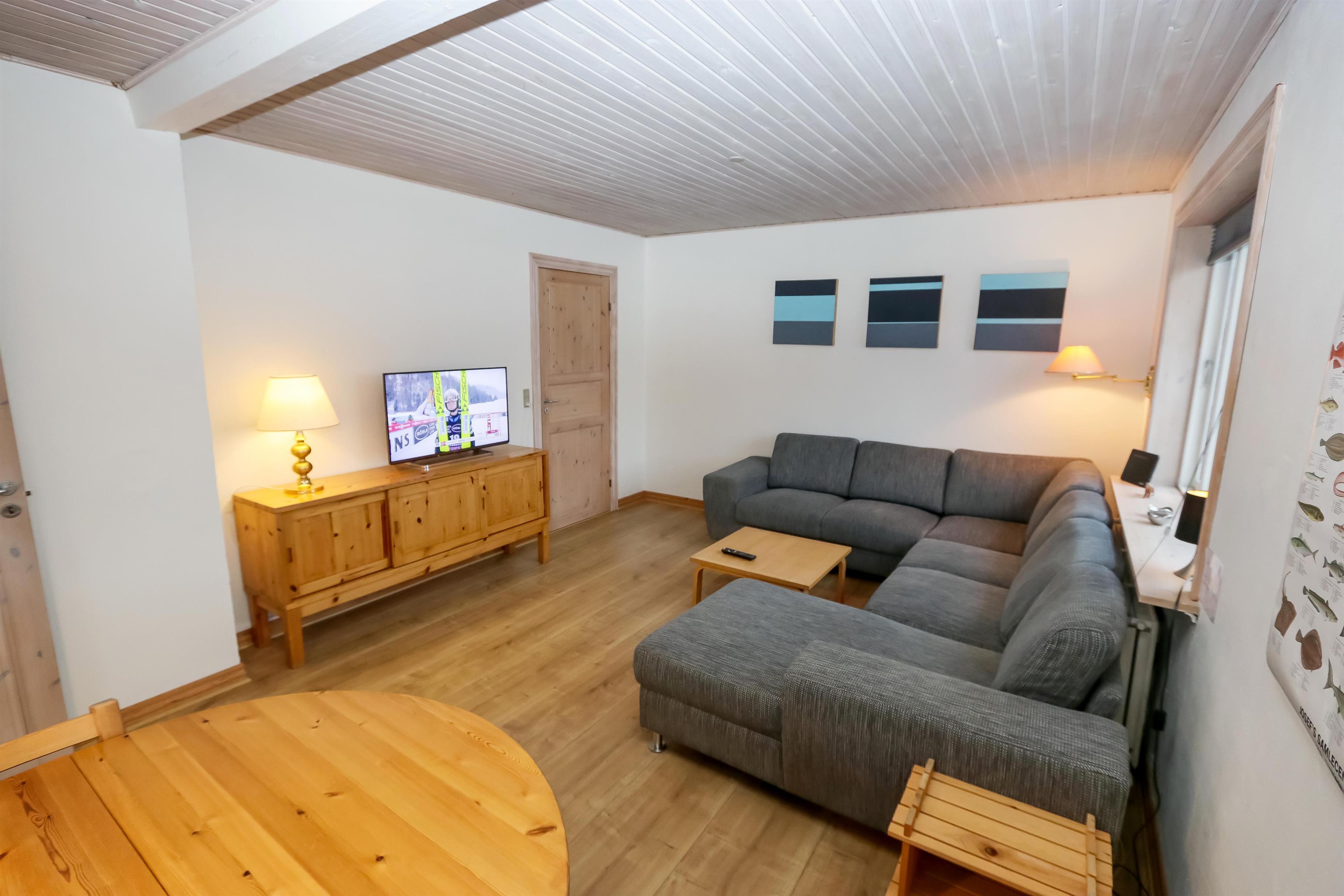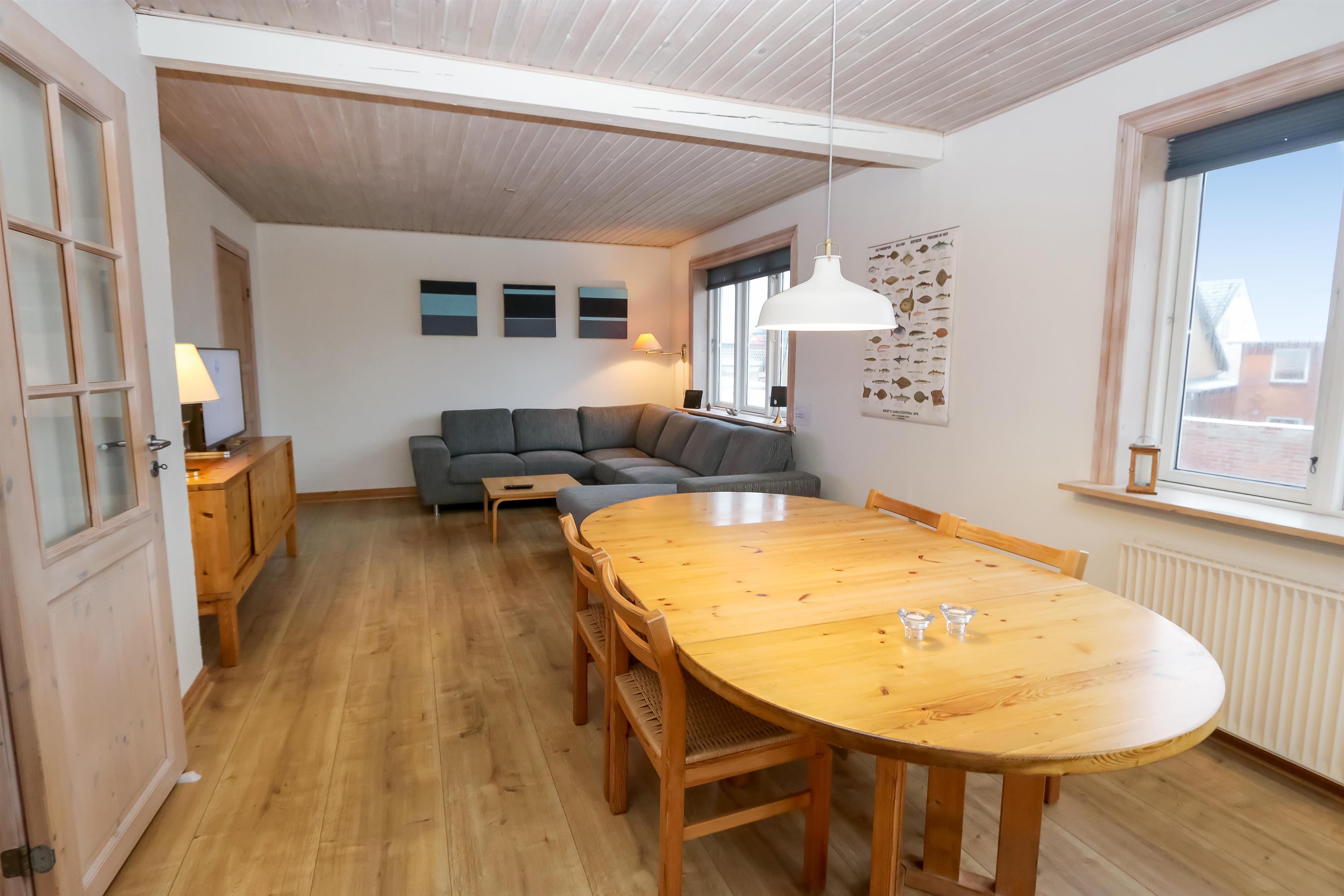 Kleiner Flur mit Zutritt zu einem kleinen Badezimmer mit Toilette, Dusche und Waschbecken. Schöne neuere Küche mit Geschirrspüler, Cerandfeld, eingebautem Ofen, Mikrowelle, Kühlschrank mit Gefrierfach und schönem Blick zur den hohen Dünen. Neu renovierter Wohnraum mit 2 Sitzecken. Die eine ist mit Ledermöbeln und die andere mit einer schönen neuen Polstercouch ausgestattet. Im Wohnraum gibt es einen Fernseher mit dänischen und deutschen Programmen sowie die Möglichkeit bietet, TV / Radio / Apps zu streamen. Wenn Sie ein Mobiltelefon oder ein anderes Gerät bei sich haben, können Sie streamen, wofür Sie ein Abonnement haben. , DVD, Stereoanlage mit Radio und CD-Spieler. Von der Küche geht die Treppe zum neu renovierten Keller mit 2 Schlafräumen: 1DB + 1B, 1 DB, Badezimmer mit Toilette, Waschbecken, Dusche und Fussbodenheizung. Schöner Flur mit Waschmaschine, Trockner und Abstellplatz. Kinderbett und Kinderstuhl für die Kinder. Nichtraucher-Haus. 1 Haustier ist erlaubt.
